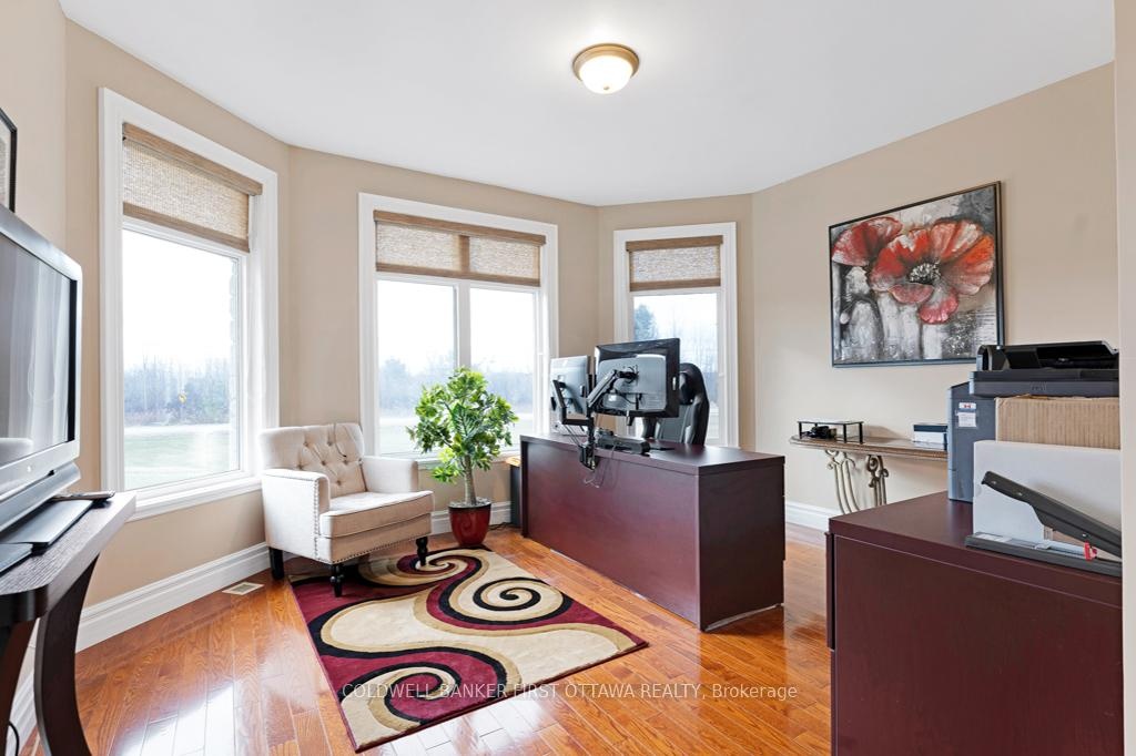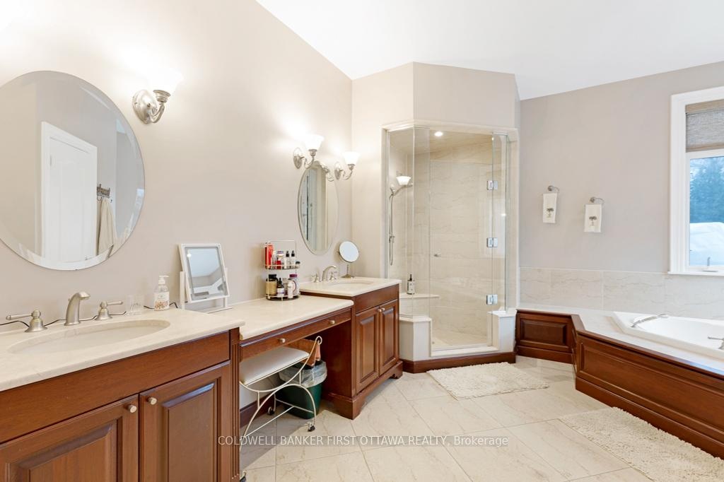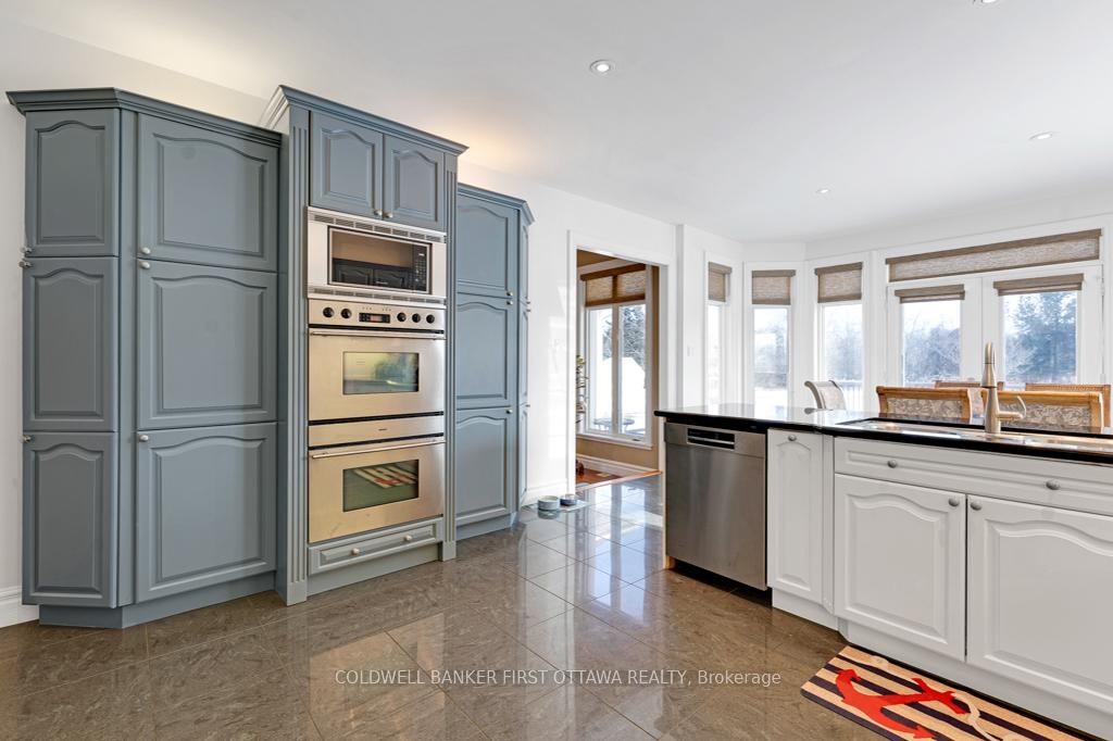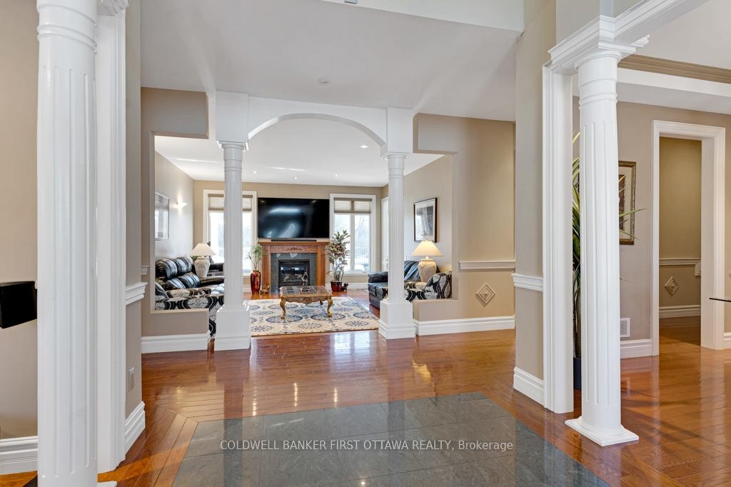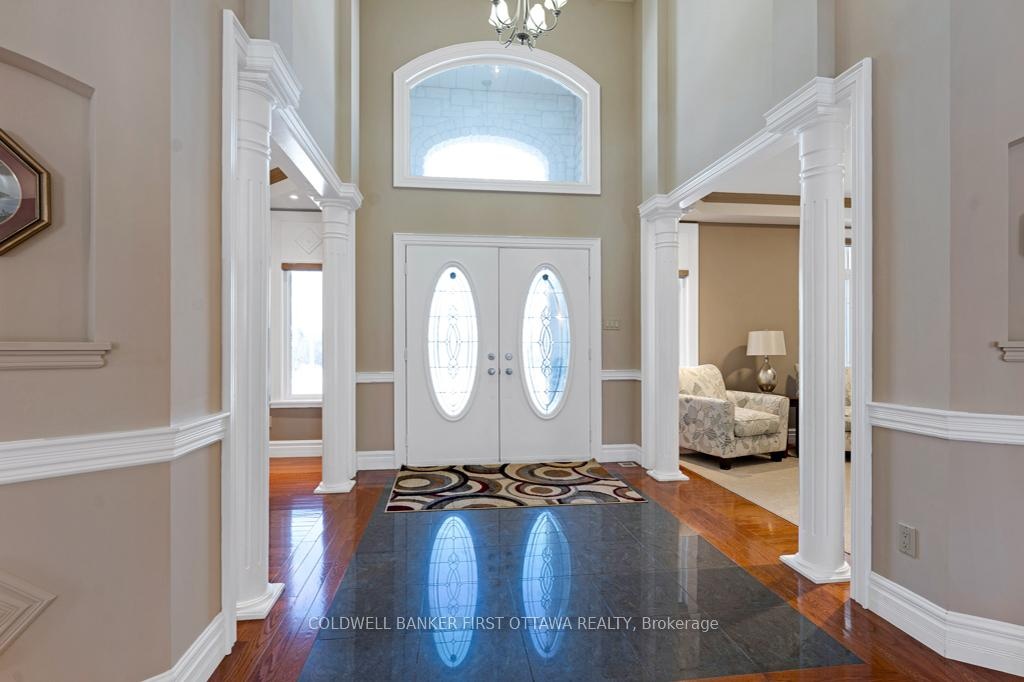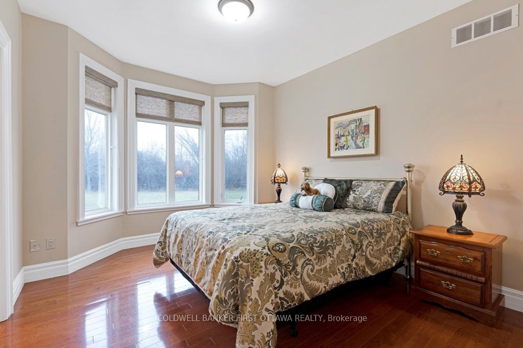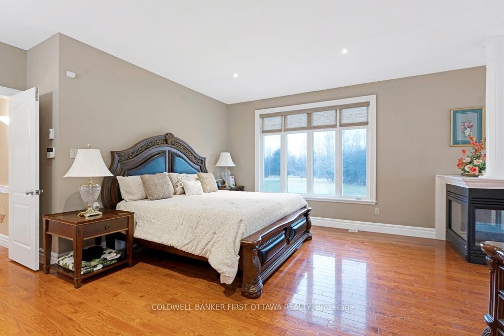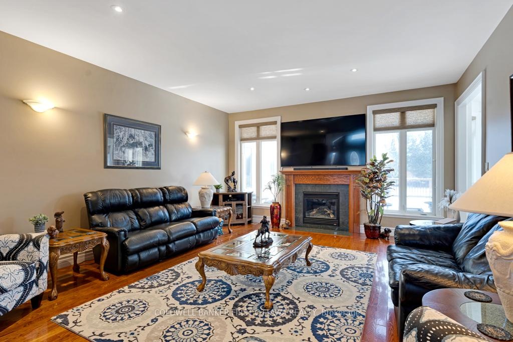 Exquisitely elegant bungalow with attached three-car heated garage, on 2.4 landscaped acres in family-friendly country subdivision neighbourhood. You'll love how the light cascades thru this 3+1 bedroom, 3.5 bathroom home featuring impeccable attention to detail, while offering warm family comforts. Bordered by perennials, the interlock front walkway leads you to impressive pillared porch. The grand foyer's soaring ceiling creates a great sense of space. To left of foyer is inviting den with attractive tray ceiling. To right, is formal entertainment-sized dining room. Architectural features include dramatic arched pillars framing the open living room with propane fireplace flanked by tall windows. Sparkling white kitchen designed with superior style and gourmet function. Kitchen's wall of cupboards has two built-in oven plus microwave; the granite peninsula has sink and prep area. Open to the kitchen is bright sunny dinette in a windowed alcove, with garden doors to expansive deck. The primary suite is a relaxing respite with three-sided propane fireplace connecting sleeping area to your own private sitting nook featuring wall of windows and garden door to deck. The primary suite also has two walk-in closets and spa ensuite with two vanities, glass shower and soaker tub. Two more large bedrooms, each with wall of windows. These two bedrooms share 4-piece Jack & Jill bathroom. Main floor powder room. Lower level has 8' high ceilings and radiant in-floor heating flowing through the generous-sized family room, office, fourth bedroom and 3-pc bathroom. Lower level also has convenient yard door to outside. The attached 3-car garage includes new 2024 overhead propane heater and extra large garage doors. Generator panel and elaborate security system. Located on paved municipal maintained road with curbside garbage pickup and school bus route. Just 3 min drive to picturesque Rideau Ferry with public boat launches on both Upper and Lower Rideau Lakes. 10 mins to Perth.