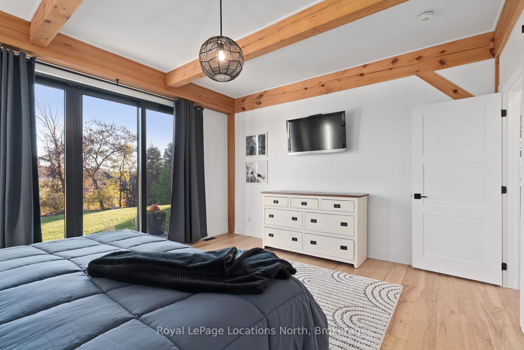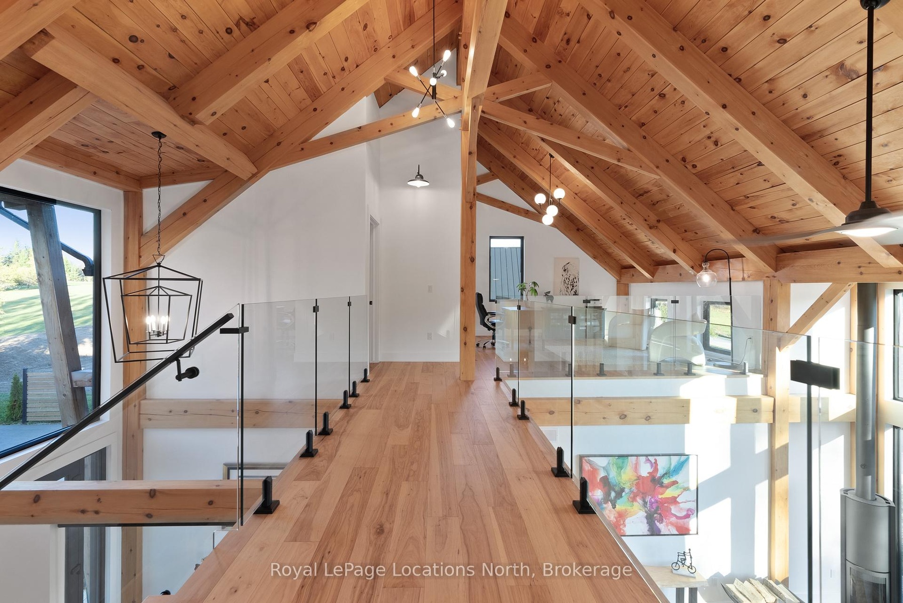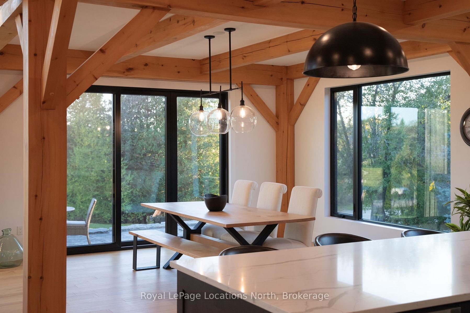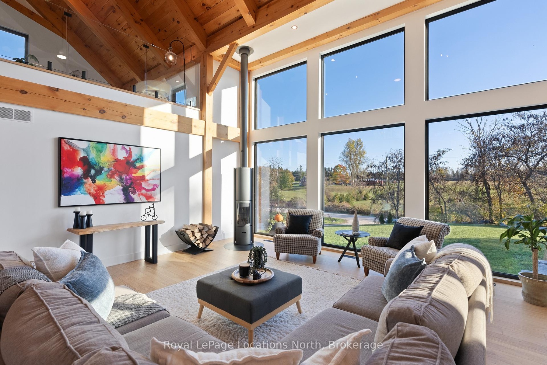 Welcome to 113 Slabtown Rd W, a modern timber frame home in one of the area's most charming and quietly sought-after enclaves. Thoughtfully designed and built with timeless craftsmanship, this nearly 5,000 sq. ft. home balances luxury with an inviting warmth that makes everyday living feel relaxed and comfortable. Soaring ceilings, exposed beams, and expansive windows create a sense of openness while drawing in natural light throughout the day. The main living spaces flow seamlessly-perfect for gathering with family, hosting friends, or simply settling into a slower pace. The kitchen, living, and dining areas are grounded by natural materials and thoughtful details, while multiple walkouts connect you effortlessly to the outdoors.The private primary suite offers a calming retreat with a serene ensuite. The main floor is complemented with an upstairs with 2 additional bedrooms and flexible spaces suited to work, hobbies, or guests. The fully finished lower level provides additional room for living and entertaining, complete with a large mudroom, an additional bedroom and direct garage access for practical day-to-day living.There is also a bonus room that would make a great sauna or ski tuning room. Outside, the setting is something truly special. Slabtown is a small, welcoming community-rural in feel, yet just a 5-minute drive to Thornbury's highly desirable community school, shops, dining, marina, and conveniences. Step outside your door to the Slabtown Dam for a summer swim or paddle the Beaver River at sunset. Ski clubs, golf, hiking trails, and Georgian Bay are all close by, making four-season adventure part of your rhythm.This is a home where mornings are slow, evenings gather everyone at the table, and the natural beauty of the Blue Mountains shapes the way you live. Warm, grounded, and quietly luxurious- 113 Slabtown Rd W offers a lifestyle that feels both connected and comfortably at ease.