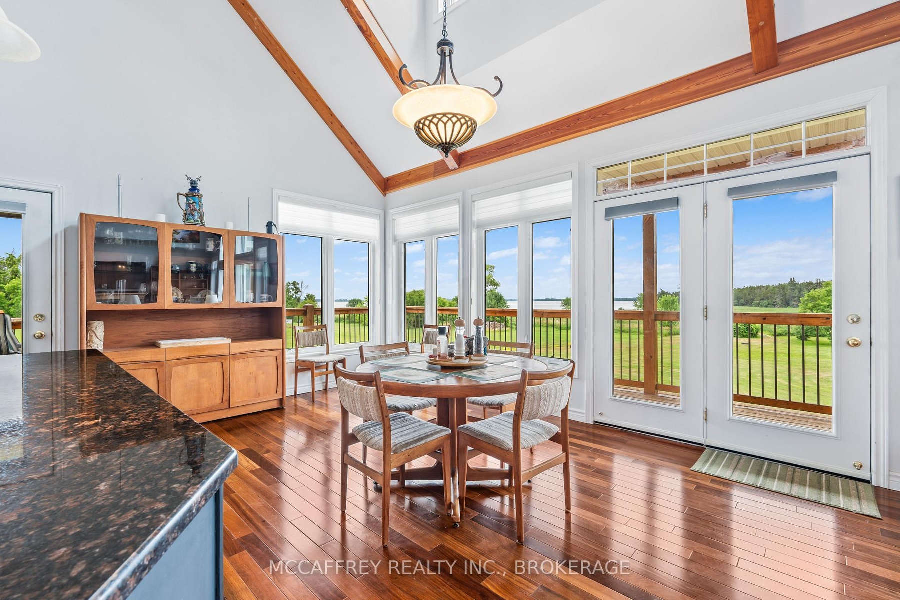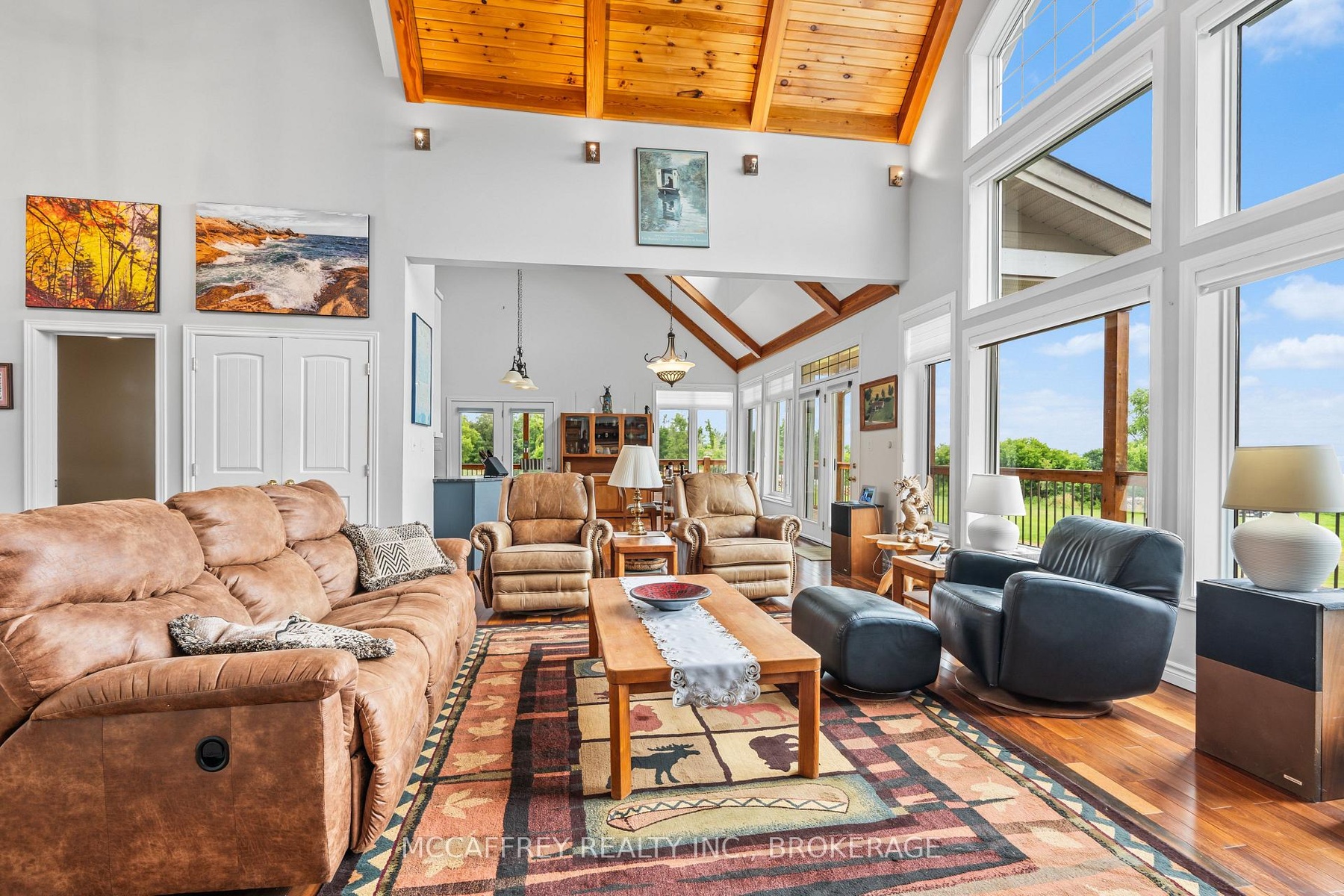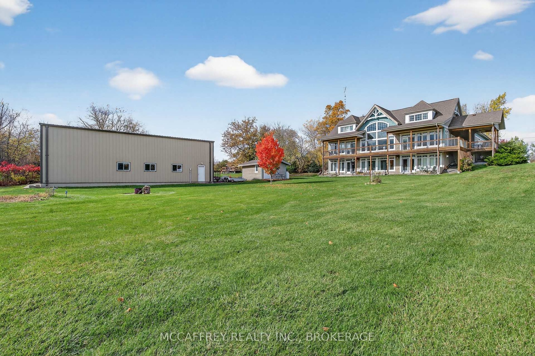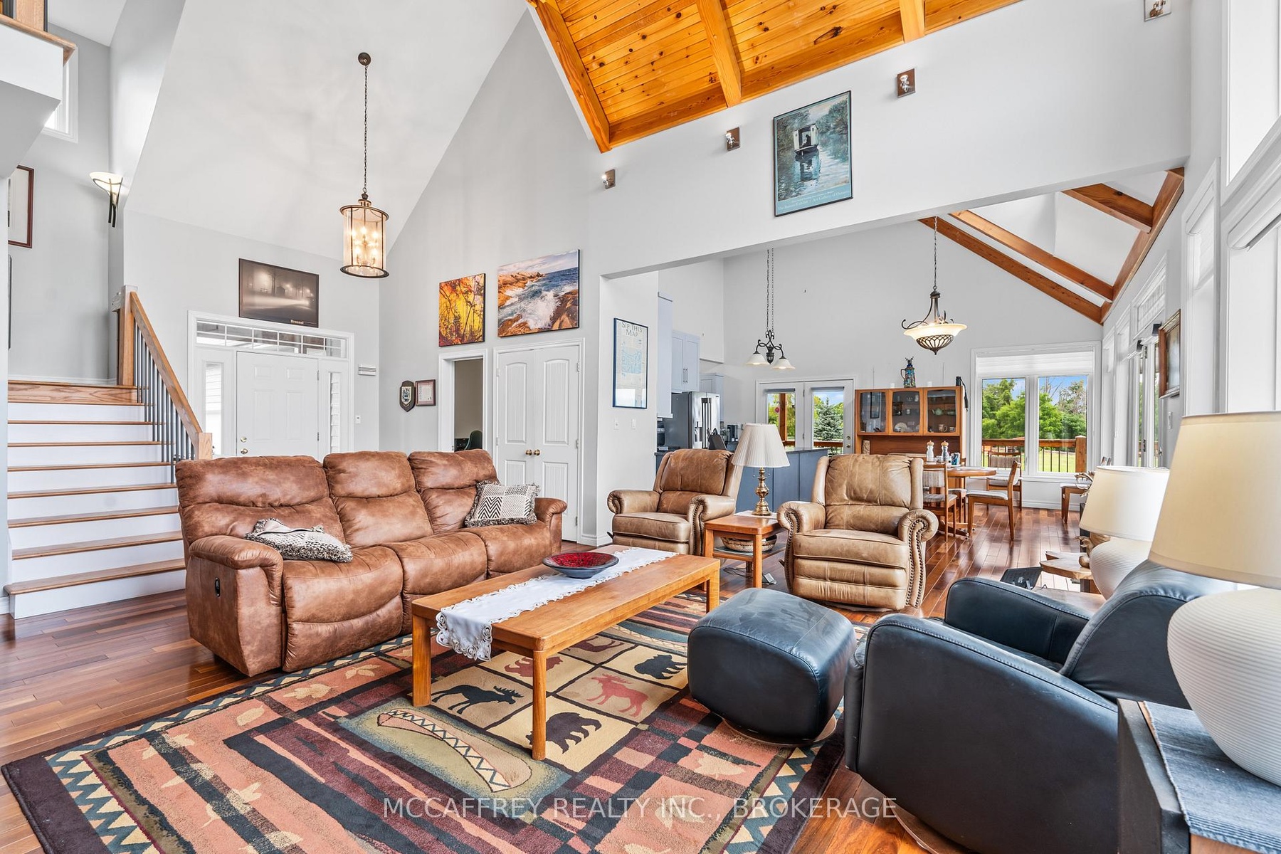 Welcome to your dream home on the shores of Hay Bay! This custom-built two-story masterpiece, constructed in 2012, blends luxury, comfort, and scenic beauty. Set on a 1.72-acre lot with 202 ft of waterfront, it offers unparalleled living. As you arrive, a double wide paved driveway leads to an attached 2-car garage and a distinctive detached 40' x 58' garage, complete with hydro and oversized doors (12'x14' & 12'x12'), ideal for boats, RVs, or a workshop. Inside, the main level impresses with 28 ft high cathedral ceilings adorned with BC Fir wood beams. Expansive windows illuminate interiors and offer picturesque views of the landscaped backyard and sparkling waters. This level includes a cozy living room with a gas fireplace, an office/den, and a gourmet kitchen with granite countertops, oak cabinetry, and a breakfast bar. The dining room and easy deck access enhance indoor-outdoor living, as well as entrances from the laundry room, and connections to the garage. Two spacious bedrooms, one with deck access, plus a 3 pc and a 4 pc bath, complete this level. Ascend the beautiful wooden staircase to discover the private sanctuary of the Primary suite. Here, you'll find a spacious bedroom complemented by two walk-in closets and a 4 pc ensuite, providing the ultimate retreat. The finished lower level enhances the home's entertainment and storage capabilities. The rec room features a wet bar, 2 pc bath, cold cellar, substantial storage room, and a utility room. Additionally, a semi-finished bedroom with walk-out offers flexibility for your needs. The outdoor space is nothing short of spectacular, with meticulously designed flower gardens and a 10'x24' floating dock invites you to embrace the waterfront lifestyle. Located just minutes from downtown Napanee, this home provides the perfect combination of convenient access to amenities and the privacy and tranquility of waterfront living.