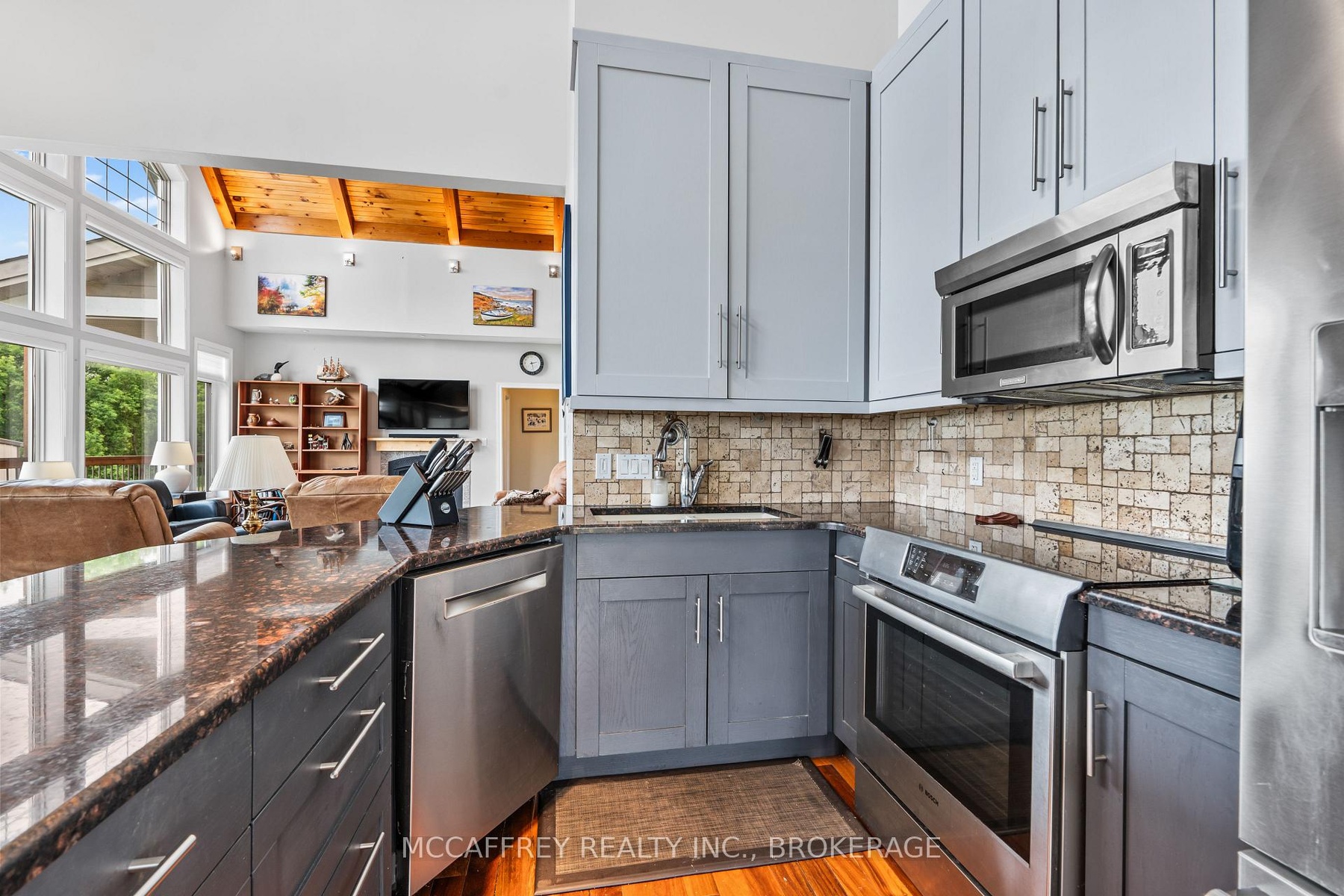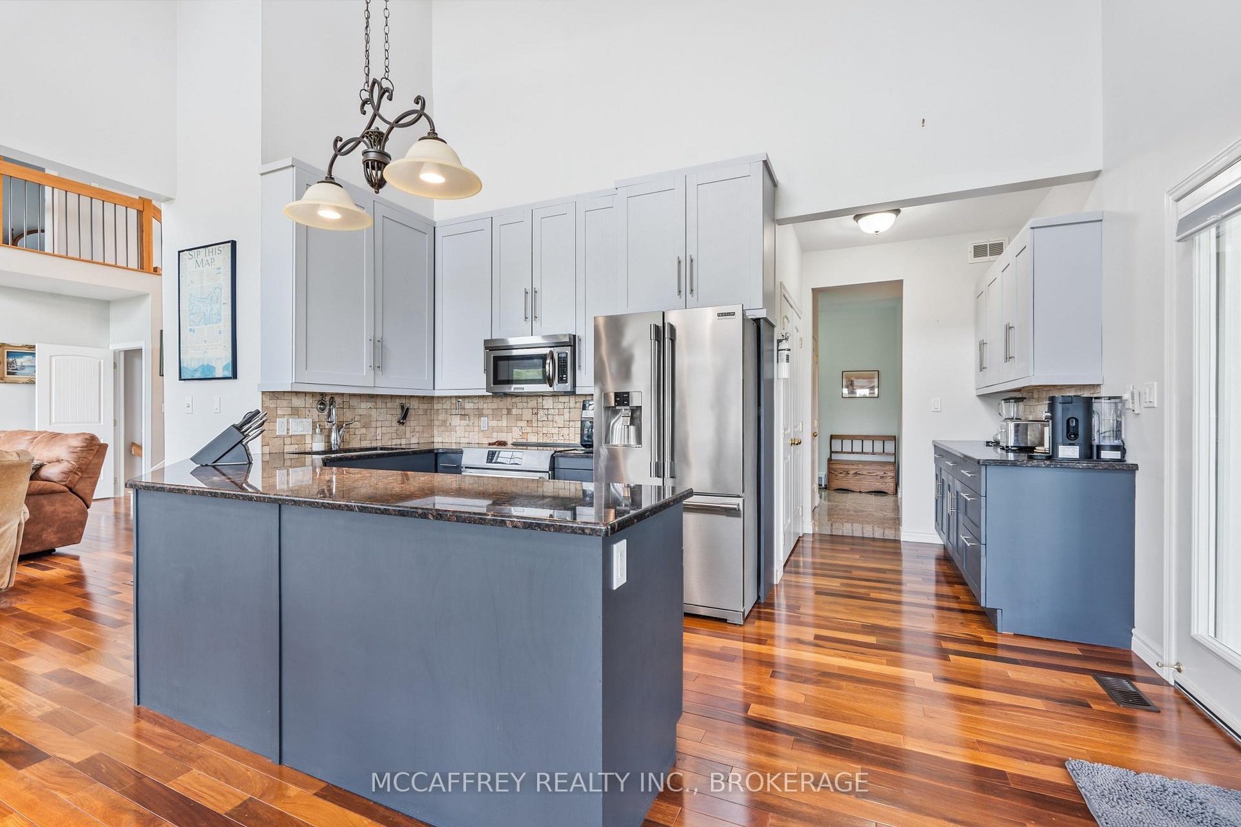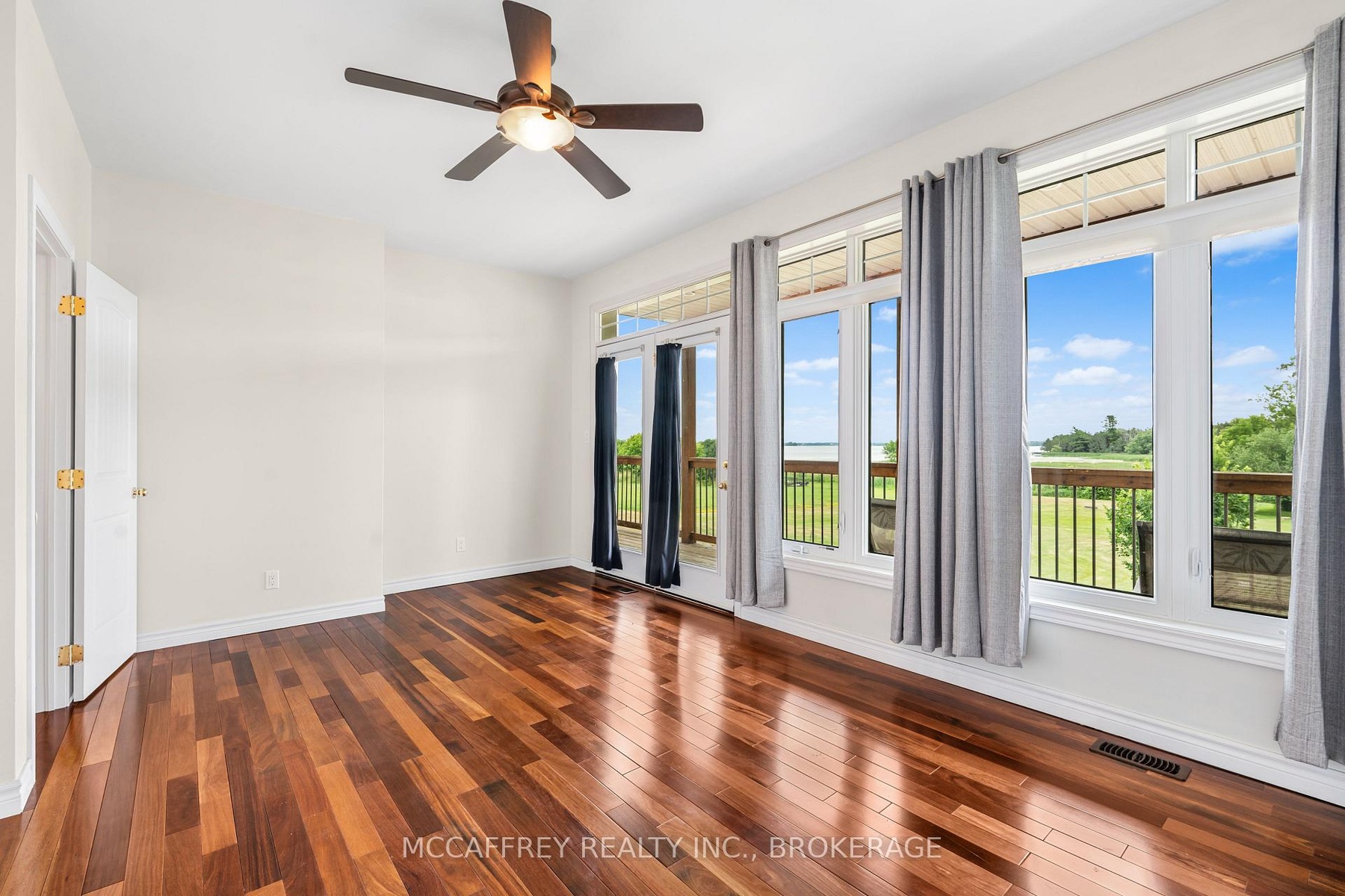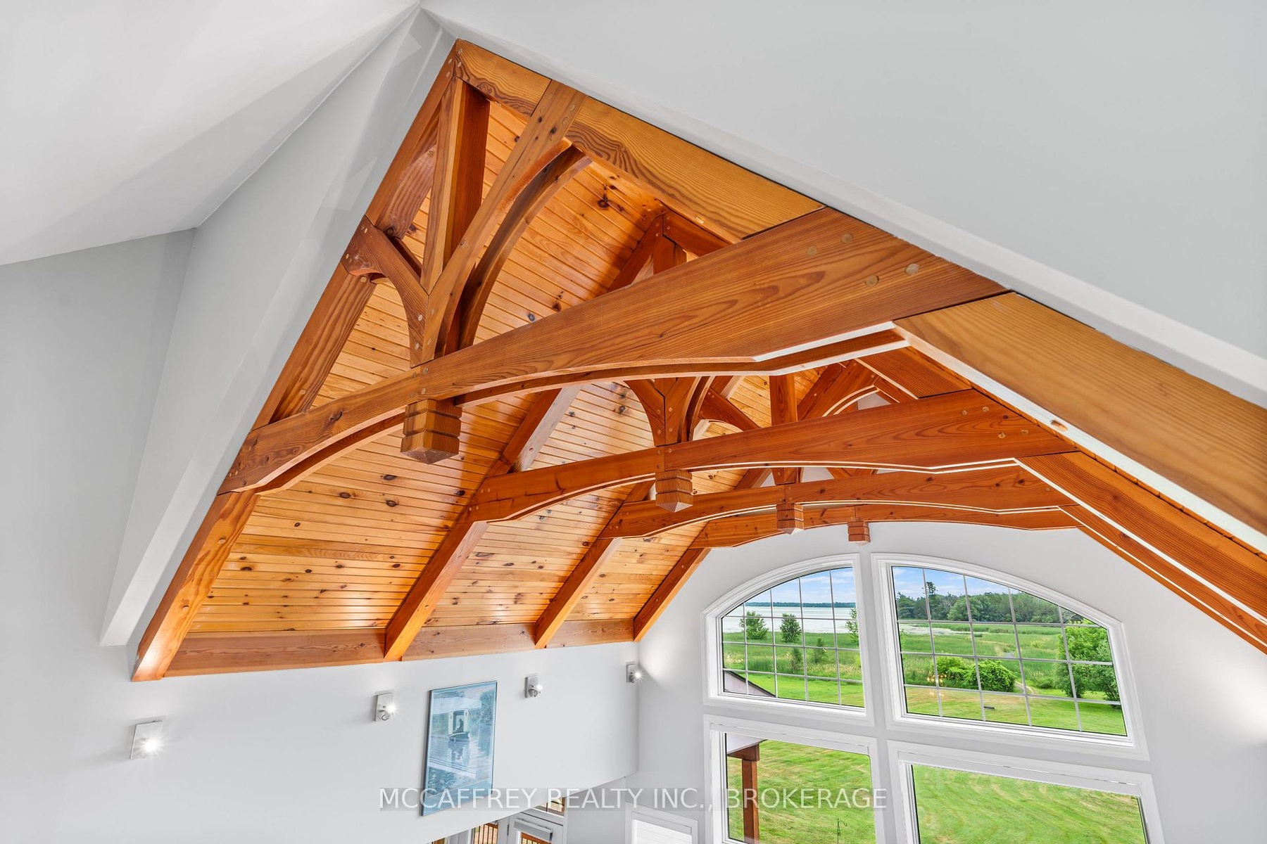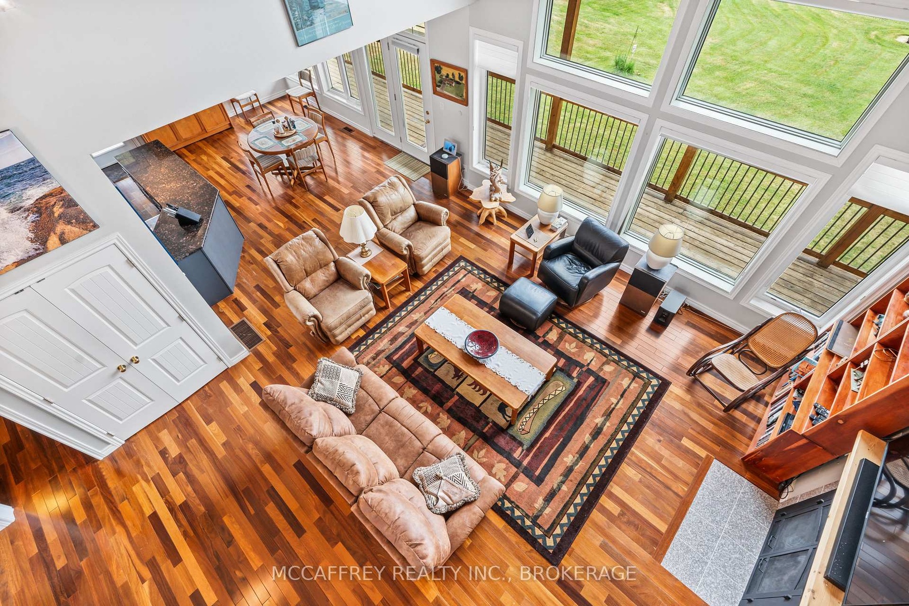 Welcome to your dream home on the shores of Hay Bay! This custom-built two-story masterpiece, constructed in 2012, blends luxury, comfort, and scenic beauty. Set on a 1.72-acre lot with 202 ft of waterfront, it offers unparalleled living. As you arrive, a double wide paved driveway leads to an attached 2-car garage and a distinctive detached 40' x 58' garage, complete with hydro and oversized doors (12'x14' & 12'x12'), ideal for boats, RVs, or a workshop. Inside, the main level impresses with 28 ft high cathedral ceilings adorned with BC Fir wood beams. Expansive windows illuminate interiors and offer picturesque views of the landscaped backyard and sparkling waters. This level includes a cozy living room with a gas fireplace, an office/den, and a gourmet kitchen with granite countertops, oak cabinetry, and a breakfast bar. The dining room and easy deck access enhance indoor-outdoor living, as well as entrances from the laundry room, and connections to the garage. Two spacious bedrooms, one with deck access, plus a 3 pc and a 4 pc bath, complete this level. Ascend the beautiful wooden staircase to discover the private sanctuary of the Primary suite. Here, you'll find a spacious bedroom complemented by two walk-in closets and a 4 pc ensuite, providing the ultimate retreat. The finished lower level enhances the home's entertainment and storage capabilities. The rec room features a wet bar, 2 pc bath, cold cellar, substantial storage room, and a utility room. Additionally, a semi-finished bedroom with walk-out offers flexibility for your needs. The outdoor space is nothing short of spectacular, with meticulously designed flower gardens and a 10'x24' floating dock invites you to embrace the waterfront lifestyle. Located just minutes from downtown Napanee, this home provides the perfect combination of convenient access to amenities and the privacy and tranquility of waterfront living.