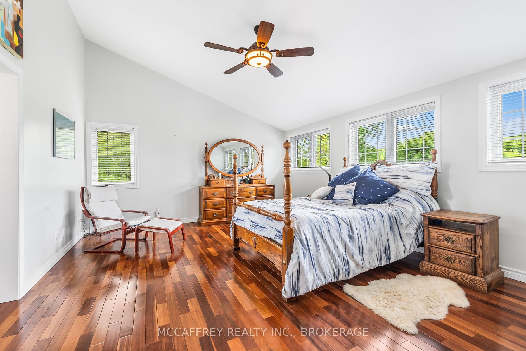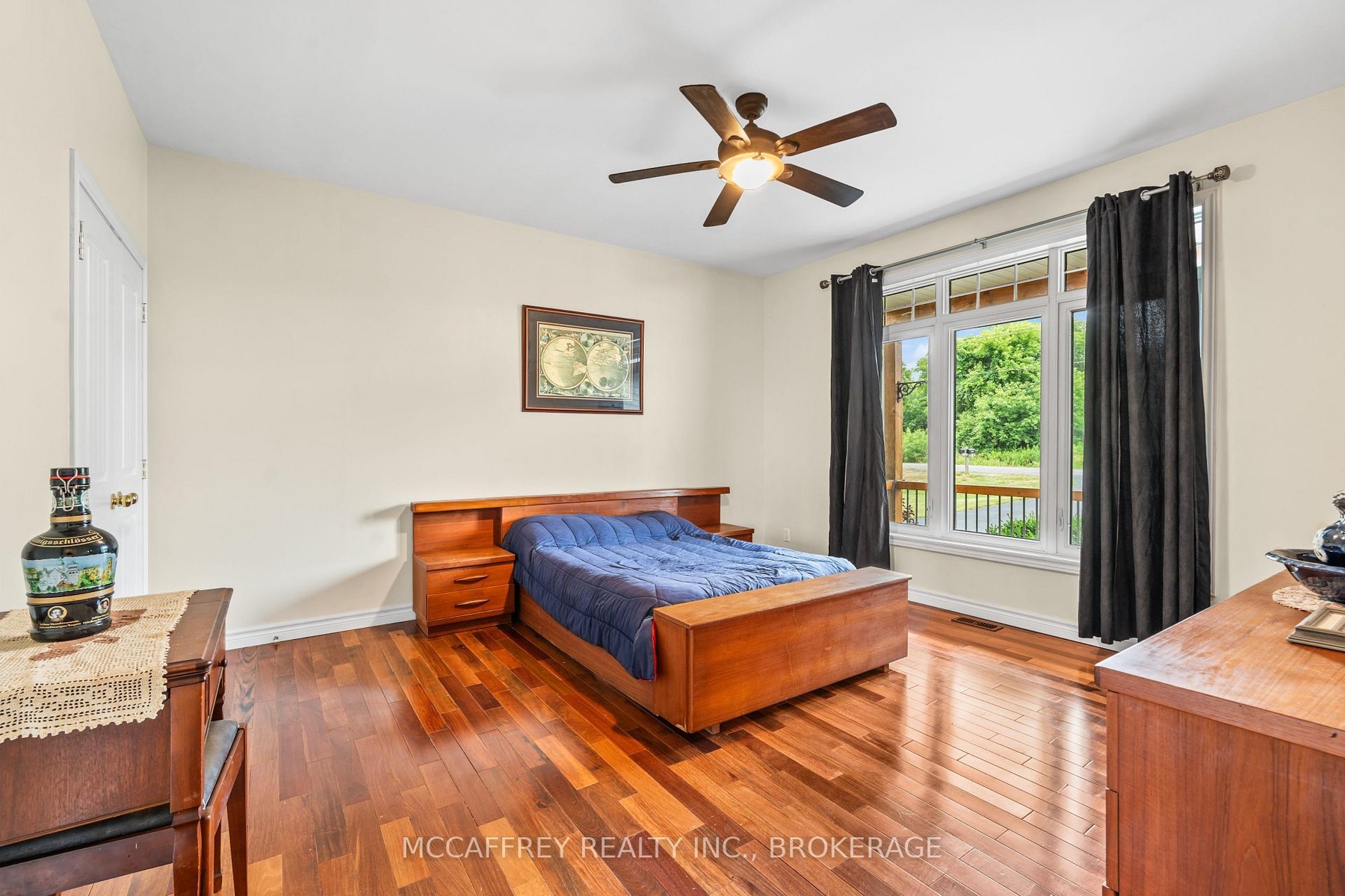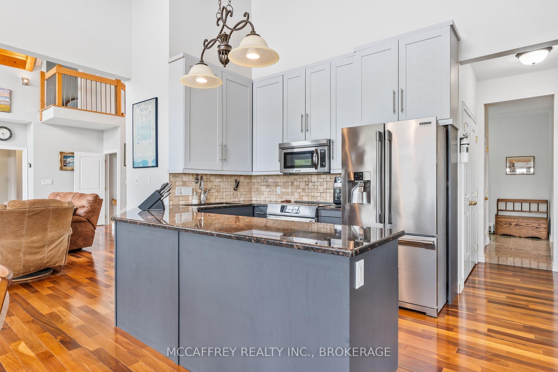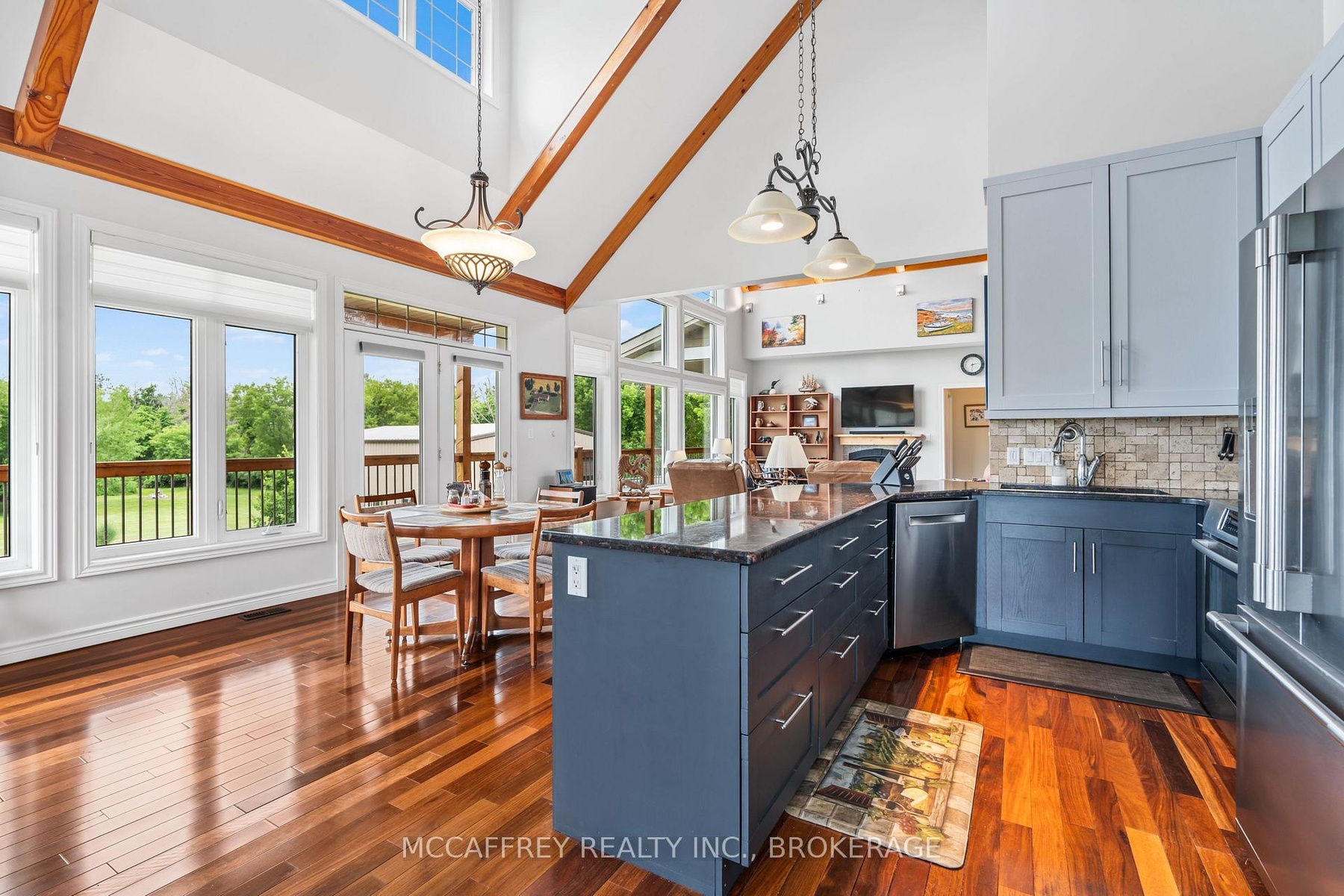 Welcome to your dream home on the shores of Hay Bay! This custom-built two-story masterpiece, constructed in 2012, blends luxury, comfort, and scenic beauty. Set on a 1.72-acre lot with 202 ft of waterfront, it offers unparalleled living. As you arrive, a double wide paved driveway leads to an attached 2-car garage and a distinctive detached 40' x 58' garage, complete with hydro and oversized doors (12'x14' & 12'x12'), ideal for boats, RVs, or a workshop. Inside, the main level impresses with 28 ft high cathedral ceilings adorned with BC Fir wood beams. Expansive windows illuminate interiors and offer picturesque views of the landscaped backyard and sparkling waters. This level includes a cozy living room with a gas fireplace, an office/den, and a gourmet kitchen with granite countertops, oak cabinetry, and a breakfast bar. The dining room and easy deck access enhance indoor-outdoor living, as well as entrances from the laundry room, and connections to the garage. Two spacious bedrooms, one with deck access, plus a 3 pc and a 4 pc bath, complete this level. Ascend the beautiful wooden staircase to discover the private sanctuary of the Primary suite. Here, you'll find a spacious bedroom complemented by two walk-in closets and a 4 pc ensuite, providing the ultimate retreat. The finished lower level enhances the home's entertainment and storage capabilities. The rec room features a wet bar, 2 pc bath, cold cellar, substantial storage room, and a utility room. Additionally, a semi-finished bedroom with walk-out offers flexibility for your needs. The outdoor space is nothing short of spectacular, with meticulously designed flower gardens and a 10'x24' floating dock invites you to embrace the waterfront lifestyle. Located just minutes from downtown Napanee, this home provides the perfect combination of convenient access to amenities and the privacy and tranquility of waterfront living.