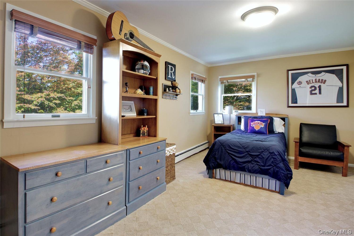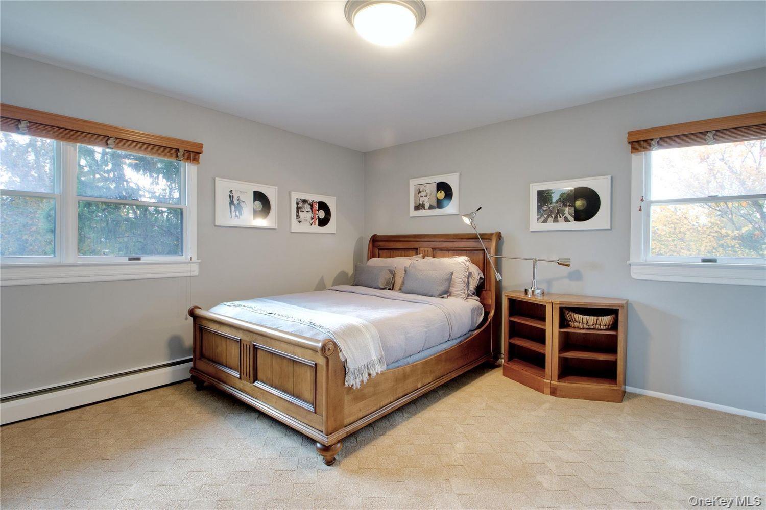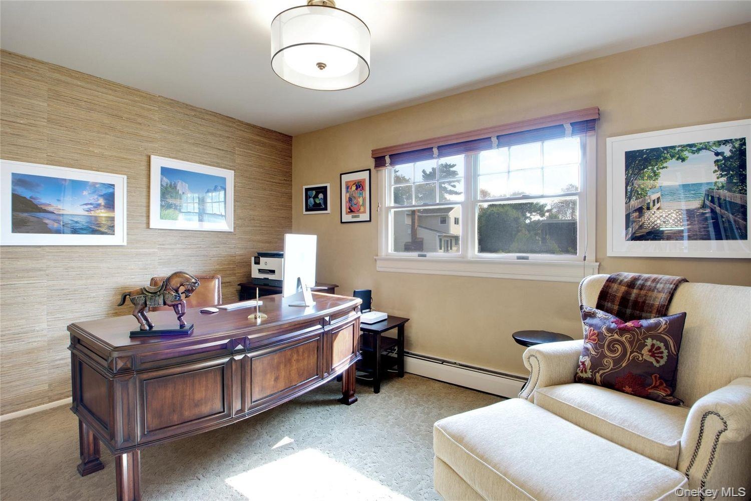 Upstairs, a versatile family room or office space provides a flexible option for work or relaxation. The luxurious primary suite offers a serene retreat with a walk-in closet and a beautifully renovated bath with radiant heated floors. Four additional bedrooms and two full baths—one also with radiant heat—complete the second level, providing ample living space for all.