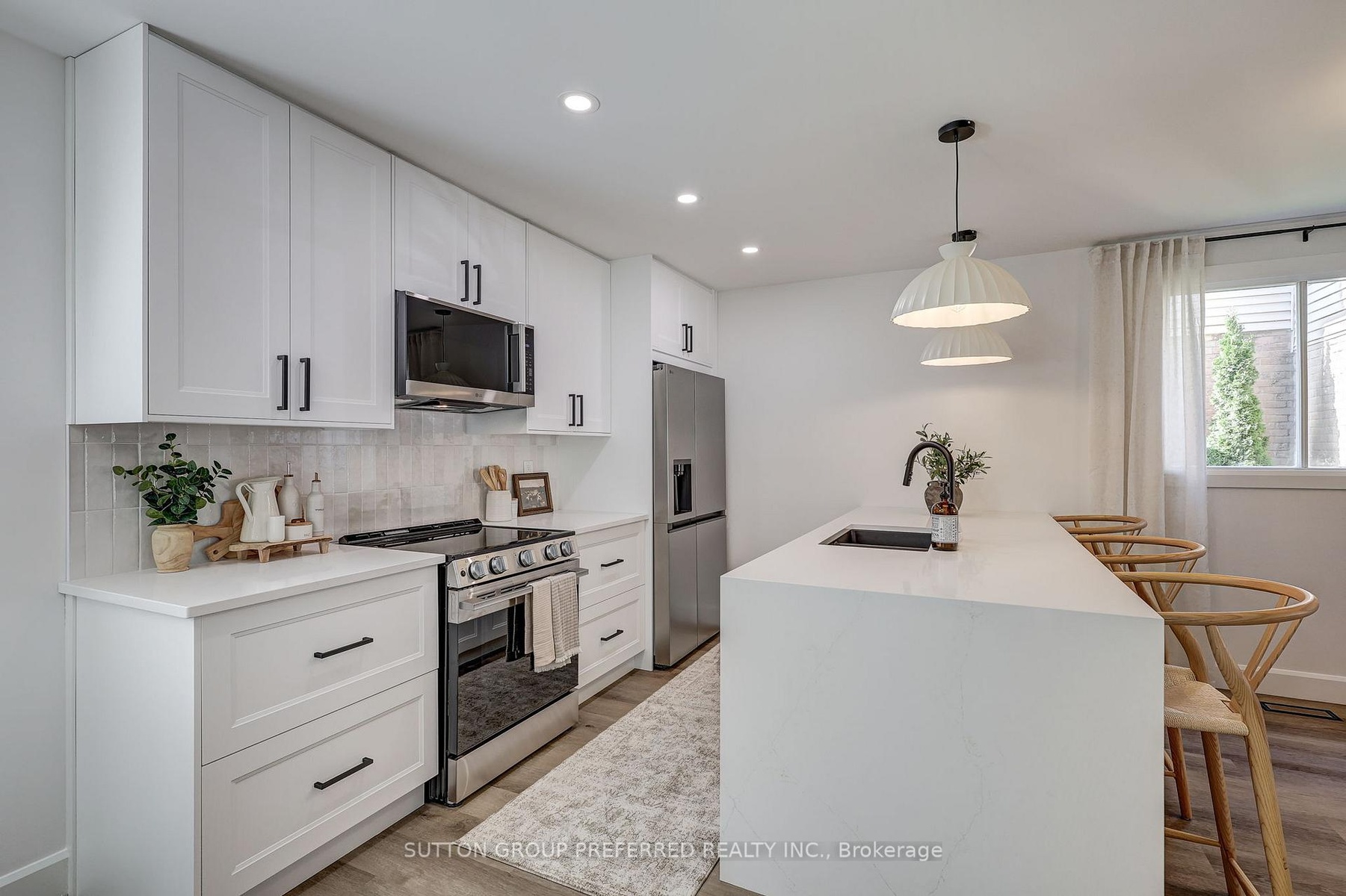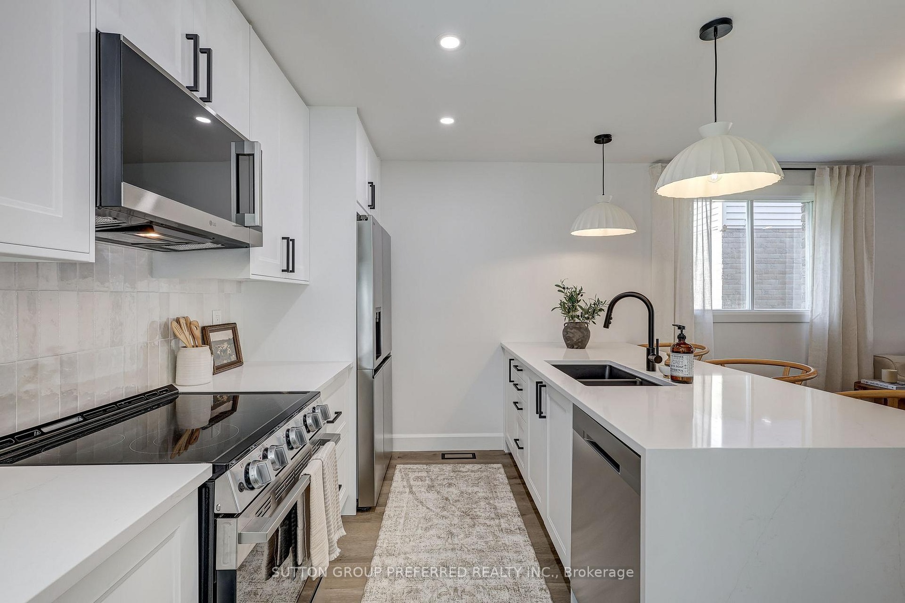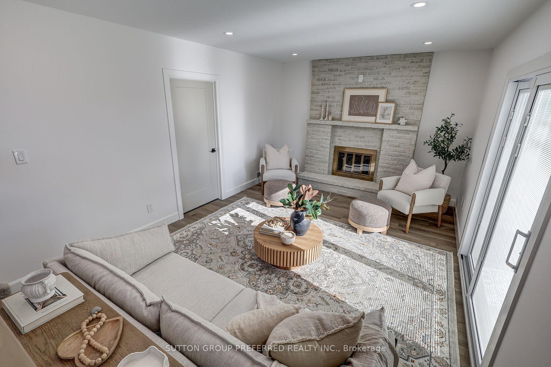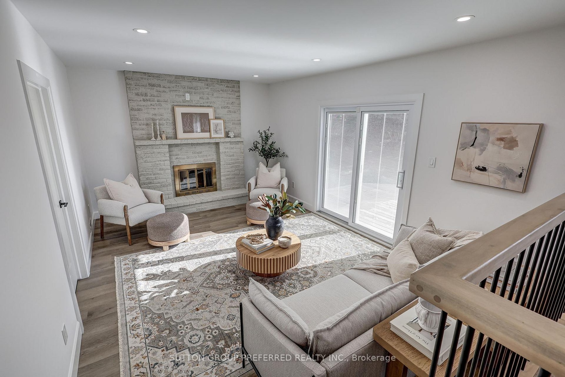 Spectacular renovated top/down 4 level side-split with separate side entrance to lower level with laundry access, 2 car garage, door replaced 2021. Enjoy the new kitchen cabinet & waterfall island quartz, backsplash, open to optional 2 family rooms. New flooring & pot lights and lighting throughout the home. Third level family room offers wood burning fireplace leading to sliding door to 12 x 12 deck and large backyard fully fenced. 3 bathrooms totally redone, trim and doors, some updated windows, huge master bedroom with double closet and cheater ensuite, 2 other bedrooms are a nice size, updated electrical panel. Lower level Rec Room with modern electric fireplace and bedroom and 3 piece bath. Nice storage area. Furnace and central air replaced 2024, shingles 2016, spray foam plus insulation 2025 in lower level. Fridge, stove, dishwasher included.