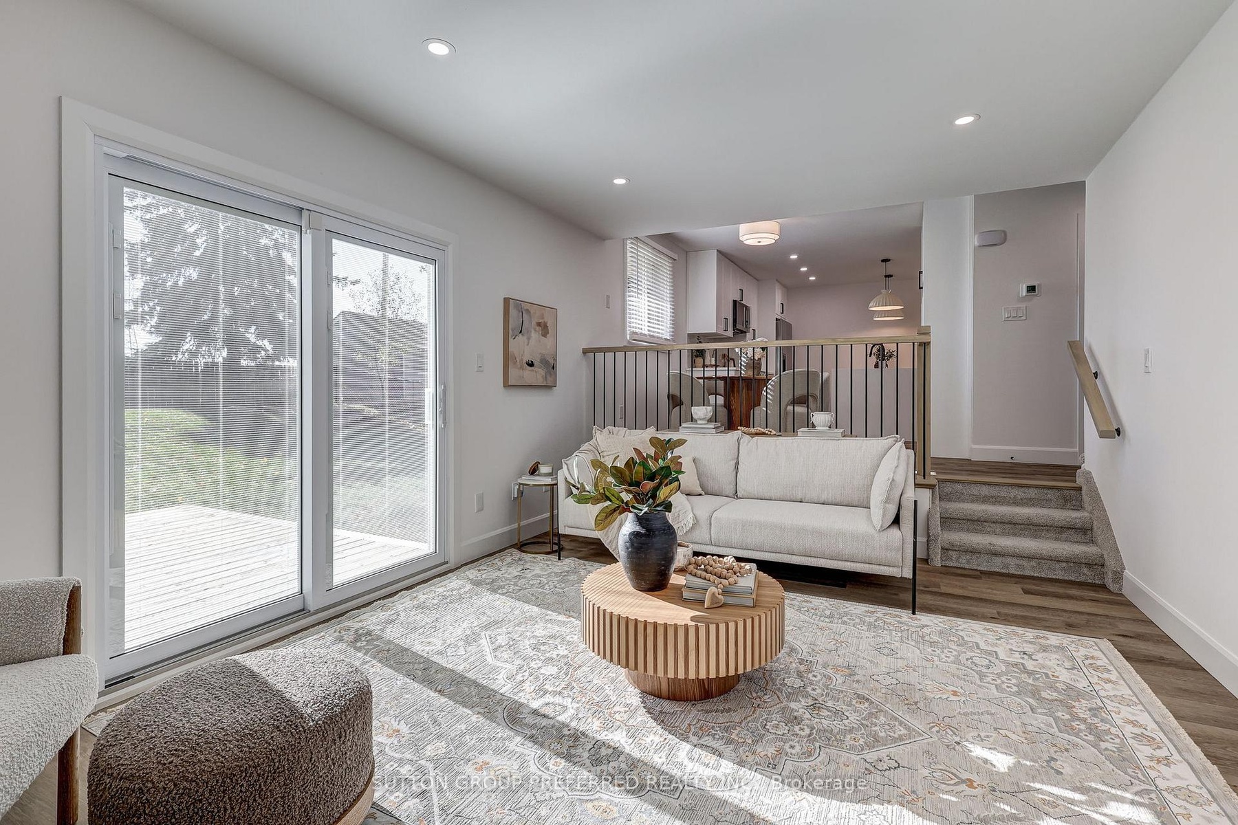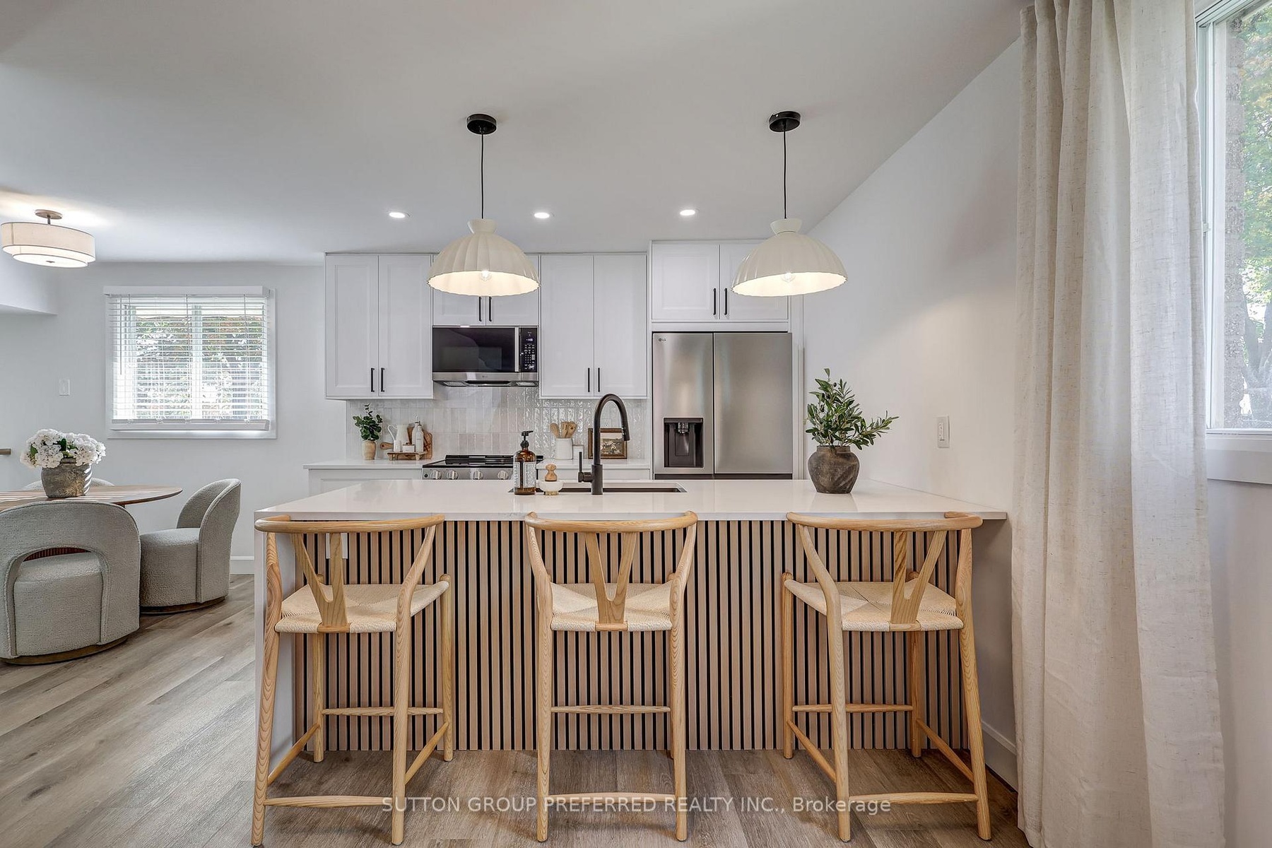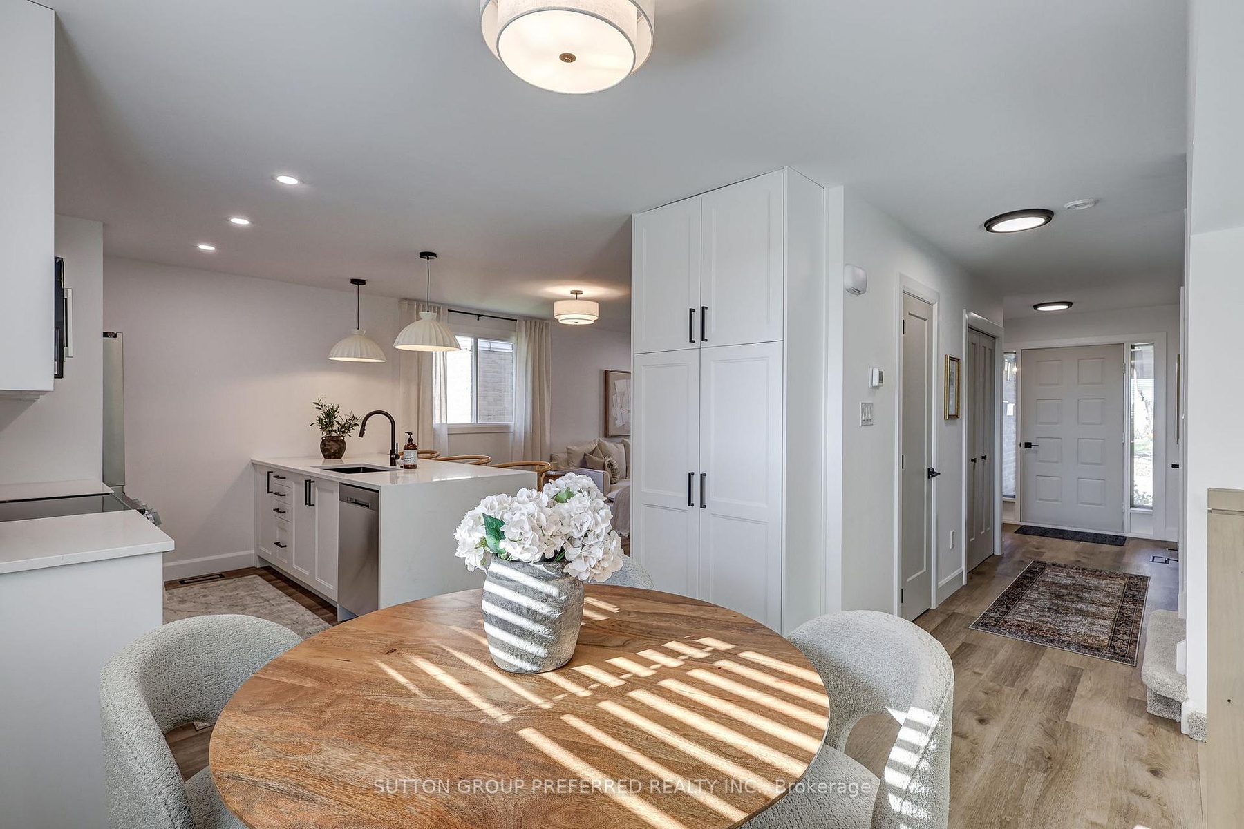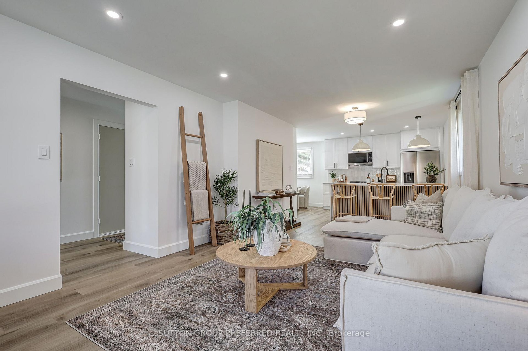 Spectacular renovated top/down 4 level side-split with separate side entrance to lower level with laundry access, 2 car garage, door replaced 2021. Enjoy the new kitchen cabinet & waterfall island quartz, backsplash, open to optional 2 family rooms. New flooring & pot lights and lighting throughout the home. Third level family room offers wood burning fireplace leading to sliding door to 12 x 12 deck and large backyard fully fenced. 3 bathrooms totally redone, trim and doors, some updated windows, huge master bedroom with double closet and cheater ensuite, 2 other bedrooms are a nice size, updated electrical panel. Lower level Rec Room with modern electric fireplace and bedroom and 3 piece bath. Nice storage area. Furnace and central air replaced 2024, shingles 2016, spray foam plus insulation 2025 in lower level. Fridge, stove, dishwasher included.