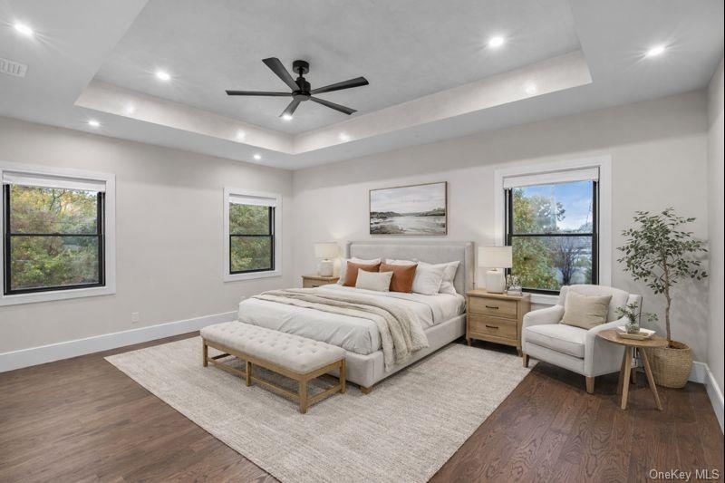 - Spare room with dark wood-style floors, a tray ceiling, recessed lighting, and ceiling fan