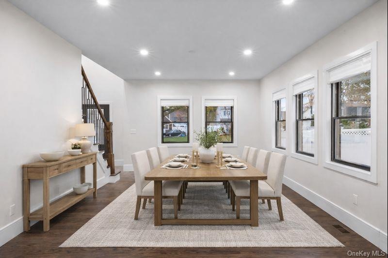 - Unfurnished living room with dark wood finished floors, stairway, and recessed lighting