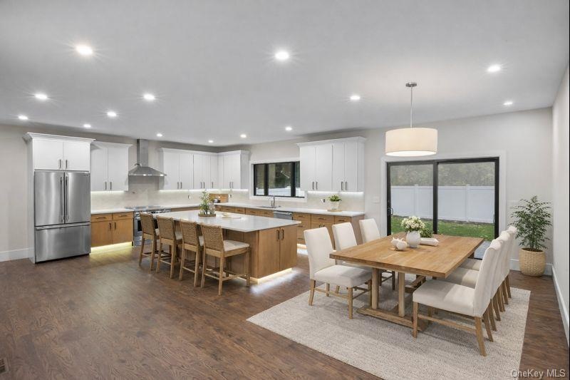 - Kitchen with high quality appliances, wall chimney exhaust hood, white cabinets, backsplash, and recessed lighting
