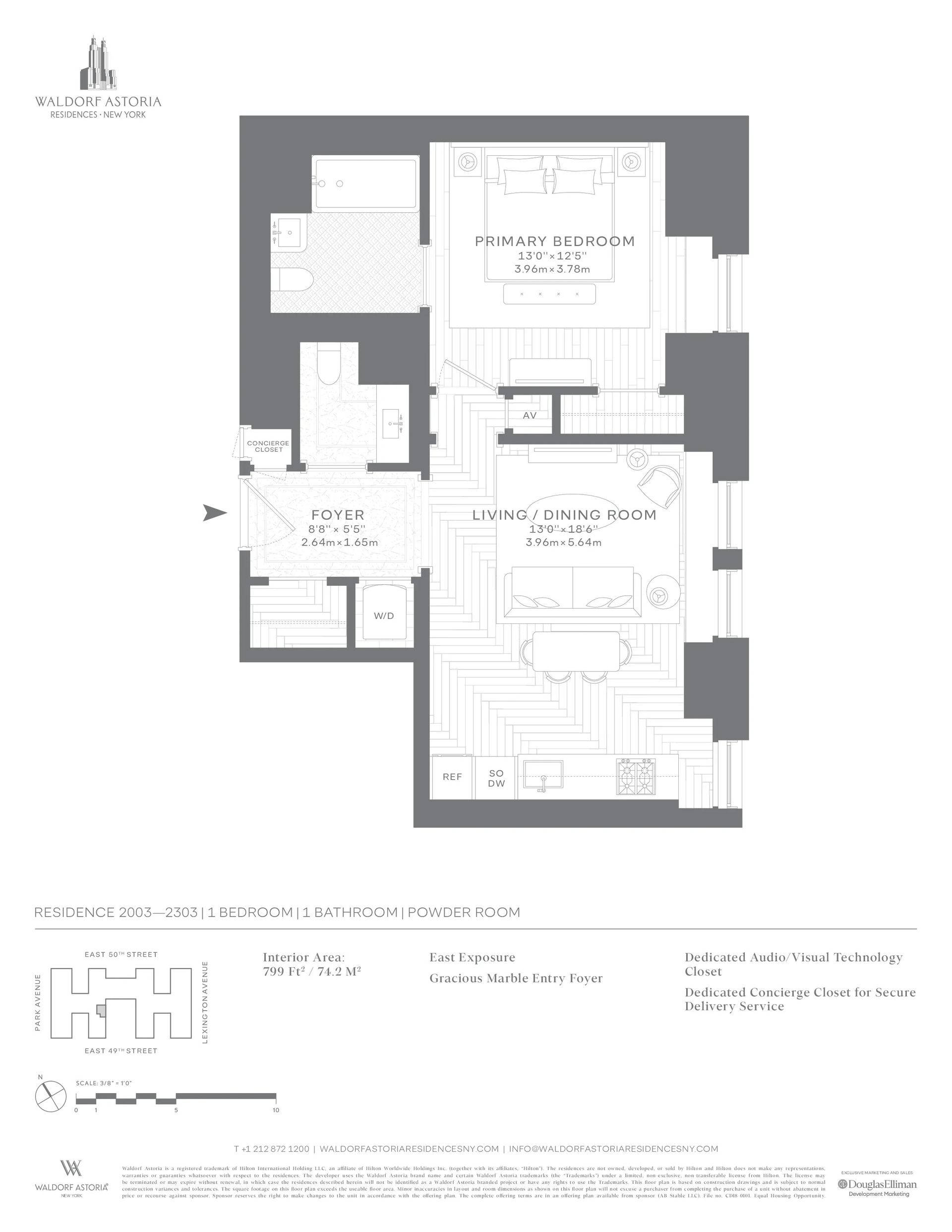 Live in timeless elegance at the Waldorf Astoria Residences New York. Residence 2003 is a stunning 1-bedroom, 1.5-bath home offering 796 sq. ft. of refined living space with beautiful eastern courtyard views.