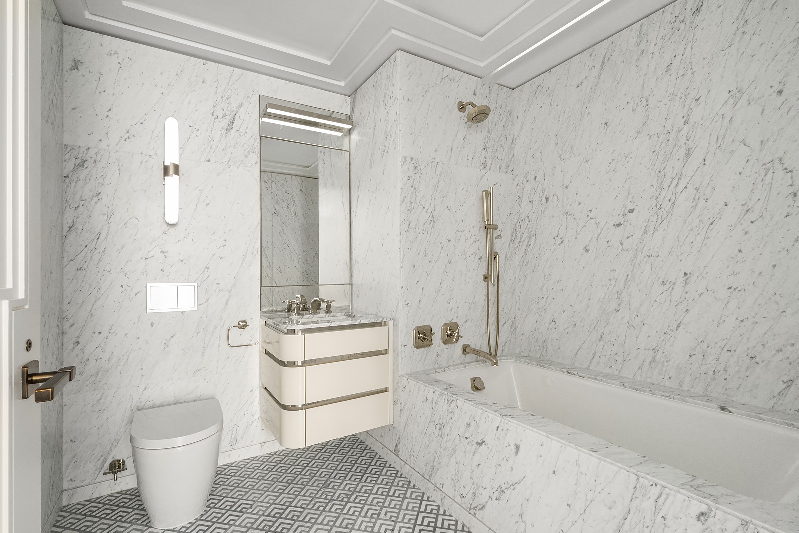 The primary bathroom is a sanctuary of luxury with Bianca Carrara marble slab walls, radiant-heated mosaic marble floors, and a custom vanity with Luna Gray marble countertop. Fixtures are custom forged in polished nickel, exclusive to the Waldorf Astoria Residences.