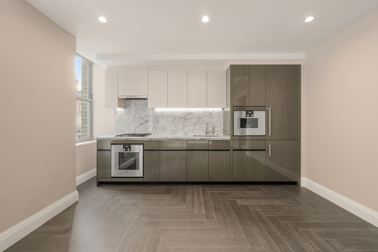 The open-concept kitchen and living area is bathed in natural light and features custom Molteni&C cabinetry, Gaggenau appliances, a four-burner gas cooktop, Polished Quartzite Arabescato countertops, and polished nickel fixtures.