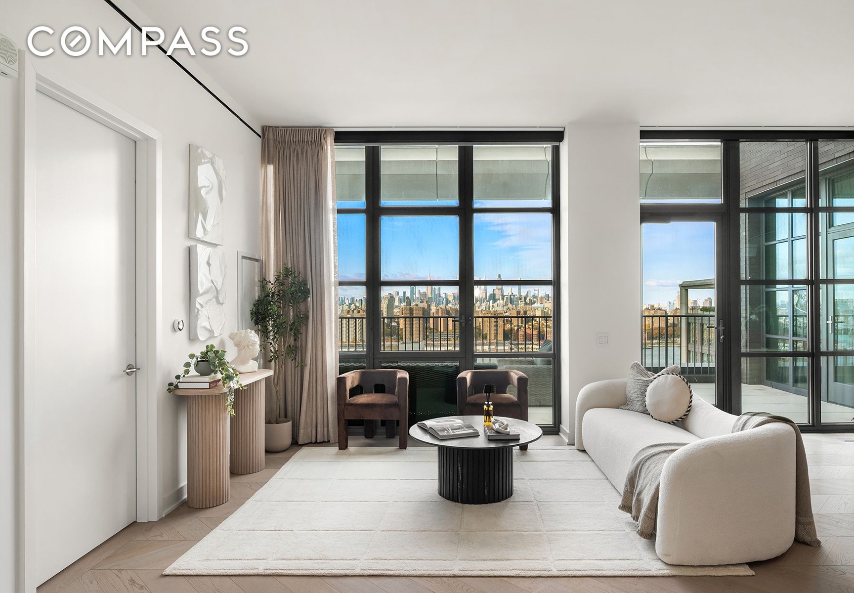 A grand entry leads into an expansive great room framed by floor-to-ceiling divided-light windows that flood the space with natural light and showcase panoramic vistas of the East River, Manhattan skyline, and Brooklyn Bridge. The open chef’s kitchen is both functional and elegant, featuring custom white-oak cabinetry in a tobacco finish, Calacatta Caldia marble countertops and backsplash, and a full suite of Gaggenau appliances. Chevron-pattern white-oak flooring and lofty ceilings add to the home’s warm yet elevated aesthetic, creating a seamless flow between living, dining, and entertaining spaces.