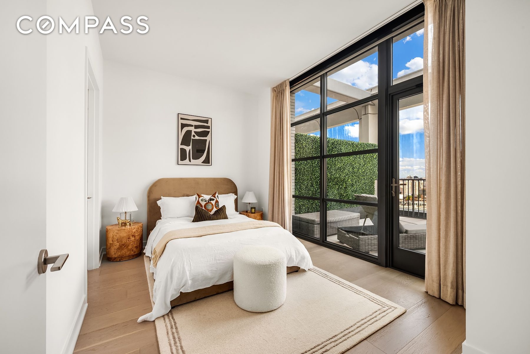 Outdoor living takes center stage with a private terrace of approximately 410 square feet, fully equipped with a gas fireplace - perfect for dining al fresco or simply taking in the dramatic Manhattan views. Whether for morning coffee or sunset gatherings, this terrace extends the living experience into the open air, embodying the very best of indoor-outdoor Brooklyn living.