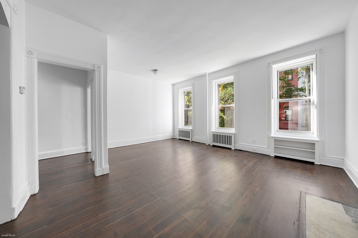 Entered via the elegant front stoop, the upper duplex offers a light-filled living room, dining area, and kitchen on the third floor, complemented by a half bath. The top floor includes four bedrooms and two full bathrooms, providing abundant space for family or guests.