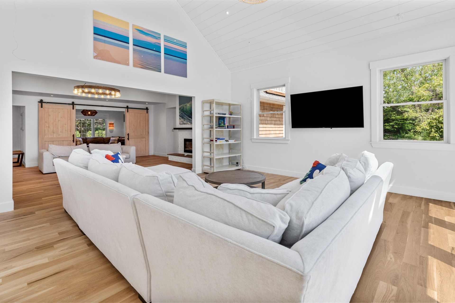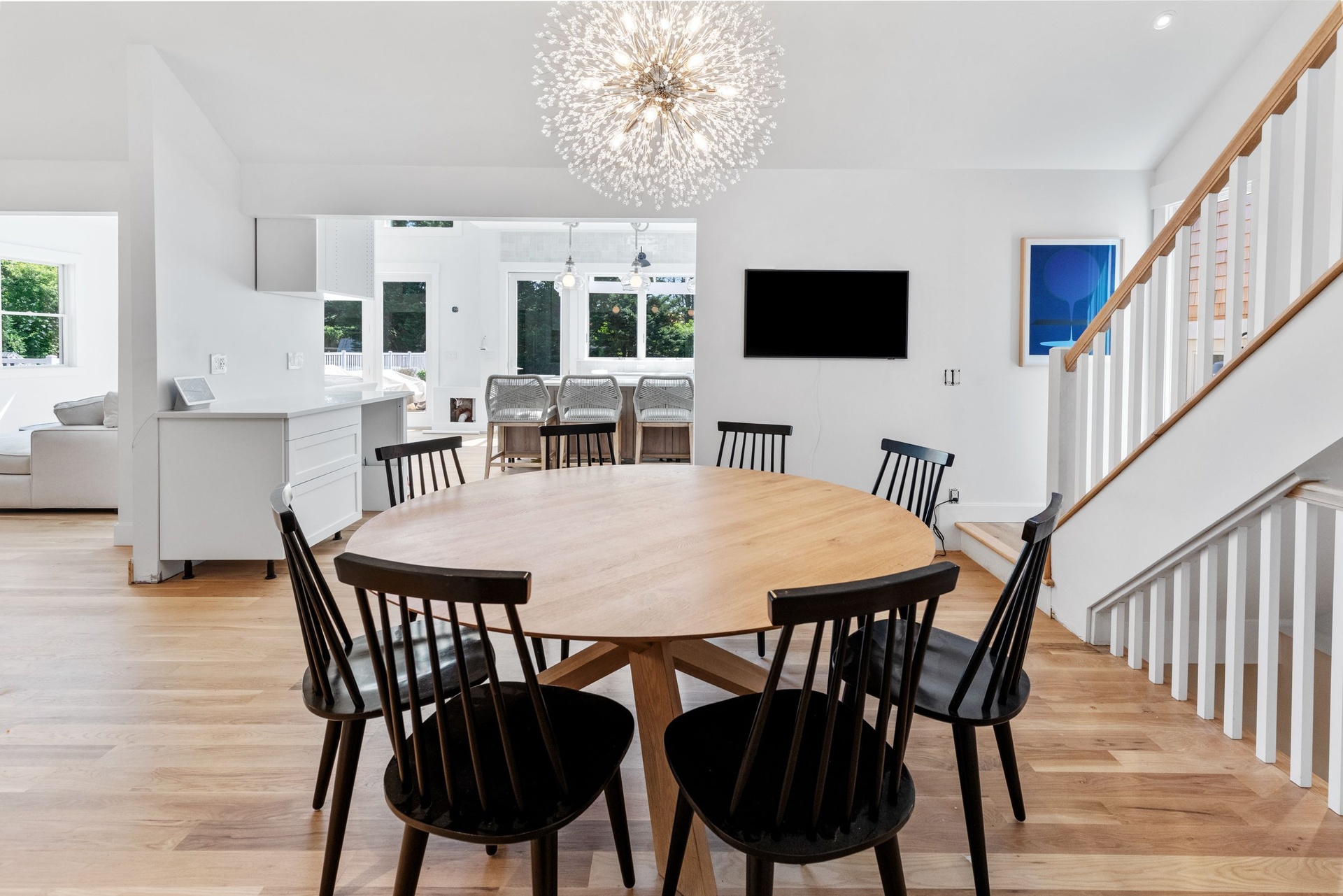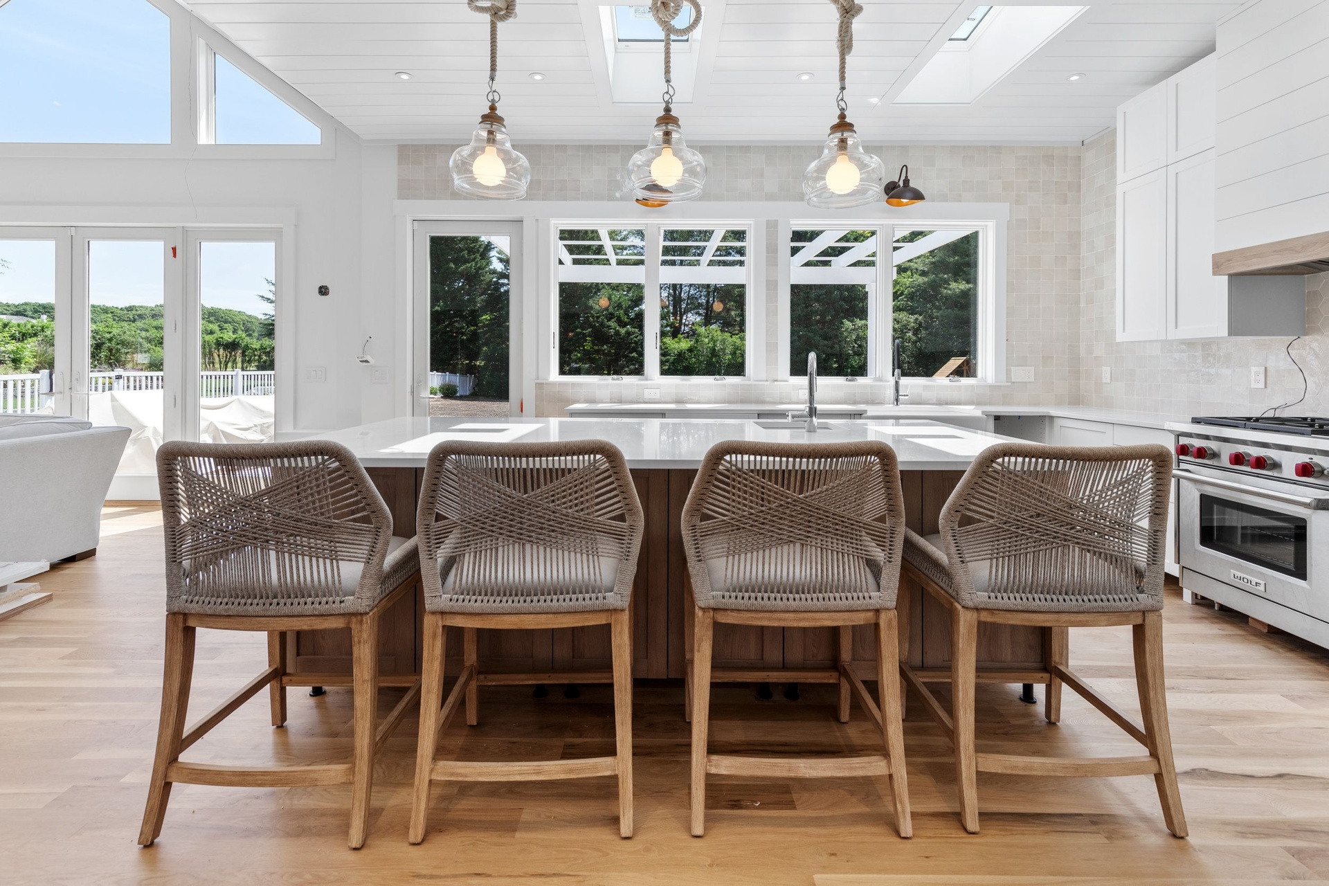 Enter through the beachy foyer into the generous 3-room connected living space - a grand double height living room, flanked by a cozy den/TV room on one side, and the sunwashed great room on the other, perfect for entertaining, socializing and relaxing together. Proceed into the brand new gourmet kitchen, with a 60" Wolf stove, double Miele ovens, double Miele dishwashers, SubZero fridge and massive 9' island with breakfast bar below nautical style pendant chandeliers. Serve up a Hamptons-style feast at the round dining table with seating for eight below a contemporary starburst chandelier. Prefer outdoor dining? Utilize the outdoor kitchen with 6-burner Weber grill to prepare a picnic BBQ, or bake pizzas in the Gozny pizza oven. Enjoy alfresco dining on the 12-seat teak outdoor table seating 10 overlooking the expansive backyard, pool and farm fields.