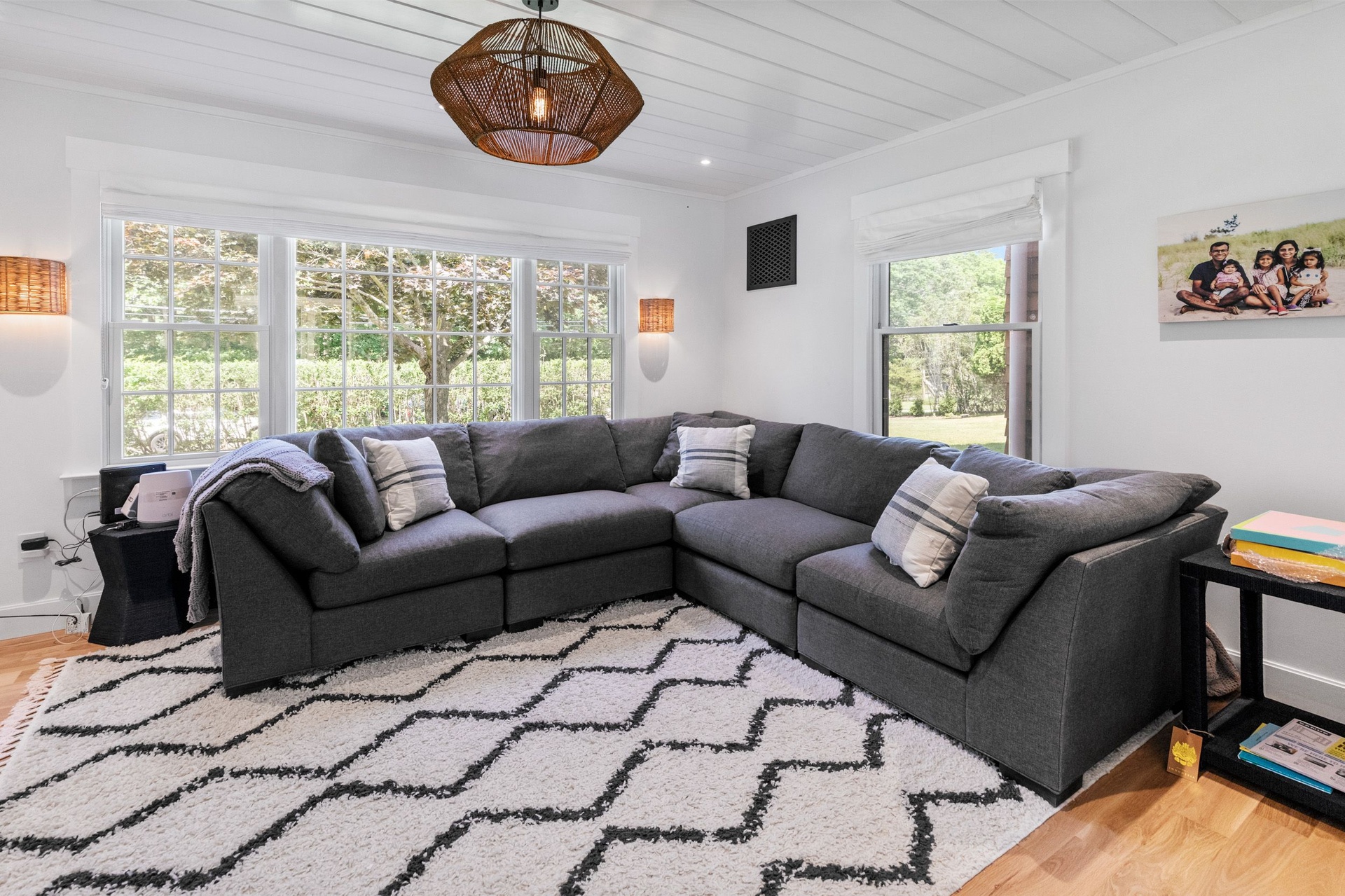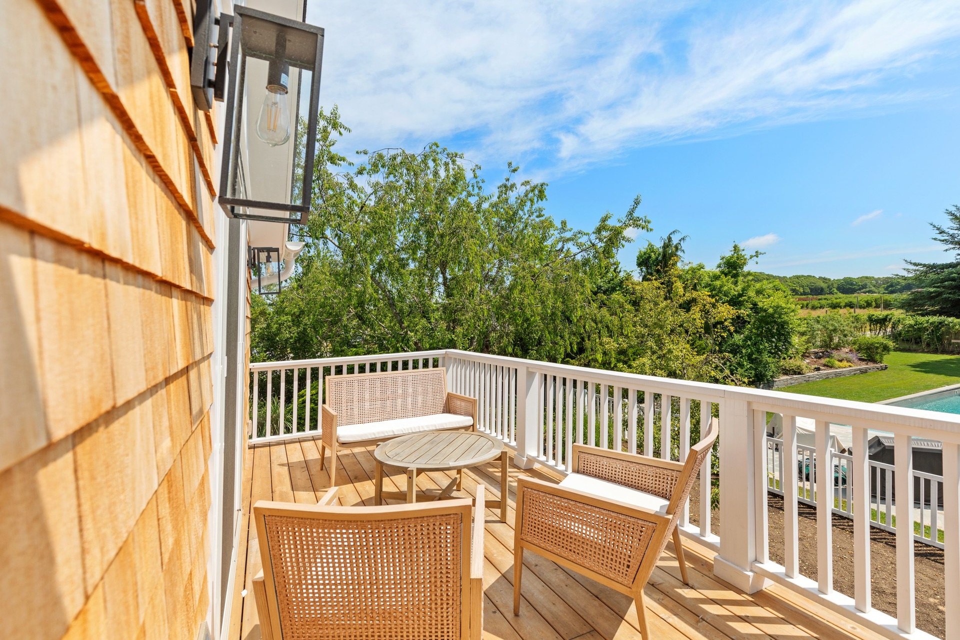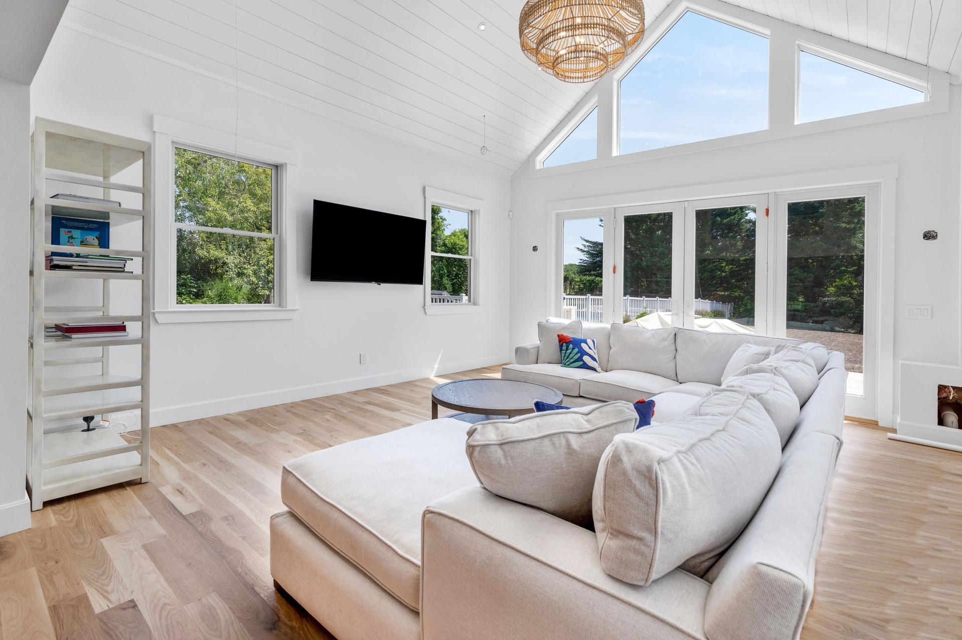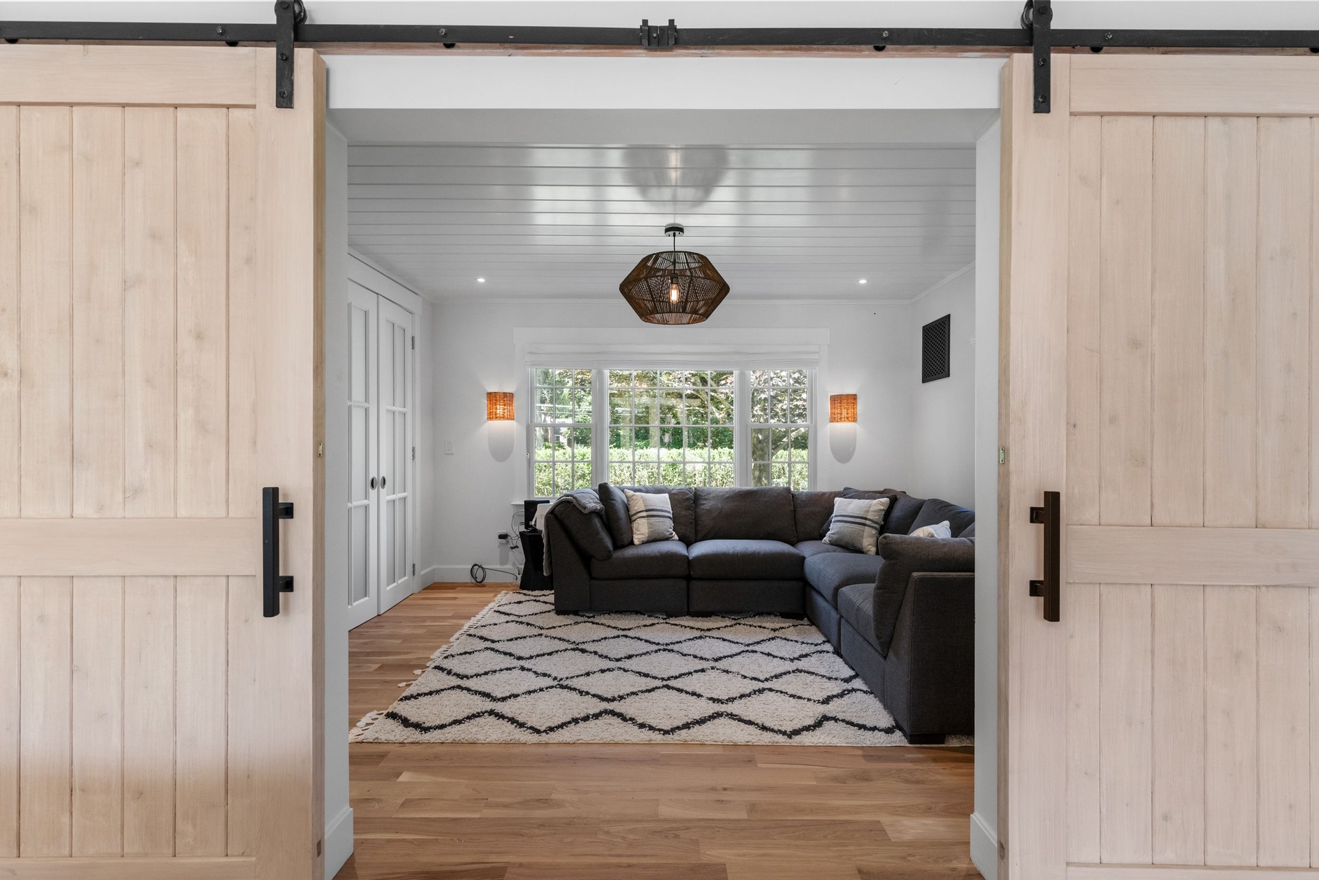 Enter through the beachy foyer into the generous 3-room connected living space - a grand double height living room, flanked by a cozy den/TV room on one side, and the sunwashed great room on the other, perfect for entertaining, socializing and relaxing together. Proceed into the brand new gourmet kitchen, with a 60" Wolf stove, double Miele ovens, double Miele dishwashers, SubZero fridge and massive 9' island with breakfast bar below nautical style pendant chandeliers. Serve up a Hamptons-style feast at the round dining table with seating for eight below a contemporary starburst chandelier. Prefer outdoor dining? Utilize the outdoor kitchen with 6-burner Weber grill to prepare a picnic BBQ, or bake pizzas in the Gozny pizza oven. Enjoy alfresco dining on the 12-seat teak outdoor table seating 10 overlooking the expansive backyard, pool and farm fields.