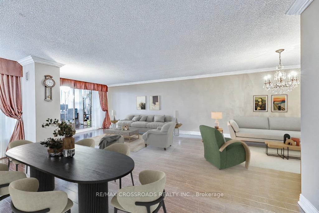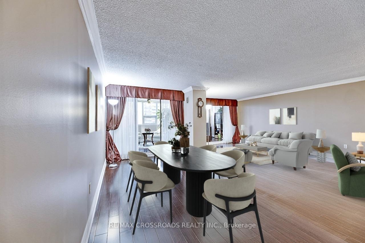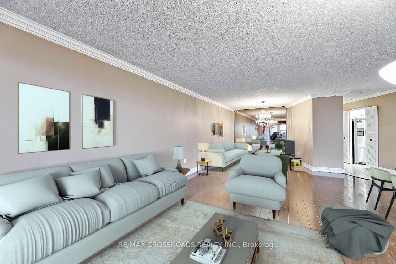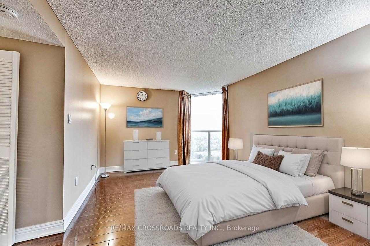 Stunning corner unit on a high floor with the most desirable southwest exposure and unobstructed views of the Toronto skyline. This renovated suite offers a bright, open-concept layout with hardwood floors throughout and a designer kitchen featuring elegant stone countertops. The former den has been opened up to create a spacious living and office area. The primary bedroom includes a custom closet with built-in shelving and a modern ensuite bathroom with a stand-up shower and granite vanity. Step out onto the open balcony to enjoy breathtaking city views. Freshly painted and move-in ready, this home combines style, comfort, and functionality. Includes tandem parking for two cars and access to all the conveniences of condo living. A rare find offering luxury, space, and spectacular views - an ideal choice for urban living at its finest. Condo fee includes Heat, Electricity, Water, High Speed Internet, Five star Amenities, Tennis Courts, Indoor & Outdoor Pools, Billiard Rm, Gym, Squash court. Close to Seneca College and hospital.
