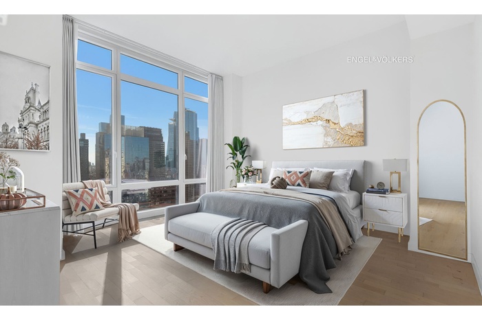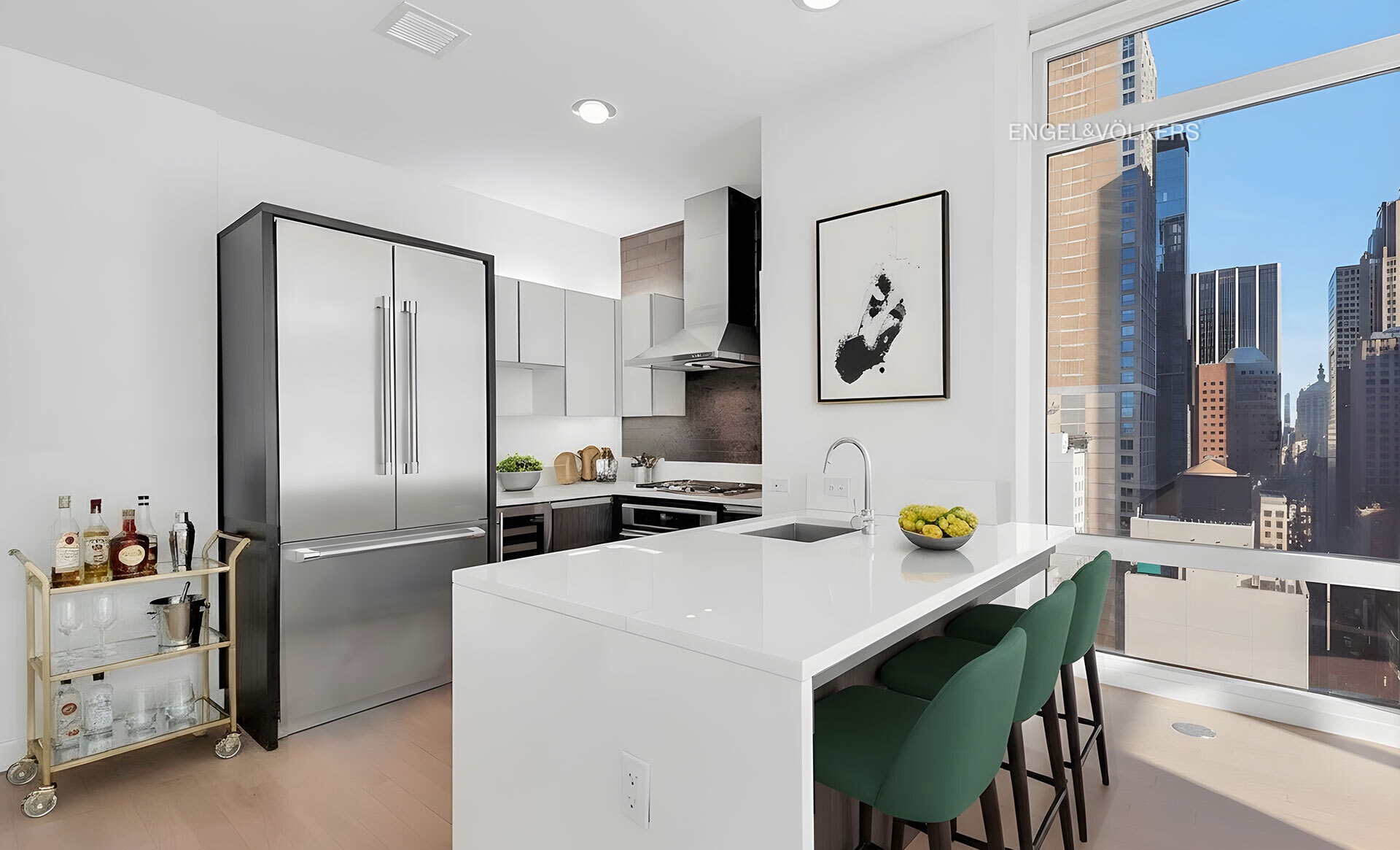 Perfectly positioned at the crossroads of Midtown West and the Theater District, this impeccably maintained and generously proportioned home (approx. 954 SF) is wrapped in Floor-to-Ceiling Windows facing South and East, bathing the interiors in brilliant natural light and showcasing picture-perfect, iconic Manhattan views. The home’s gracious layout, high ceilings, and refinished European white oak floors create a serene sense of space and style throughout.