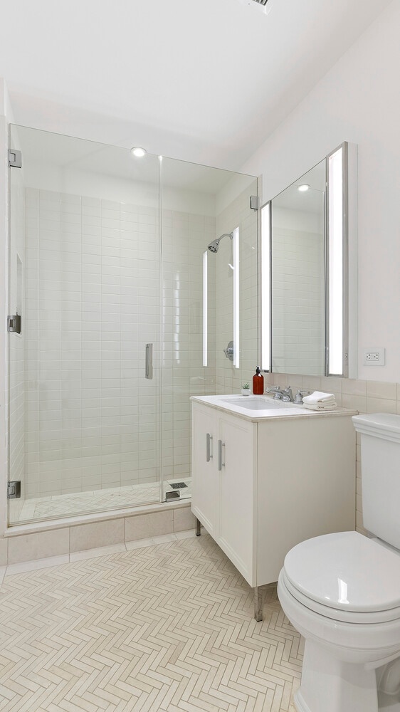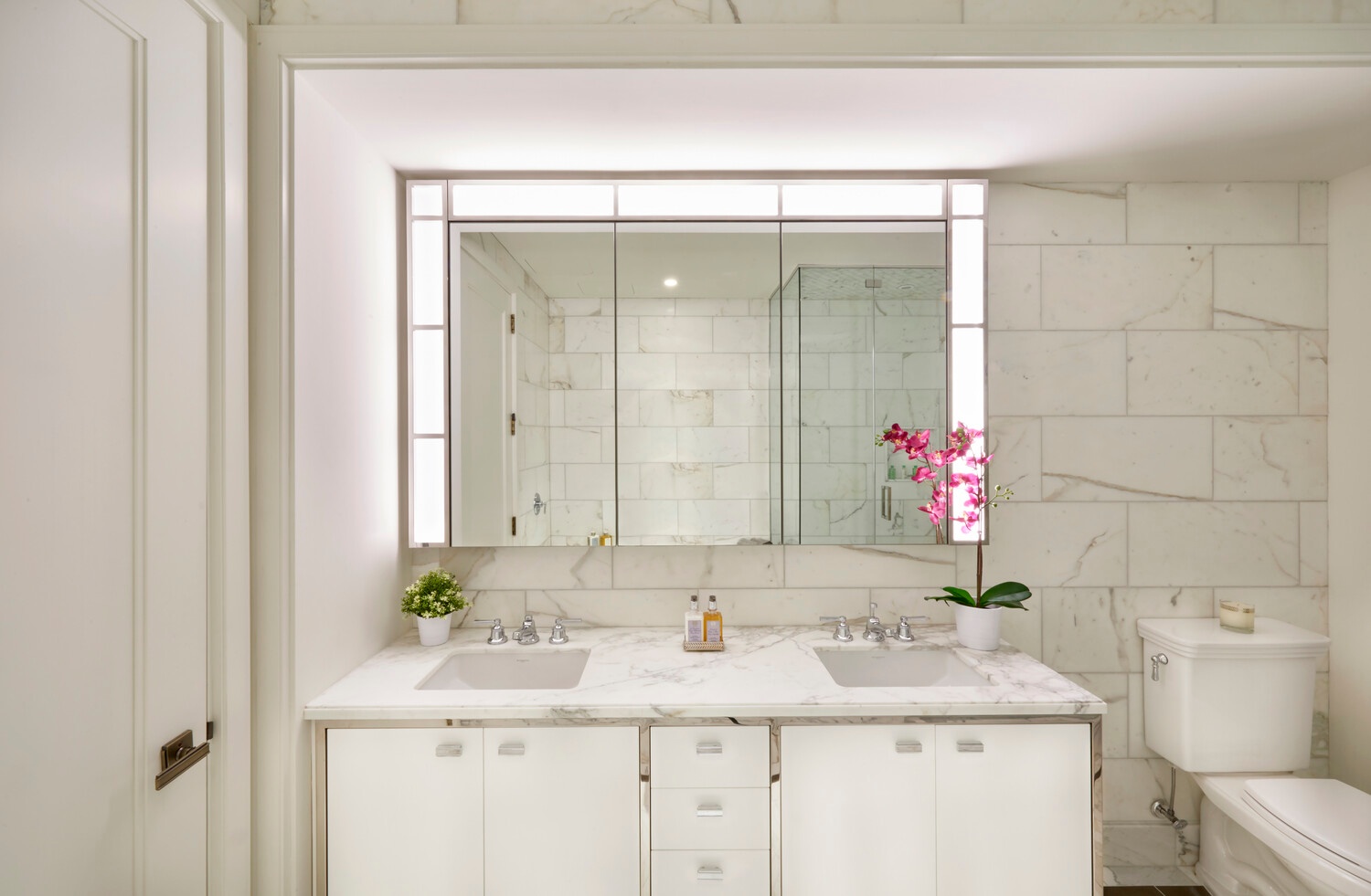 The sizable kitchen boasts custom stained oak cabinetry with antique brass finished hardware, Calacatta marble countertops and backsplash, recessed down-lights and under-cabinet lighting. Julian under-mount stainless steel sink, Franke waste disposer, Dornbracht pull-out faucet and a wall-mounted pot filler all add to the luxurious character of the space. Professional-grade stainless steel appliances consisting of a Sub-Zero refrigerator, Wolf six-burner gas range with recessed stainless steel vented wall hood and integrated oven, Miele speed oven/microwave, Miele dishwasher with custom millwork, and a Sub-Zero wine refrigerator exude an aura of both richness and comfort. All three bedrooms are substantial in both size and feature custom California Closets, allowing you to perfectly organize your personal belongings. The three custom designed bathrooms have Toto toilets, fixtures by Waterworks, and intricate tiling that conveys refinement. The extravagant master suite has two closets, an oversized bathroom with soaking tub, steam shower, marble radiant heat flooring, double vanity and medicine cabinet, all contributing to the feeling of opulence and indulgence.