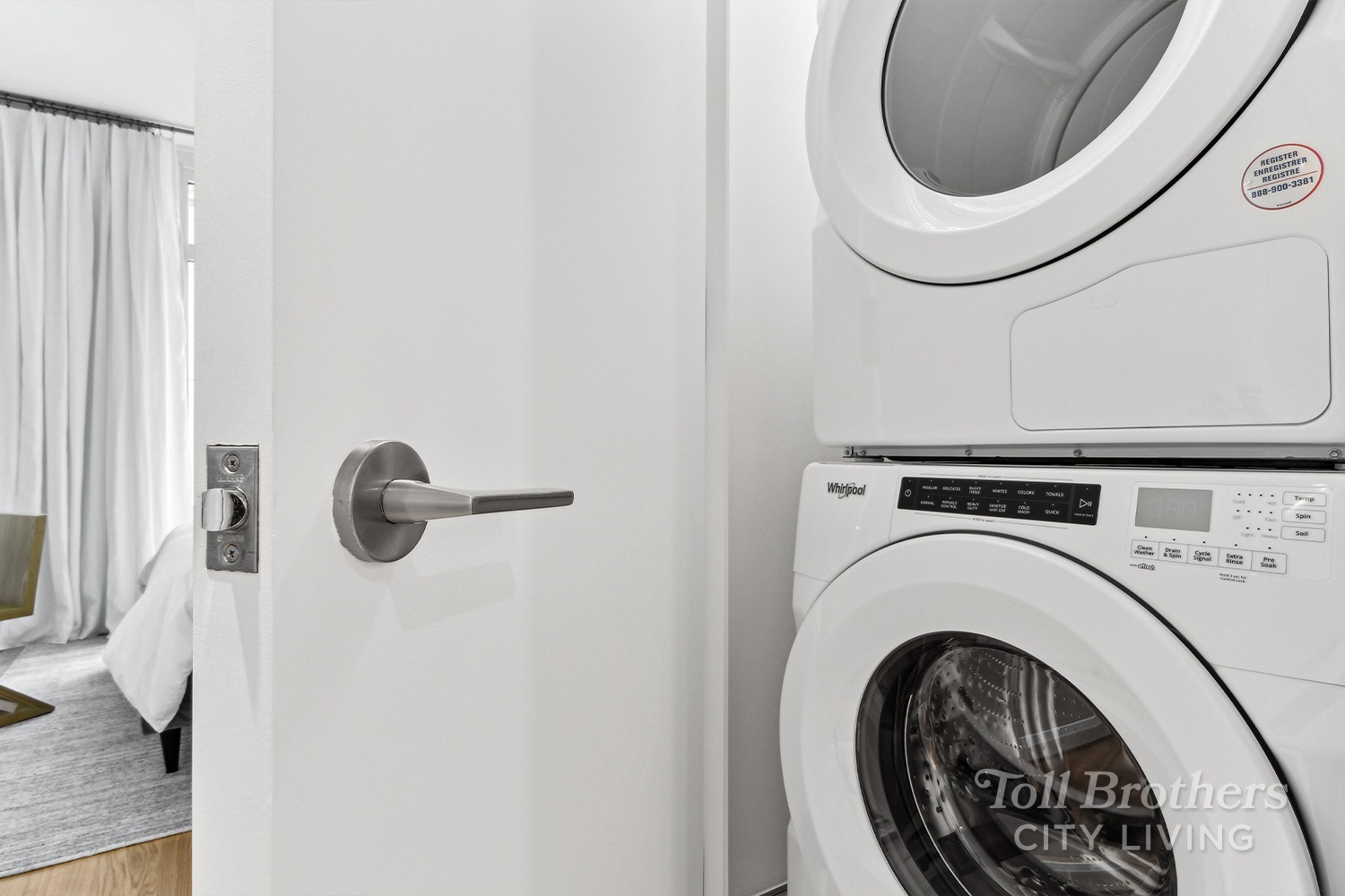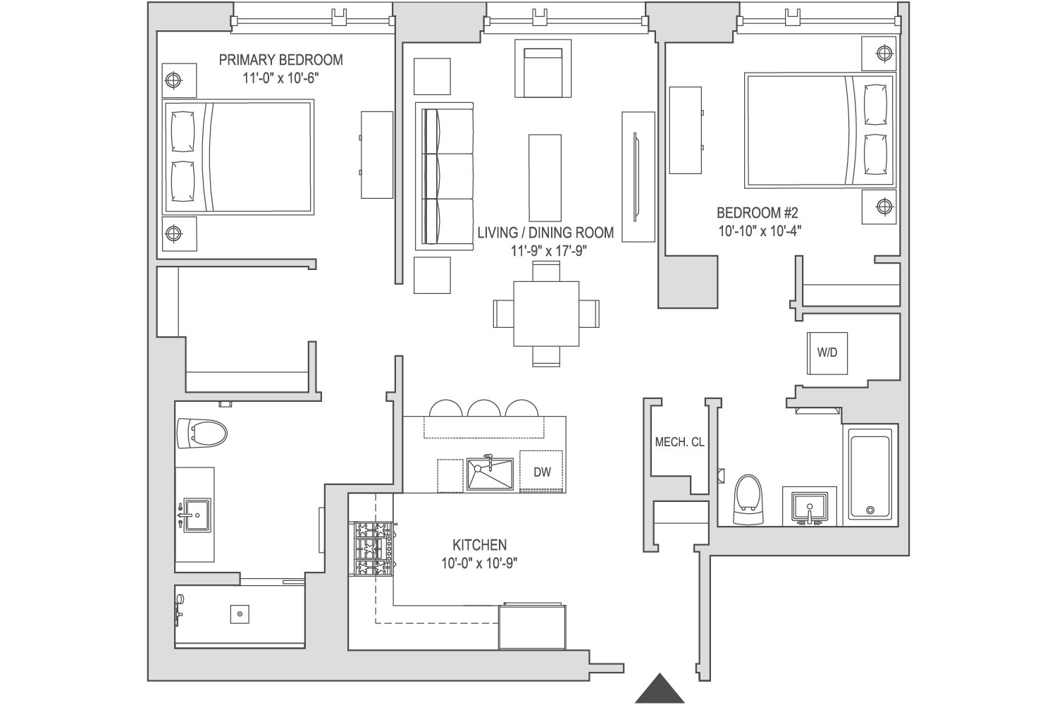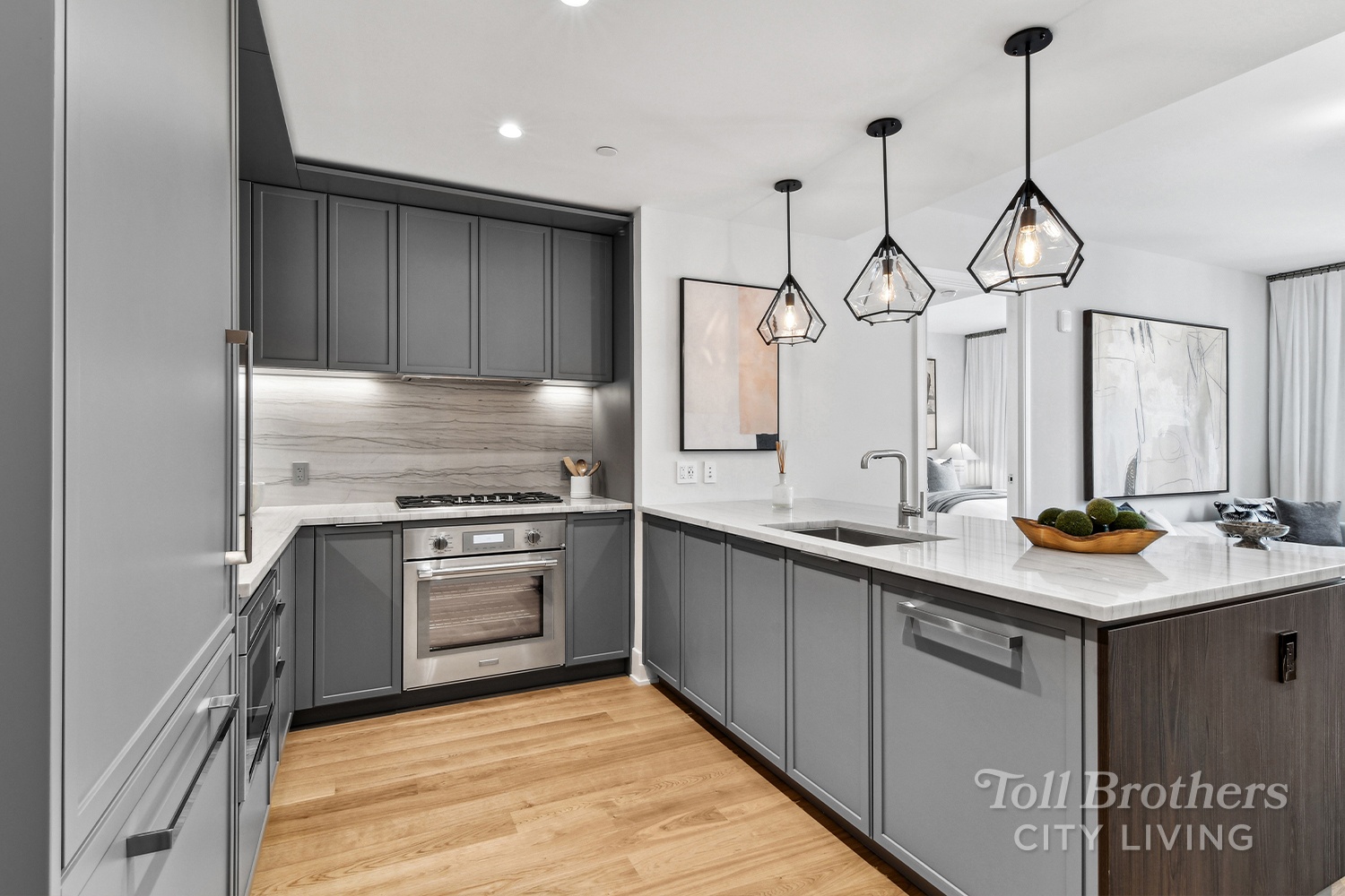 Residence 7G is a 1,015 SF 2-bedroom/2-bath home with an appealing open layout, 9’ ceilings, oversized windows and 5" white oak floors. This gracious and efficient split-bedroom residence overlooks quiet, tree-lined 103rd Street. The luxurious en-suite primary bathroom is clad in polished Bianco Estremoz marble and features Calacatta Delicato marble countertops and a custom Poliform vanity with ample storage. The second bathroom features a custom Poliform vanity topped with quartz, full-height Porcelanosa tiled walls, and a porcelain mosaic tile floor. The island kitchen features custom Poliform cabinetry with abundant storage, integrated Thermador appliances, and striking Brazilian quartzite countertops and backsplash. Each home is equipped with a full-size Whirlpool washer and dryer.