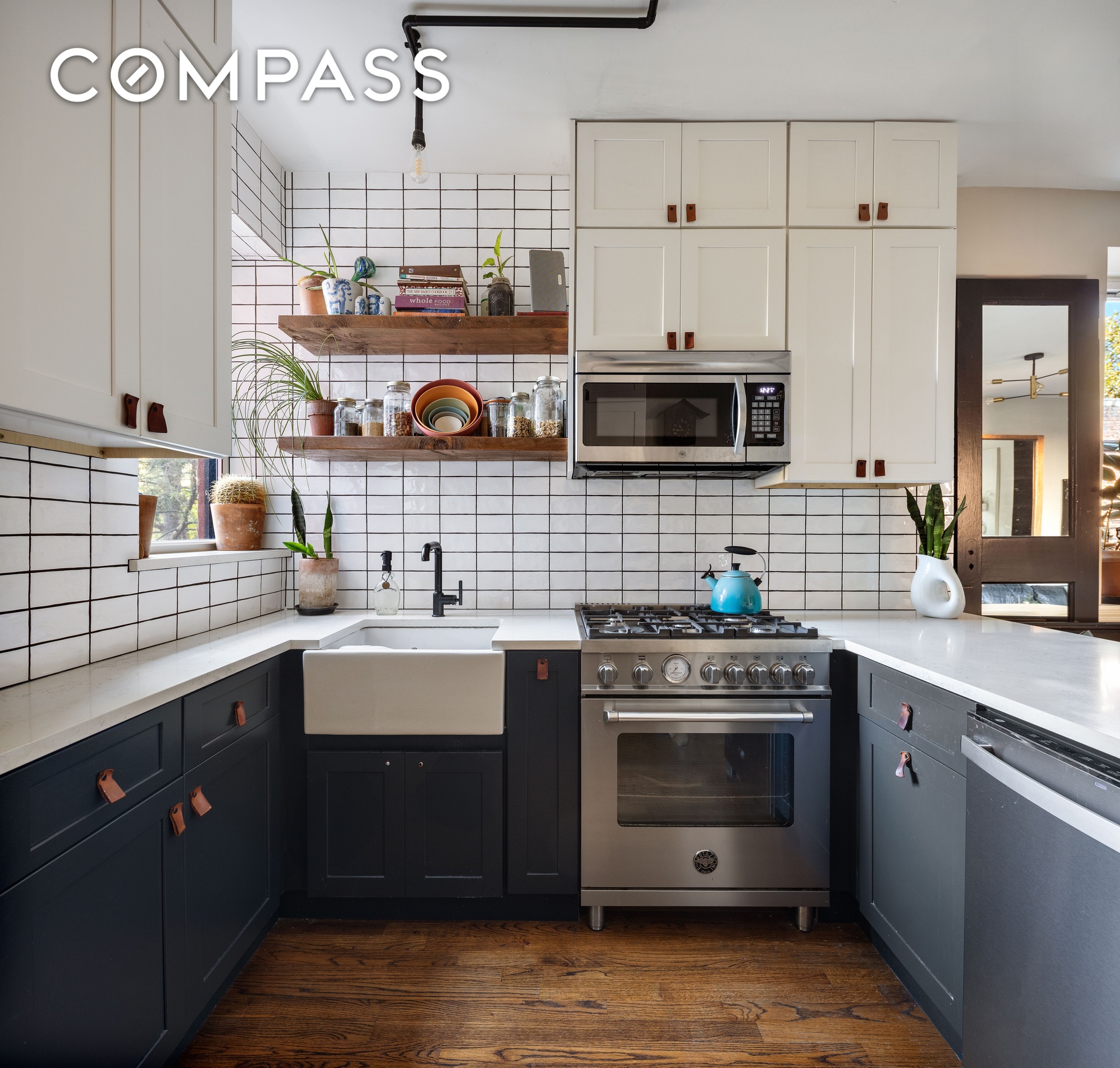 This airy apartment offers a gracious open living plan optimized for dining and entertaining. The newly renovated designer kitchen features custom handcrafted lighting, stunning open shelving and dual-tone cabinetry, a vented microwave, stainless steel appliances, and a Bertazzoni gas range. The window above the porcelain farmhouse sink makes washing dishes a pleasure. And the quartz-topped peninsula is perfect for entertaining.