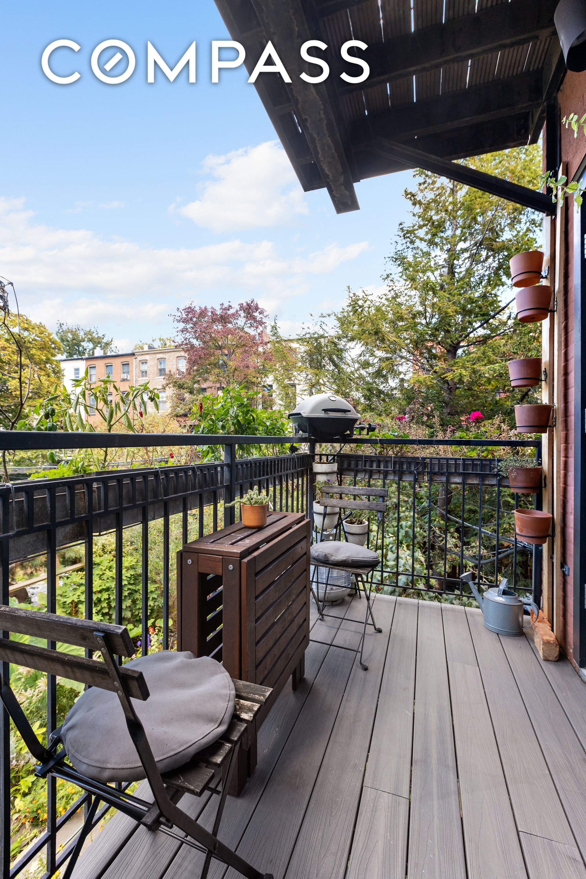 The spacious primary bedroom sits at the front of the building, with southeast light streaming through the large bay windows. The bedroom includes two spacious closets reaching the full height of the ceiling for maximum storage. The renovated, windowed bathroom, with its view of the building’s side yard, is a dream come true. The second bedroom, positioned at the opposite end of the apartment, opens to a deck overlooking leafy gardens below—a peaceful outdoor retreat rarely found at this price point.