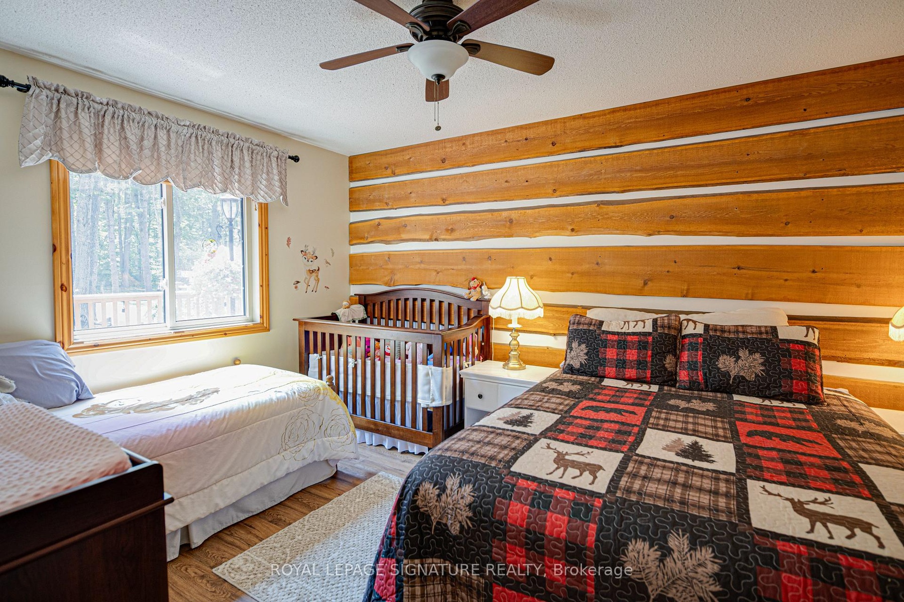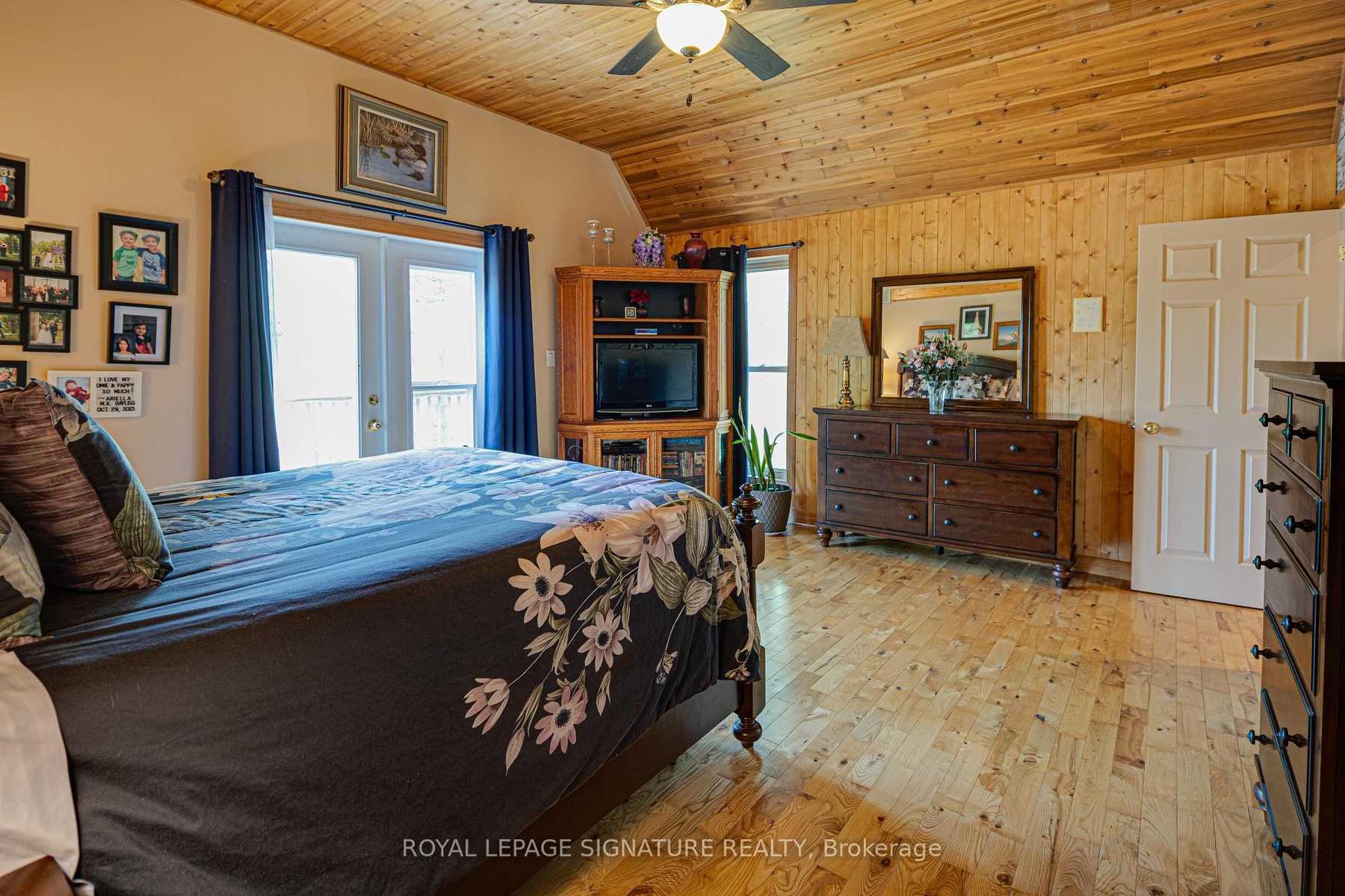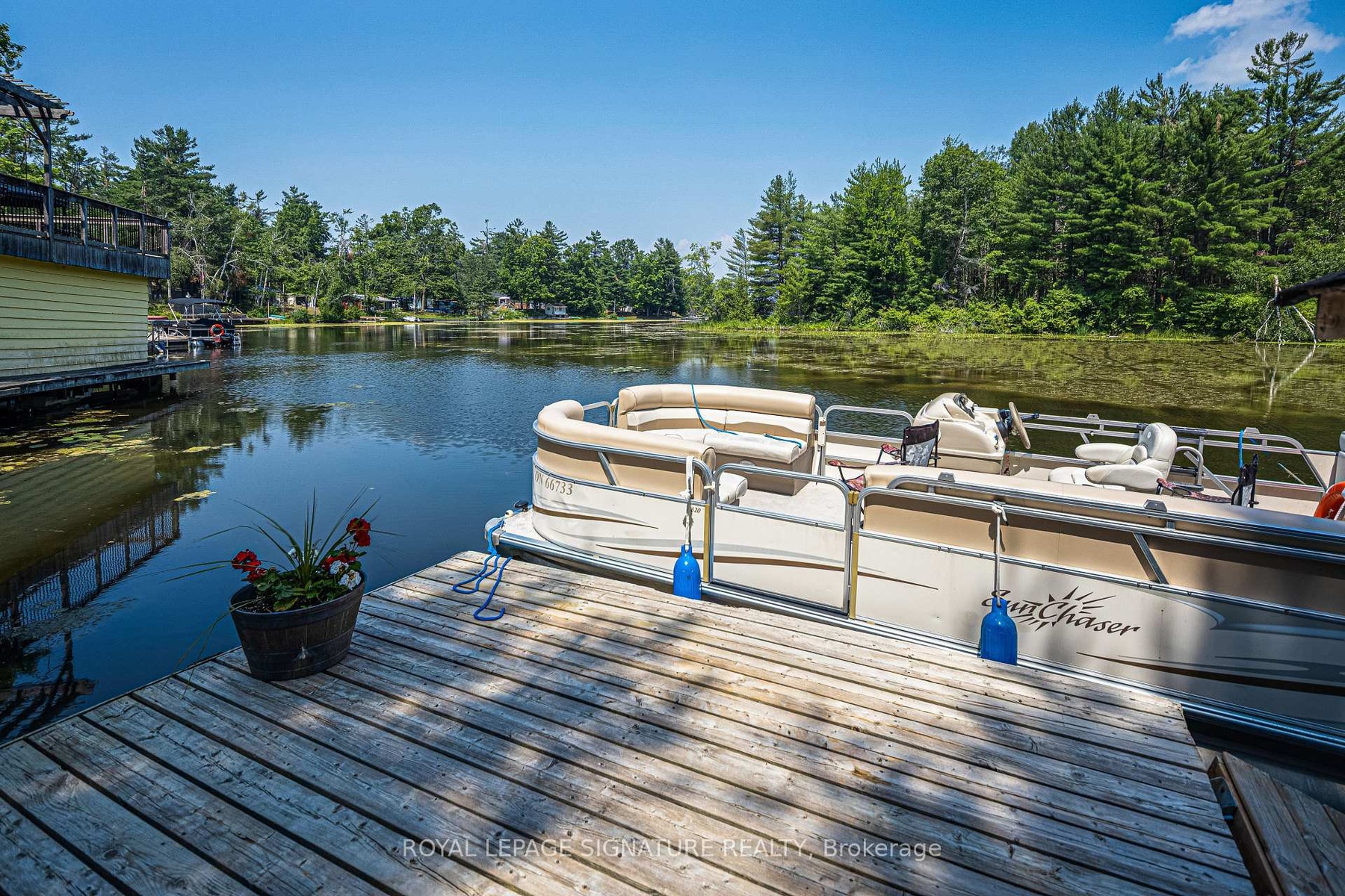 Postcard Perfect Waterfront Living! This beautifully maintained 3+1 bedroom, 3 bath year-round home offers big boat access to the Trent Severn Waterway and features cathedral ceilings, hardwood floors, and a floor-to-ceiling stone fireplace in an open-concept layout with multiple walkouts to a large deck showcasing stunning water views. The finished lower level includes a spacious rec room, games area, built-in sauna in the washroom basement and elevated wet bar-ideal for entertaining. The primary suite boasts a walkout balcony, 5-piece ensuite, walk-through closet, and private studio/office space. Enjoy deep water access, covered wet slip, plus attached and detached garages for all your waterfront lifestyle needs.