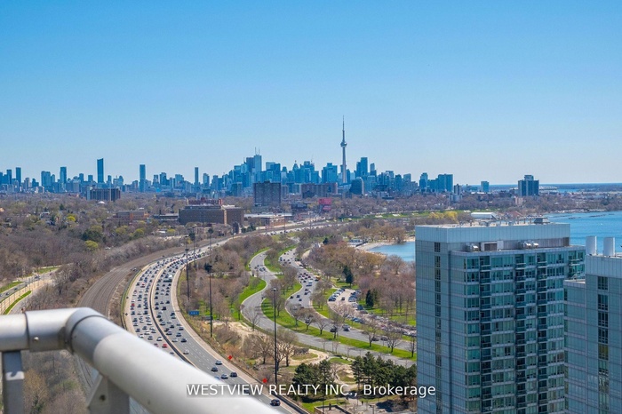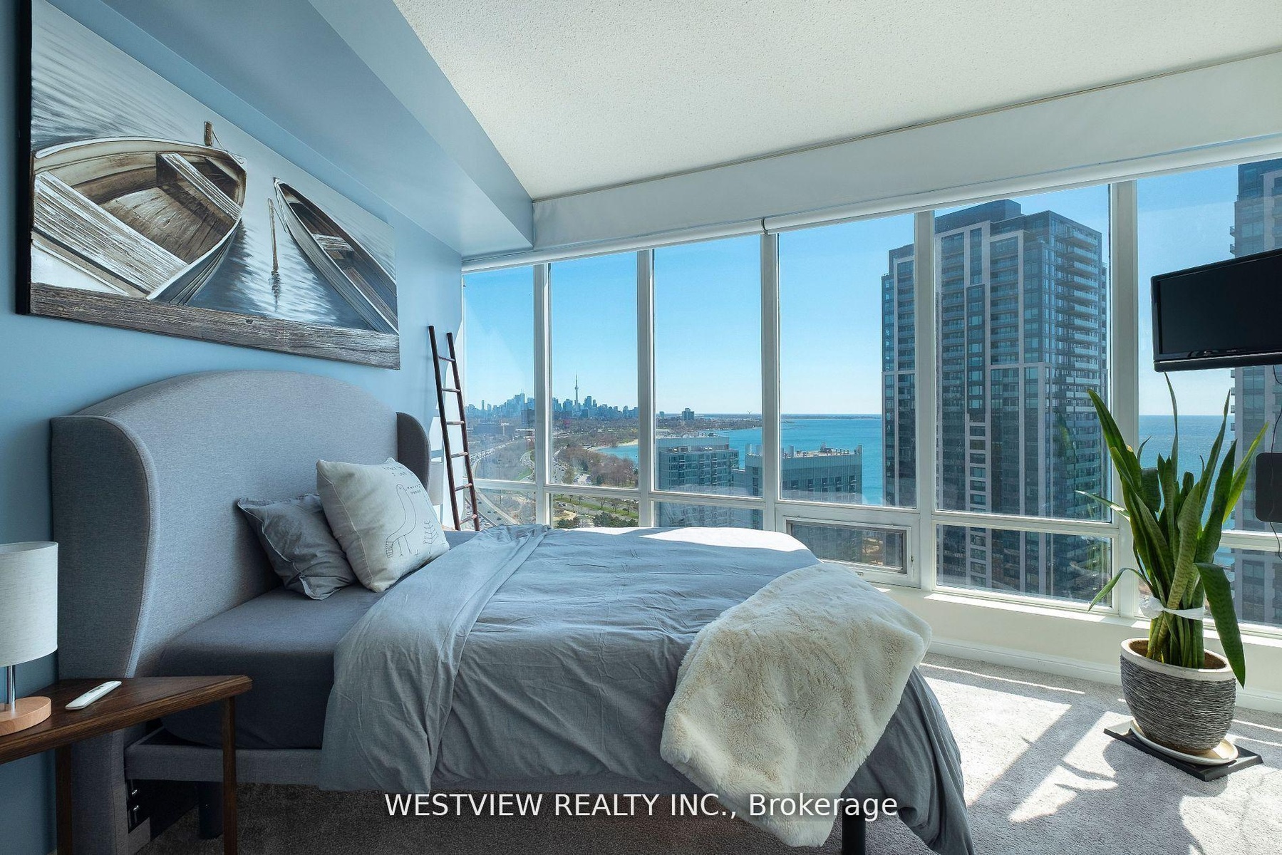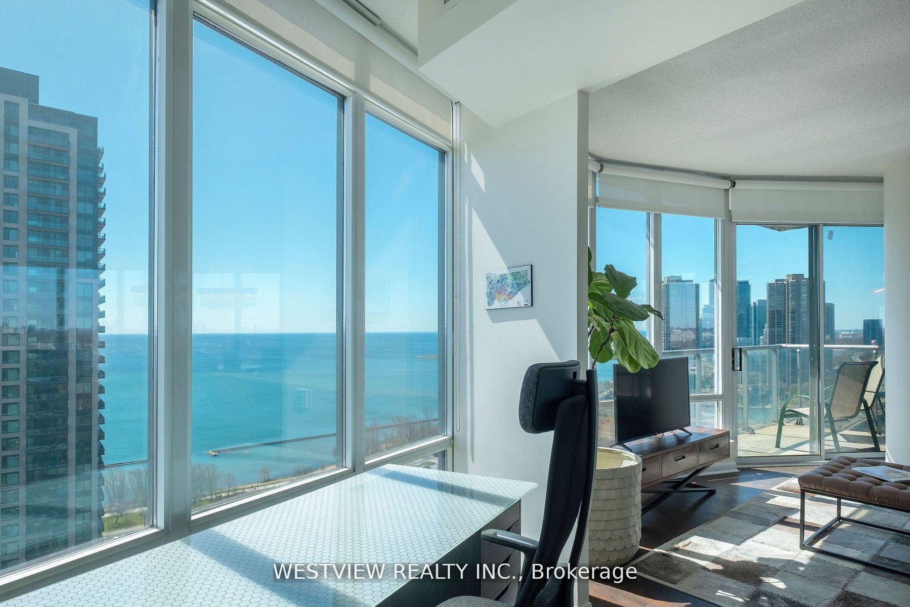 Good morning, Good afternoon & Good evening! That is what you can expect from this sun drenched two bedroom plus den waterfront gem, two floors from the top. Spanning over 1100 sqft of luxurious living space, offering very rare 270 degrees of stunning panoramic views. From the picturesque downtown skyline extending to Humber Bay, Grenadier pond and beyond. Enjoy both the colourful sunrises & sunsets along with watching planes come and go from both airports at a distance. All of which can be managed with your custom automated blinds. This is a Beautifully appointed condo, with post card views from all principal rooms. The modern kitchen features a large breakfast bar that overlooks the spacious living area & bright blue water of the lake. The bright den (potential office space) fit for any executive, features wrap around windows overlooking the Toronto downtown city-skyline as well as the lake to the west. Living in "Windermere By The Lake" you will be within steps to the miles of waterfront walking/ biking paths, High Park, Roncesvalles, Bloor West village, shopping, public transit & many more amenities. Building maint fee is all inclusive of utilities. New Electric vehicle charging station has also been installed for your parking spot, for your convenience, storage locker on 2nd floor. You will look forward to coming home here!