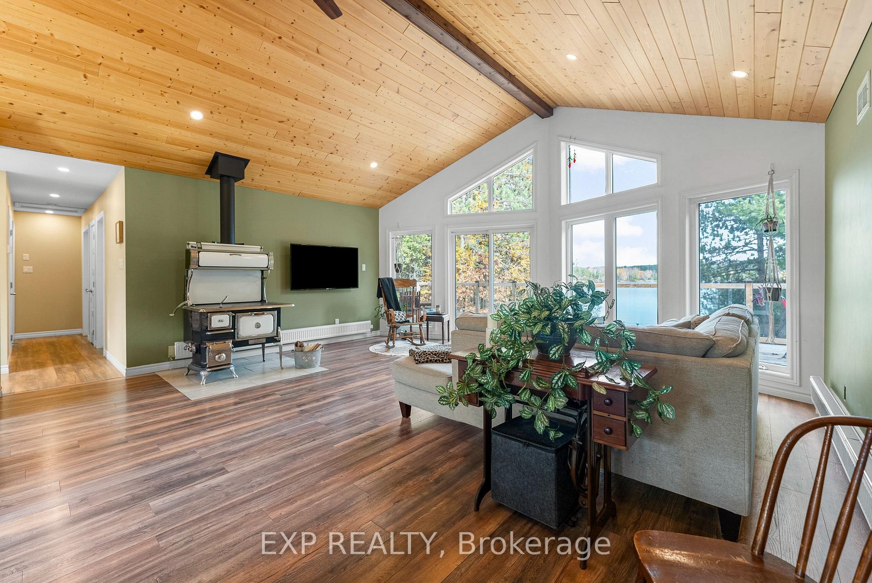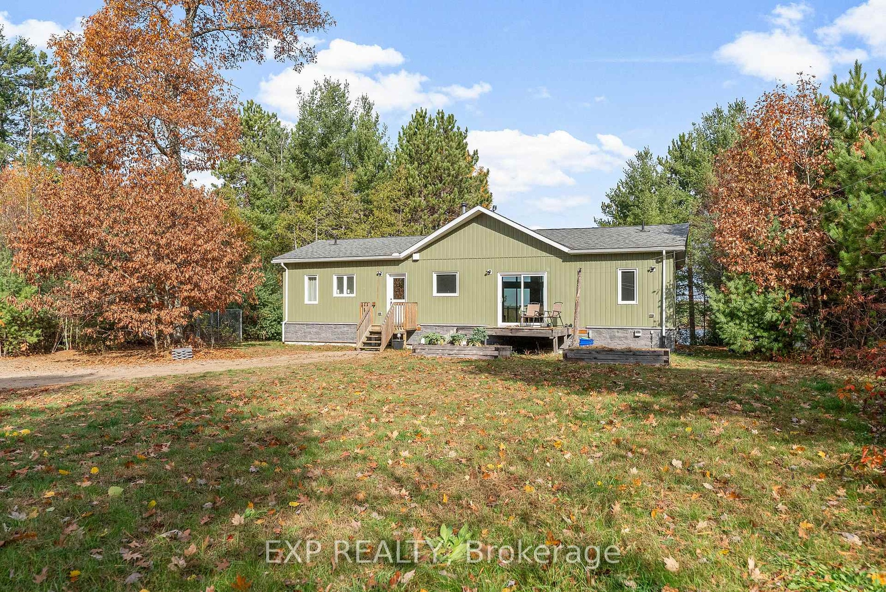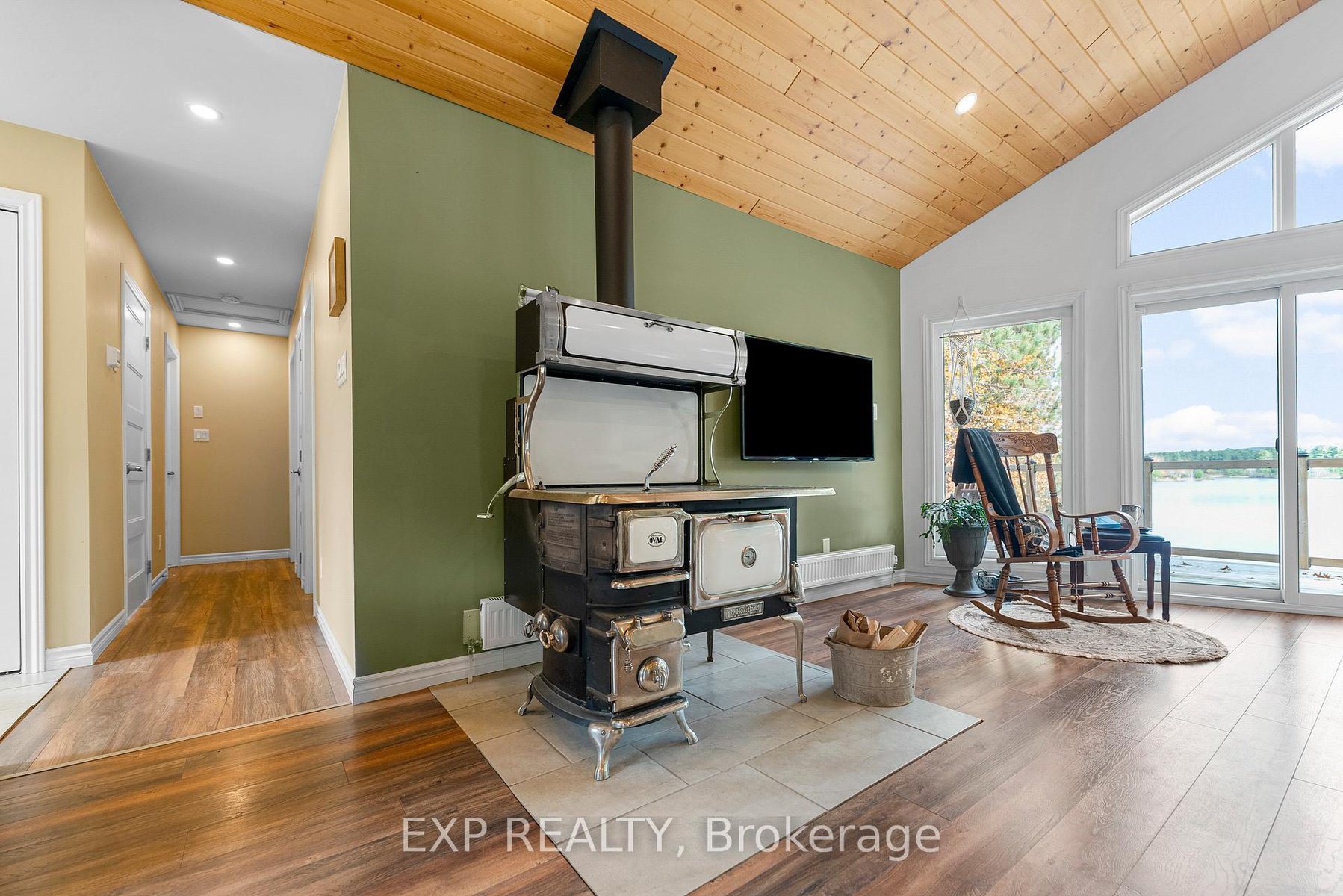 Newly built in 2019, 79 Warbler Way offers the perfect blend of comfort, craftsmanship, and natural beauty. This quiet oasis sits along the scenic shores of the Madawaska River, part of the sought-after Kamaniskeg Lake system offering over 90 km of boating, dining, and exploring opportunities.Step inside this 4-bedroom, 1.5-bath home and experience open-concept living at its finest. The vaulted ceilings, custom walnut kitchen with island, and timeless wood fire cookstove create a warm and inviting space filled with natural light. Walk out onto the sprawling deck and take in the tranquil waterfront views-ideal for morning coffee or evening sunsets. The primary bedroom features a convenient ensuite, already roughed-in for a shower of your choice. The main floor also offers laundry facilities, two additional bedrooms, and radiant heating for year-round comfort.The lower level, with towering ceilings and in-floor heat, doesn't feel like a basement. It includes a large recreation area with a walkout to the waterfront, a fourth bedroom, and a plumbed bathroom ready for your finishing touches.This home is off-grid solar powered with generator backup and the option to connect to hydro. Heating is provided by an outdoor wood furnace, supplemented by propane for efficiency. Beautiful landscaping leads to a sandy beach with a gentle slope into the water-perfect for swimming and family fun.To make this opportunity even better, the sale includes an additional vacant lot (MLS #X12499588), offering space to expand, build, or simply enjoy as a private buffer. Whether you're seeking a peaceful retreat or an active lifestyle on the water, 79 Warbler Way delivers it all.