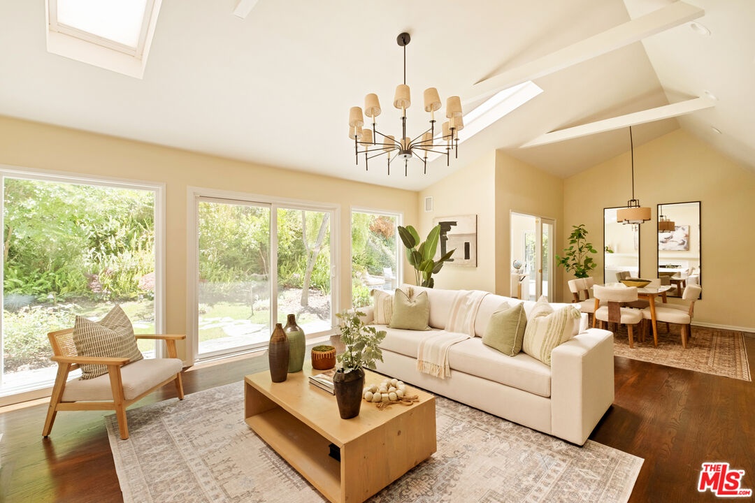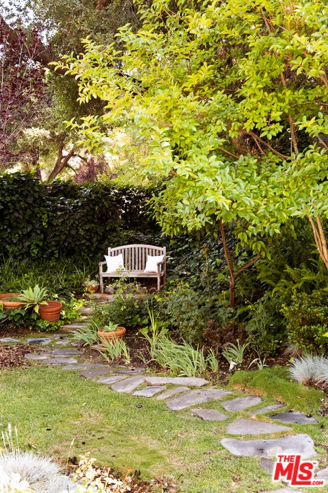 A garden hideaway in Mandeville. This sophisticated California Ranch home offers over 2,100 sq.ft. of well-designed living space on a lush 14,000+ sq.ft. lot. Walled and gated for privacy, the front yard opens to a charming porch and a warm welcoming interior that blends comfort, versatility, and timeless charm - set against a backdrop of vibrant landscaping and canyon greenery. A formal entry leads into vaulted living and dining rooms with dark refinished oak floors, a fireplace, and walls of glass that open to the backyard. Skylights throughout the home fill the space with natural light, and the living room, sunroom, and primary suite all connect seamlessly to the rear yard, where grassy areas and a flagstone patio surround a freeform pool framed by citrus trees and lush plantings. The kitchen is bright and functional, featuring stainless steel appliances and room for a breakfast table with views of the front garden - and one of Brentwood's only vineyards just across the street. Two bathrooms have been tastefully updated, and a third has been completely remodeled. A separate laundry room adds ease to daily living. The oversized den - with vaulted ceilings and matching wood floors - is ideal for a gym, studio, media room, or flexible second living area. In the bedroom wing, two guest rooms share a Jack and Jill bath, while the spacious primary suite includes vaulted ceilings, a fireplace, walk-in closet, and en-suite bath. Additional features include central HVAC, dual-pane windows, recessed lighting, and a two-car garage with direct entry. Lush, light-filled, and full of soul - this is Mandeville living at its best. Minimum of a 1-Year Lease. Tenant to Pay ALL Utilities.