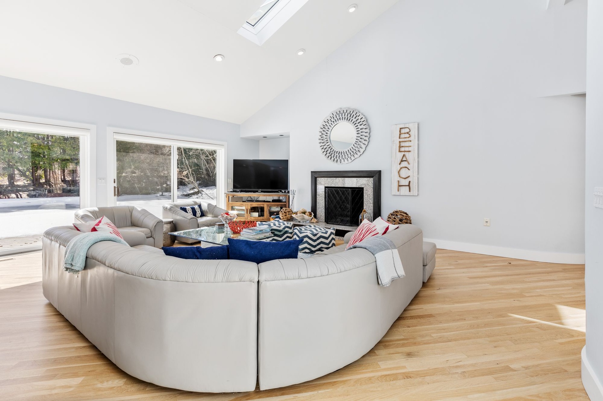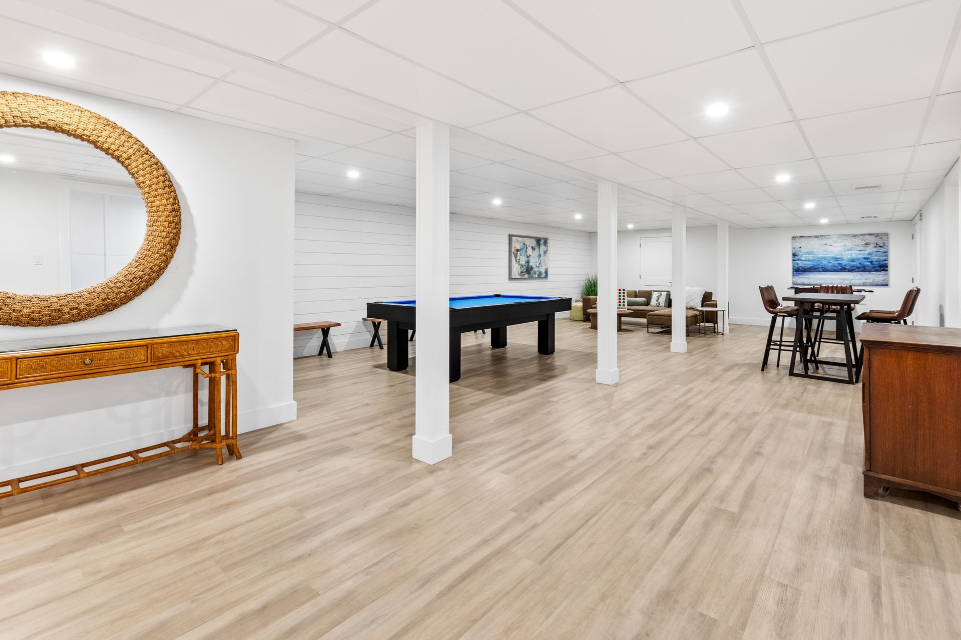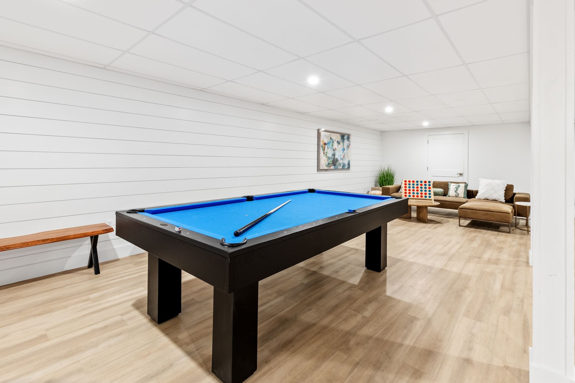 The finished lower level includes an additional bedroom with a half bath, a den, and a recreation area with a pool table and foosball. Outside, enjoy the heated pool, spacious deck, and tennis.
