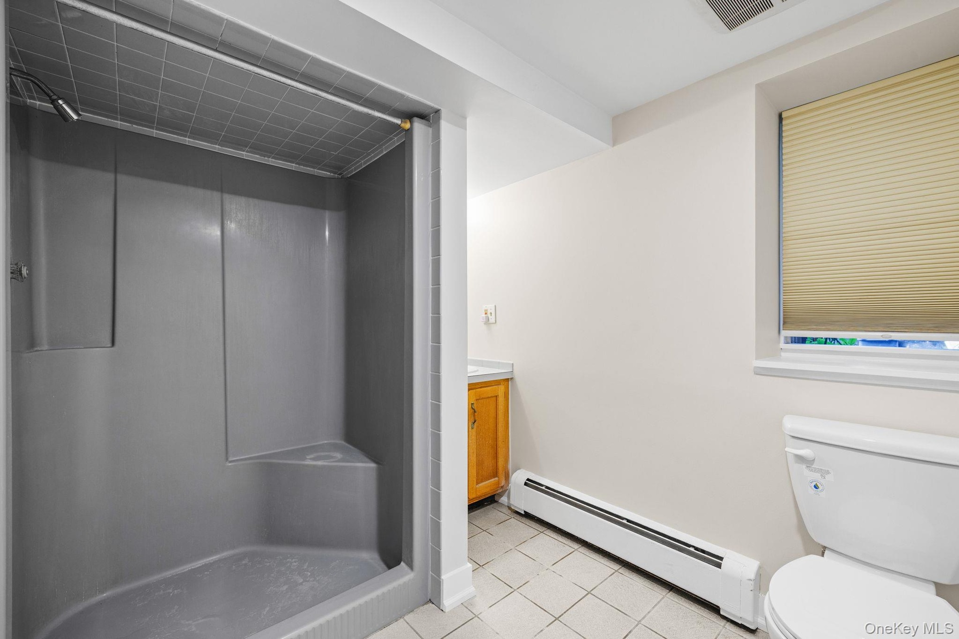 - Bathroom featuring a baseboard heating unit, light tile patterned floors, a stall shower, and vanity