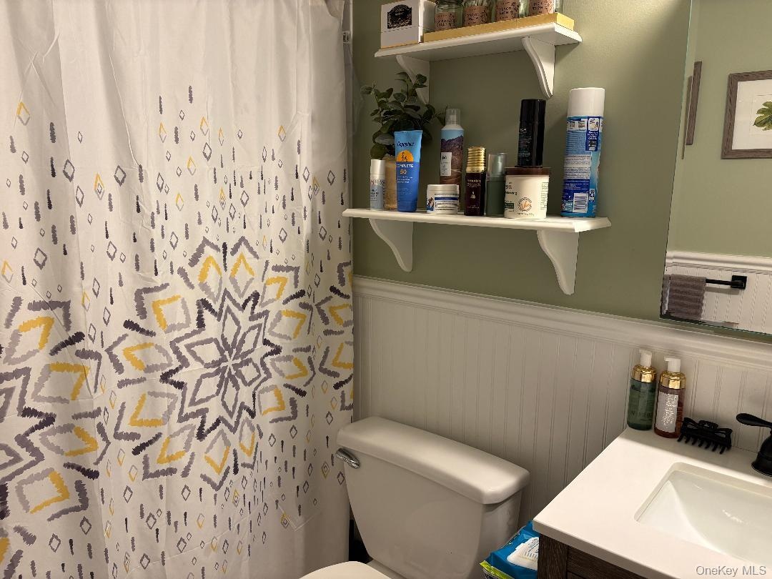 - Full bath with a shower with curtain, wainscoting, and vanity