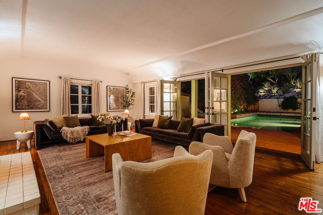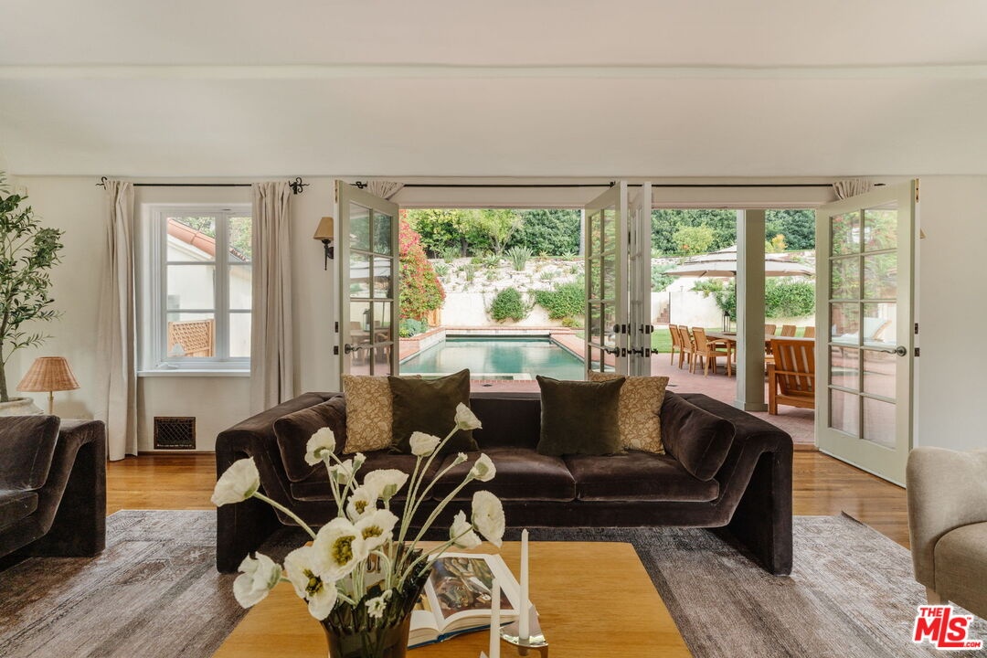 Discover this exquisite Spanish estate tucked away on a quiet, tree-lined street in the coveted Lake Hollywood Knolls. Offering a secluded sanctuary of timeless character and beauty, this residence captures the essence of authentic Spanish architecture with thoughtful details and enduring elegance. As you arrive, custom Spanish tiles grace the front stairs and landing, highlighting the home's timeless charm. Inside, no detail has been overlooked. A formal foyer welcomes you into sunlit interiors where each room is generously sized and designed with both comfort and style in mind. Rich oak hardwood floors flow throughout, while custom wrought iron handrails add an unmistakable touch of craftsmanship and refinement. The main level unfolds seamlessly, revealing warm, inviting spaces meant for both everyday living and entertaining. The living room centers around a beautiful fireplace and opens through French doors to the stunning backyard, creating effortless indoor-outdoor flow. A formal dining room offers the perfect setting for gatherings, and the chef's kitchen impresses with custom cabinetry, high-end appliances, and abundant natural light. Two spacious bedrooms complete the downstairs, including one with direct backyard access through French doors, along with a beautifully appointed full bathroom. Outside, the grounds are truly spectacular. The yard features California-inspired, drought-tolerant landscaping surrounded by lush greenery, mature bougainvillea, and two expansive lawns. A custom-built pool and spa serve as the centerpiece of this entertainer's retreat, complemented by multiple seating areas that invite relaxation and connection. Upstairs, two additional bedrooms include the serene primary suite, complete with a fireplace, sitting area, and an oversized balcony overlooking the verdant grounds below. Rare for California, the property also includes a spacious basement offering a temperature-controlled wine cellar and over 1,100 square feet of additional space not included in the home's square footage. This versatile area provides endless potential for storage and creative use, setting this estate apart from anything else in the area. With timeless details, effortless indoor-outdoor living, and an undeniable sense of tranquility, this home is a Spanish estate of rare caliber, exquisite, enduring, and one-of-a-kind.