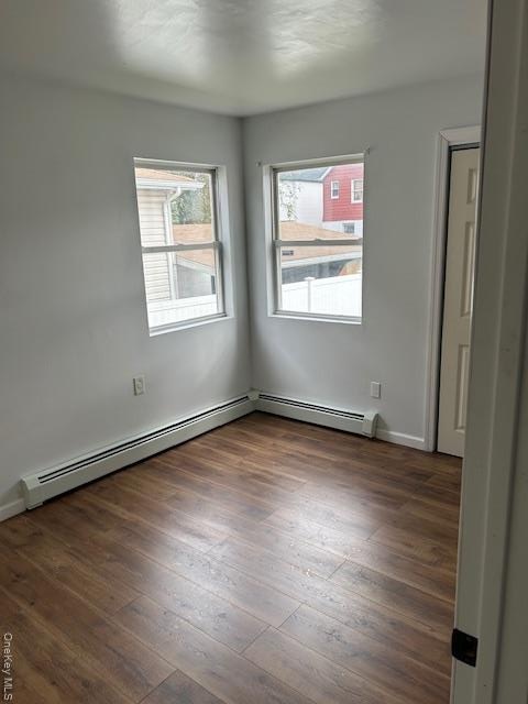 - Spare room featuring plenty of natural light, dark wood-style floors, and a baseboard heating unit