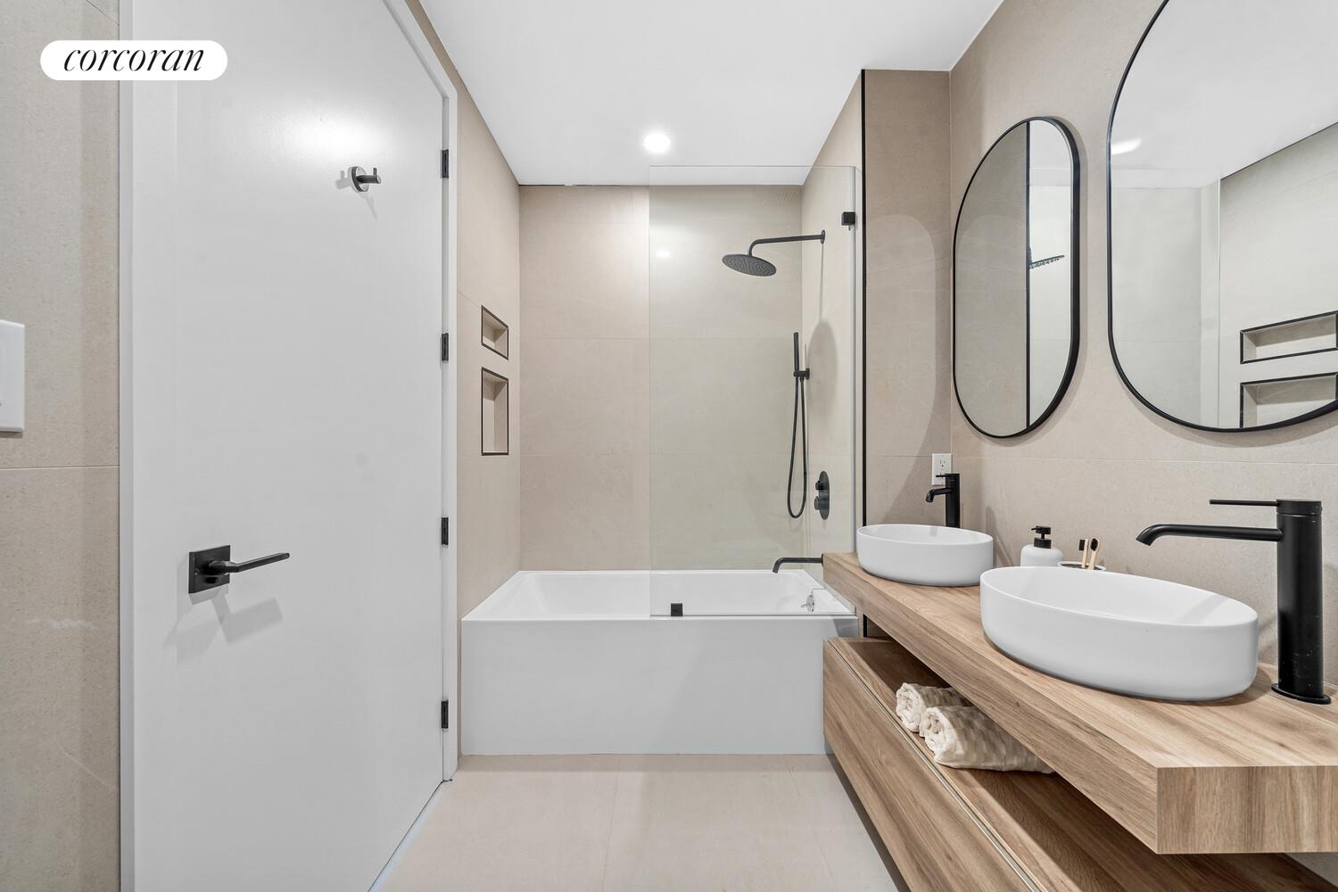 Each bathroom exudes serene sophistication, adorned with ivory matte porcelain tile, Luchena Bath vanities with Quarzo vessel sinks, and Opera shower systems with both wall-mounted and hand-held fixtures in a black matte finish. The primary suite features a 24 Niagara vanity and deep soaking tub, creating a tranquil retreat.
