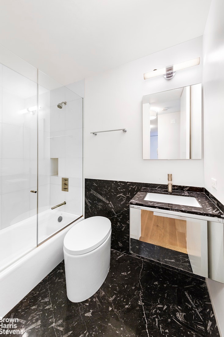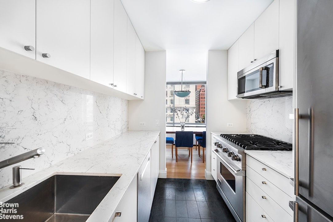 The renovated kitchen has white cabinetry, high end appliances and gorgeous countertops & backsplash. This corner living/dining area with rounded windows receives an abundant amount of sunlight and has views up and down the Broadway Mall.The Dining area also has the potential to be converted into a third bedroom as an added bonus to this most sought after line! The Master Bedroom has an ensuite renovated bathroom with limestone walk in shower and smartly added cabinets built into the wall for additional storage. This bedroom has generous outfitted closets including a walk in and hidden drawers for that sleek modern feel. The second bedroom is configured as an office by day and bedroom by night with the expertly designed murphy bed/couch built into the wall with custom shelving and closets. There is a built in desk in this room as well. Completely turnkey with new floors, new built-ins and window treatments.