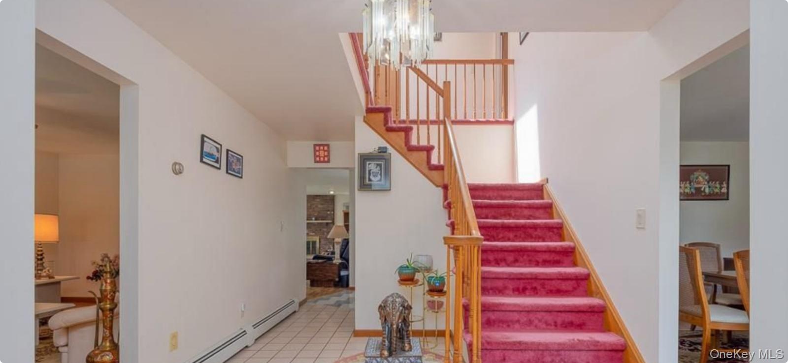 - Stairs with a chandelier, tile patterned flooring, and baseboard heating