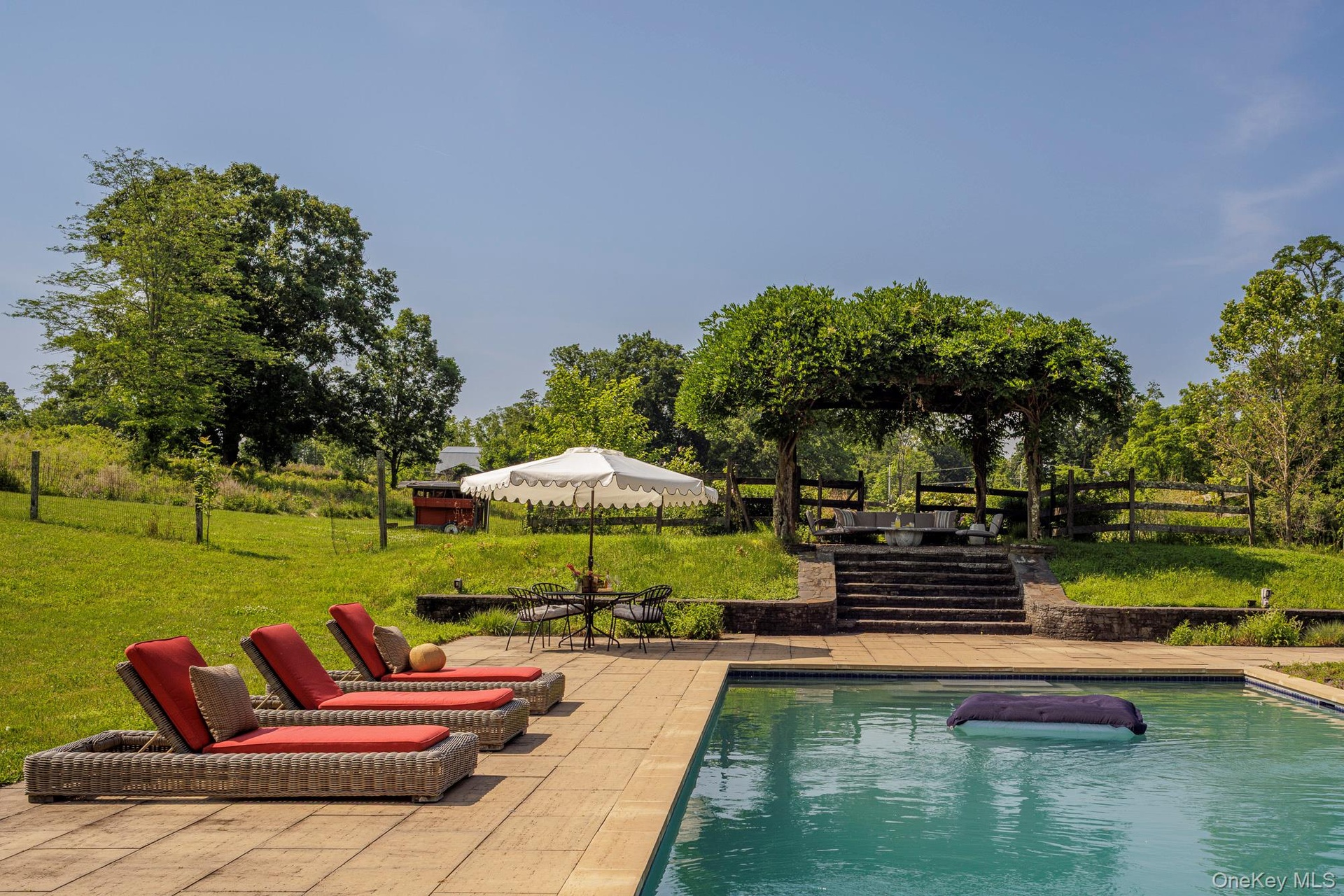 Rhinebeck Luxury Farmhouse Rental Experience timeless elegance and modern comfort at this exceptional four-bedroom solar-powered farmhouse, set on over five private acres adjacent to an historical Hudson River Valley estate and equestrian facility of over 650 acres. Originally constructed in the mid-1800s and thoughtfully modernized over the decades, the home was fully renovated in 2024 to include every contemporary amenity. Perfect for both relaxation and entertaining, the residence features 4 bedrooms, 4.5 baths, and comfortably accommodates up to seven guests. Gather with family and friends in the beautifully designed chef's kitchen, unwind and dine alfresco on the wraparound porch overlooking the river, or float in the heated saltwater pool surrounded by lush pick-your-own seasonal gardens, all less than 1.5 miles from Amtrak and less than 10-minute drive from the boutiques and fine dining of Rhinebeck Village. The property is thoughtfully equipped for effortless living and entertaining, featuring a beautifully appointed kitchen with an induction cooktop, microwave/convection oven, blender and smoothie maker, tea kettle, coffee maker, toaster oven, dishwasher, and a full-size refrigerator. Throughout the home, modern conveniences include a steam shower, whole-house generator, Bluetooth sound system, high-speed internet, porch fans, outdoor lighting, smart TV, standby property concierge services, a fully supplied wood-burning fireplace, and a comprehensive security system. The well-designed laundry and mudroom offer a washer and dryer, humidifier and dehumidifier, as well as an iron and ironing board for added comfort and ease. For equestrian enthusiasts, a private facility is available on the rental home property featuring a four-stall barn, four turnout paddocks, and a private outdoor arena. Nature trails are open for peak season rentals, leading to the main equestrian facilities which include large indoor and outdoor arenas with modern footing. Rates for dry or full board, as well as equestrian use are available upon request. Available year-round, with flexible rental terms including three-day minimums, weekly, monthly, and seasonal stays. Peak season runs from Memorial Day through Labor Day, as well as during HITS competitions, the New York State Sheep & Wool Festival, and long federal holiday weekends throughout the year. Annual rates available upon request. Rentals 30-days and longer include weekly cleaning service. Rental Rates in USD Daily 2,000/night peak 1,200/ night off peak Weekly 10,000 week peak 6,500 week off peak Monthly 30,000 month peak 18,500 month off peak Total peak summer - 75,000 Total peak + HITS late season = 80,000 Yearly by request 4 stable barn, 4 private turnout paddocks, private outdoor arena is available for rent price by request, dry and full board available. Peak = Memorial Day through Labor Day