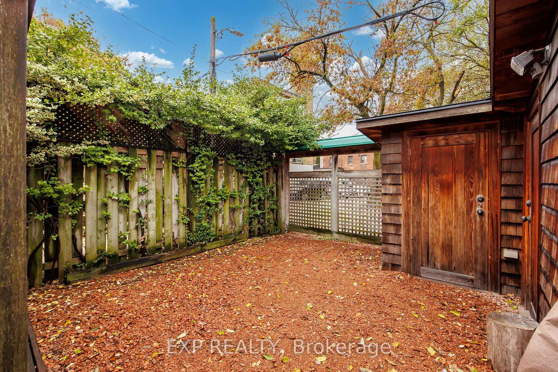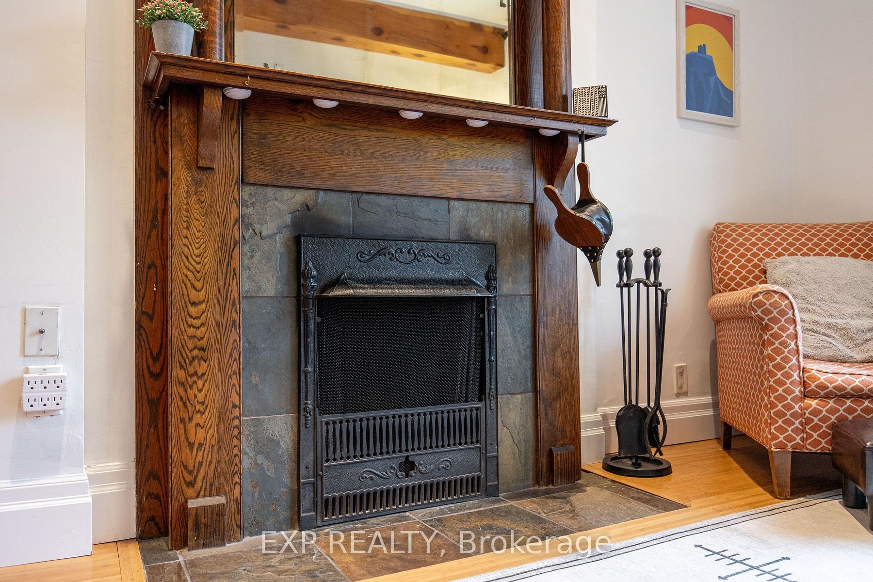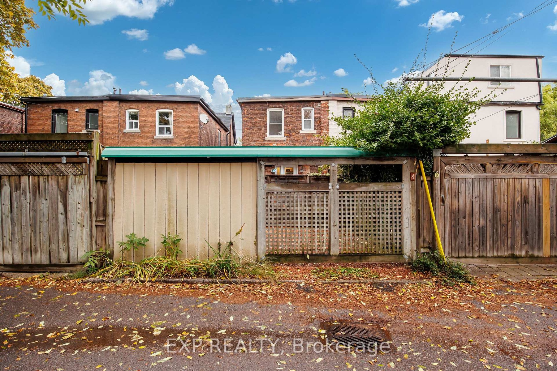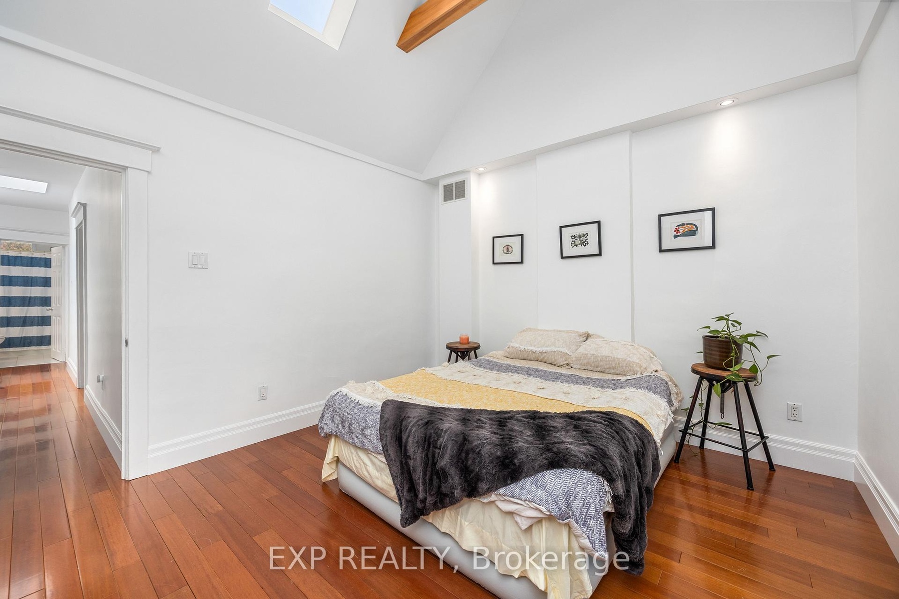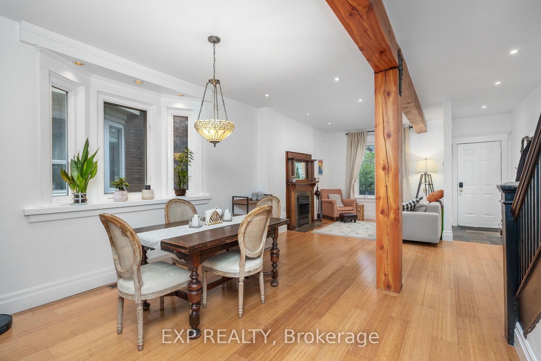 Welcome to this timeless red brick semi on one of Leslieville's most picturesque, tree-lined one-way streets.The home exudes character from the moment you step inside, with exposed wooden beams adding warmth and distinction to the spacious living and dining areas. A majestic fireplace anchors the living room, while high ceilings and pot lights create a bright, open ambience. The dining room bay window fills the space with natural light. Upstairs, the primary bedroom impresses with vaulted ceilings, exposed beams, a skylight and a large bay window overlooking the leafy street below. Two additional bedrooms offer flexibility for family and guests. A full bathroom serves the second floor, while a modern second full bath in the basement adds convenience and flexibility. The basement, accessible by a separate entrance, features sound insulation, excellent ceiling height, and professional waterproofing-perfect for a private suite, home office, or recreation space. Step outside to a private backyard deck ideal for outdoor dining and relaxation, with the added bonus of a very rare laneway parking spot. All this, just around the corner from Queen East's vibrant mix of cafés, restaurants, boutiques, and the TTC streetcar, making city living effortless and inspiring.