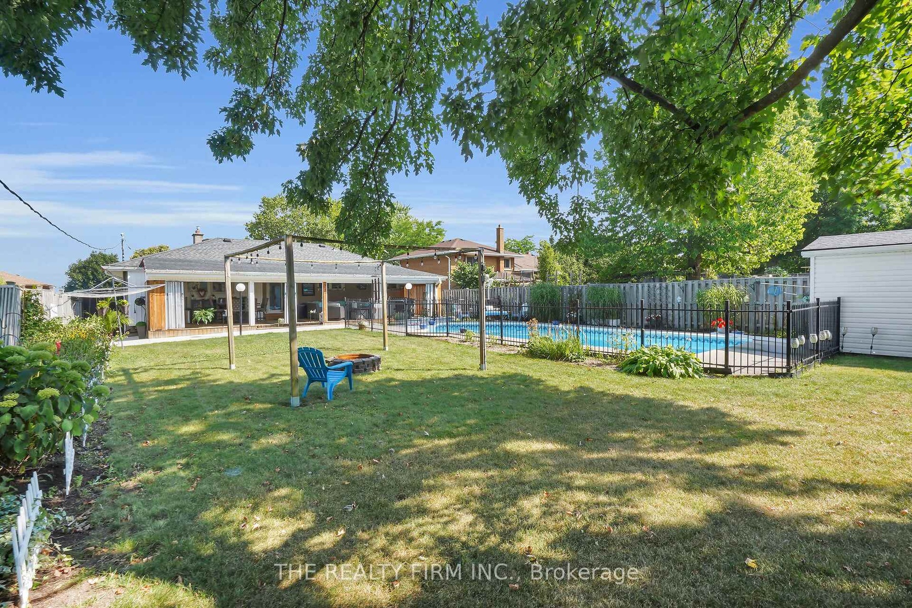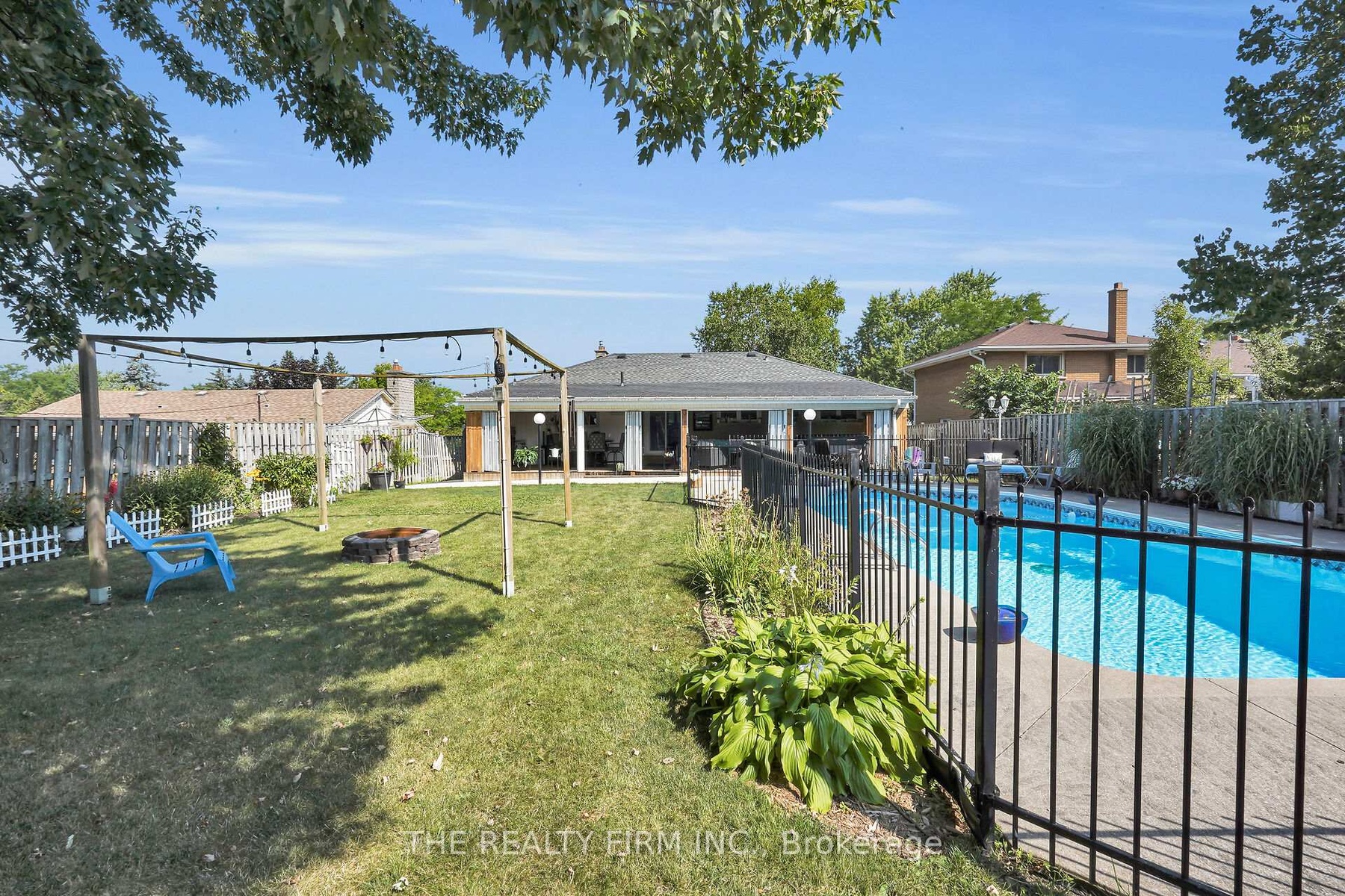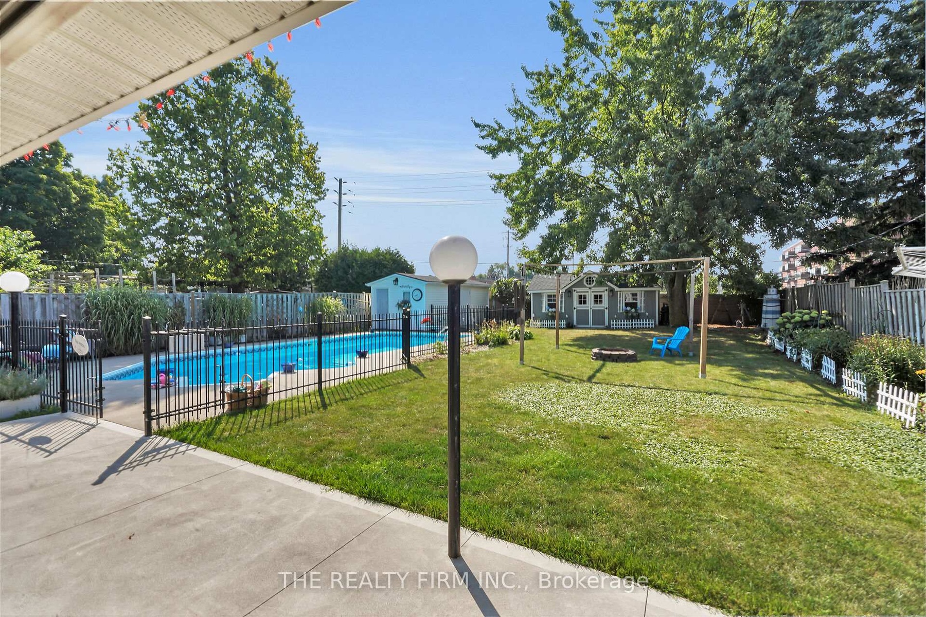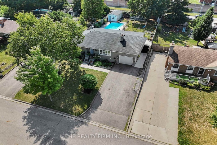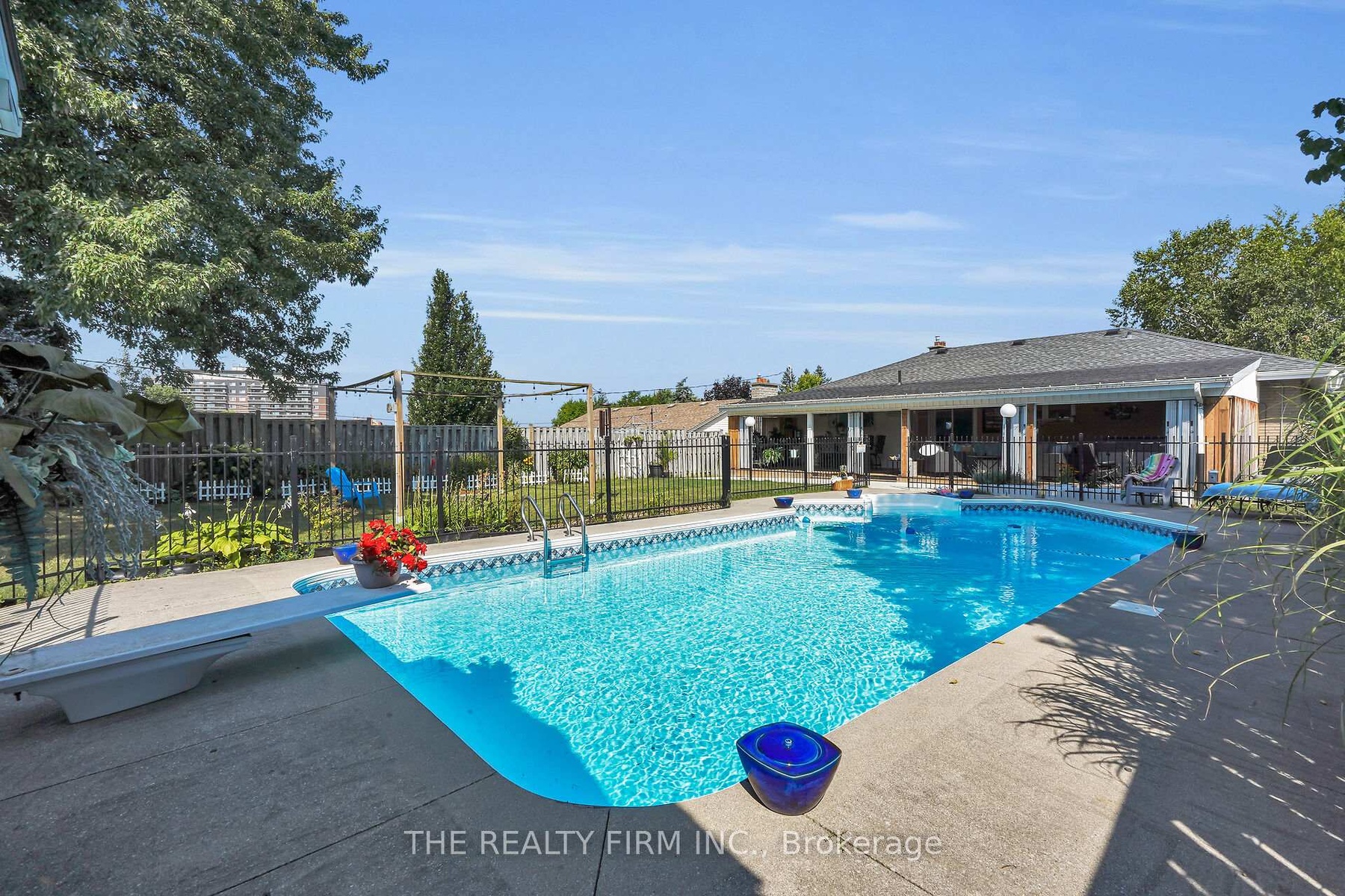 Welcome to this beautifully maintained all-brick one-storey home that blends classic charm with extensive updates for modern living. Situated on a large, private lot with a fenced-in pool, this property is perfect for families or anyone who enjoys both comfort and entertaining. The home offers three bedrooms, two full bathrooms, and a spacious single garage, along with thoughtful upgrades inside and out. Step into the inviting living room, where a wood-burning fireplace creates a cozy focal point, complemented by California shutters and durable water-repellent, non- slip flooring installed in 2013. The bright and expansive galley kitchen features plenty of cabinetry, 2021 dishwasher, and a 2013 patio door with built-in blinds that opens to a 3-season sunroom overlooking the pool. Hardwood floors in the bedrooms add warmth and character, while the fully renovated main-floor bathroom provides a modern touch.The finished lower level includes a large rec room, second full bath, and convenient laundry area with washer and dryer. With carpeting and underlay updated in 2007, this versatile space is ideal for family gatherings, a playroom, or a home office. One of the homes standout features is the impressive three-season sunroom, rebuilt with glass bifold doors in 2022, offering more than 40 feet of space for relaxation and entertaining. Outside, the backyard is a private oasis with a 10-foot deep in-ground bromine pool, featuring a safety cover, heater, liner (2017), pump (2015), and brand-new sand filter (2025). Concrete walkways (2019, 2022), custom railings, and a side security entrance enhance both curb appeal and function. Major mechanicals and updates provide peace of mind, including furnace and humidifier (2020), central air (2022), garage door opener (2021), and 40-year shingles. With neutral décor, a large yard, and proximity to highways, hospitals, and amenities, this home is move-in ready and offers a rare combination of indoor comfort and outdoor enjoyment.