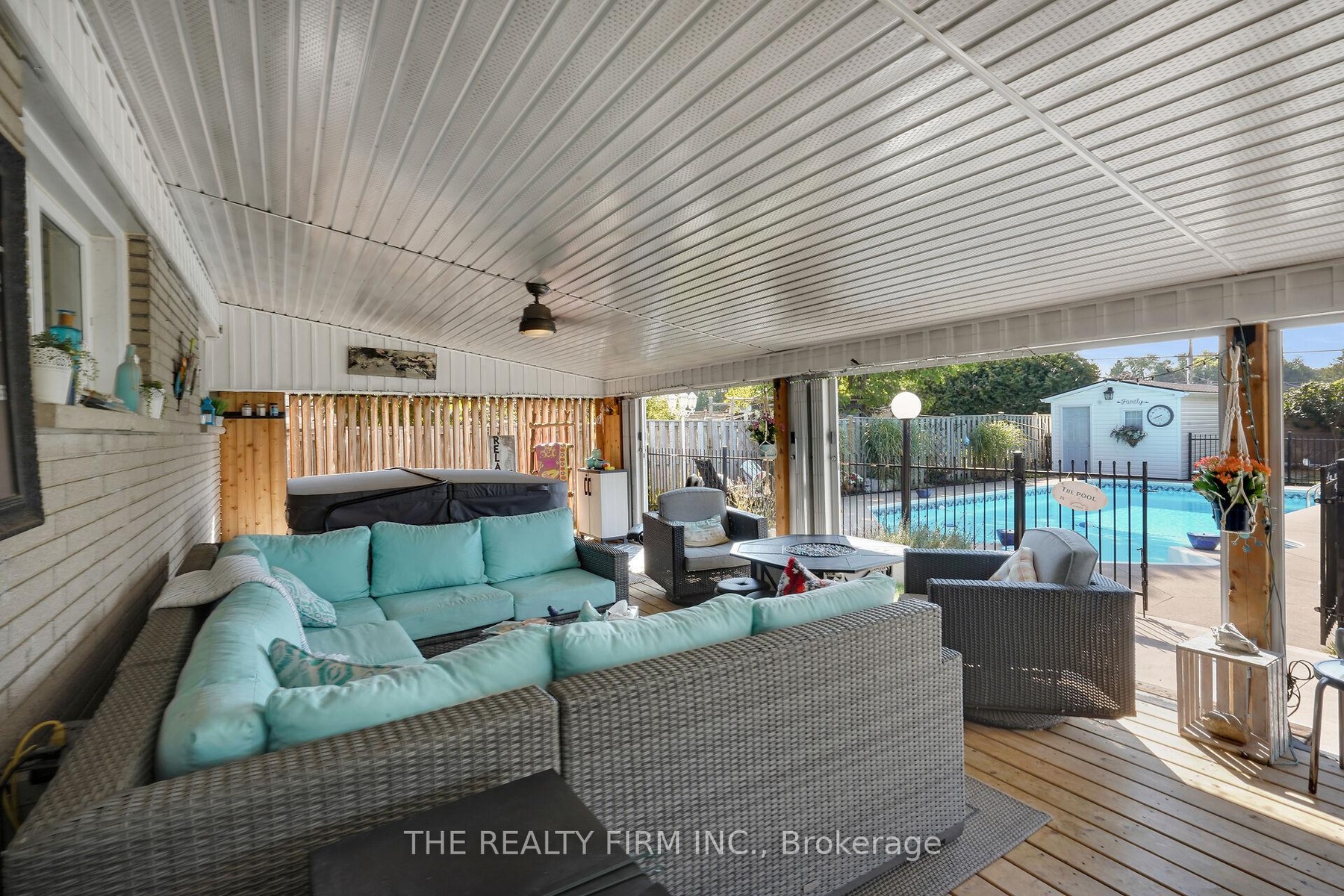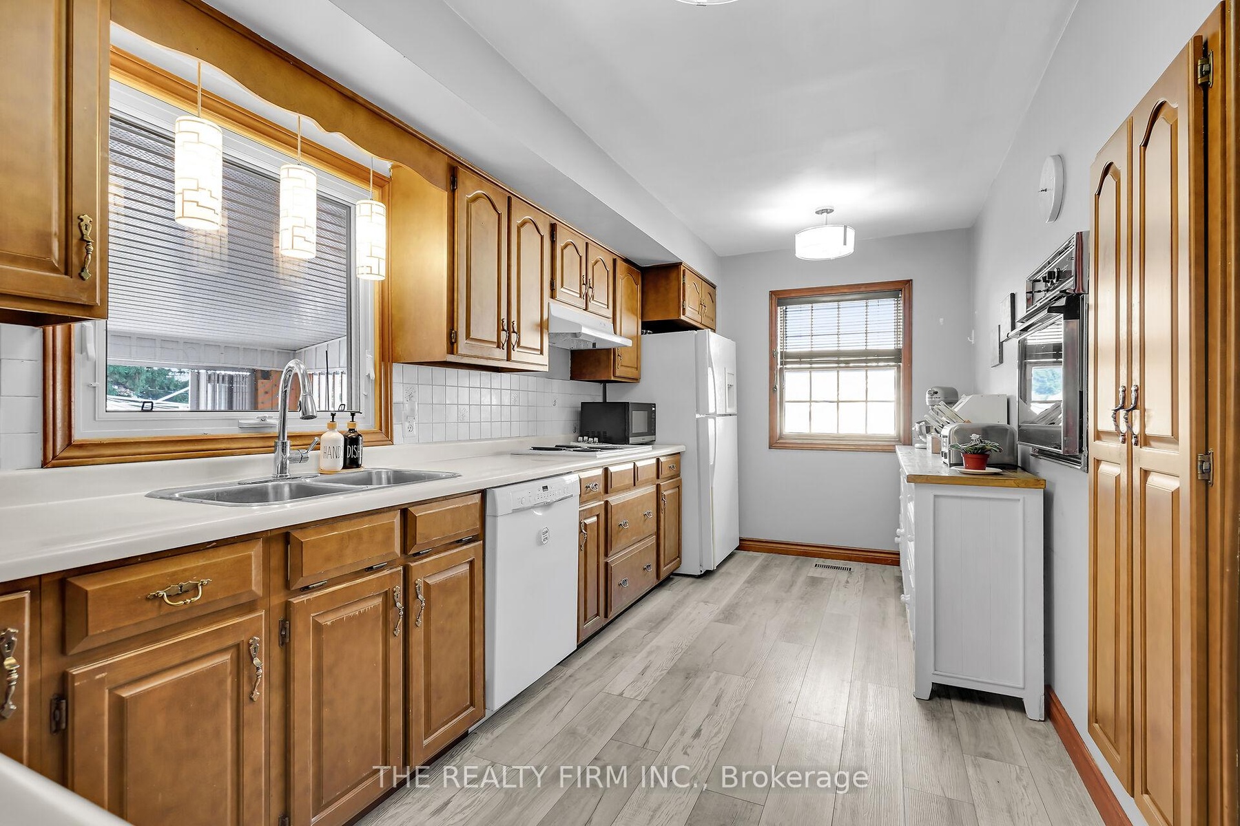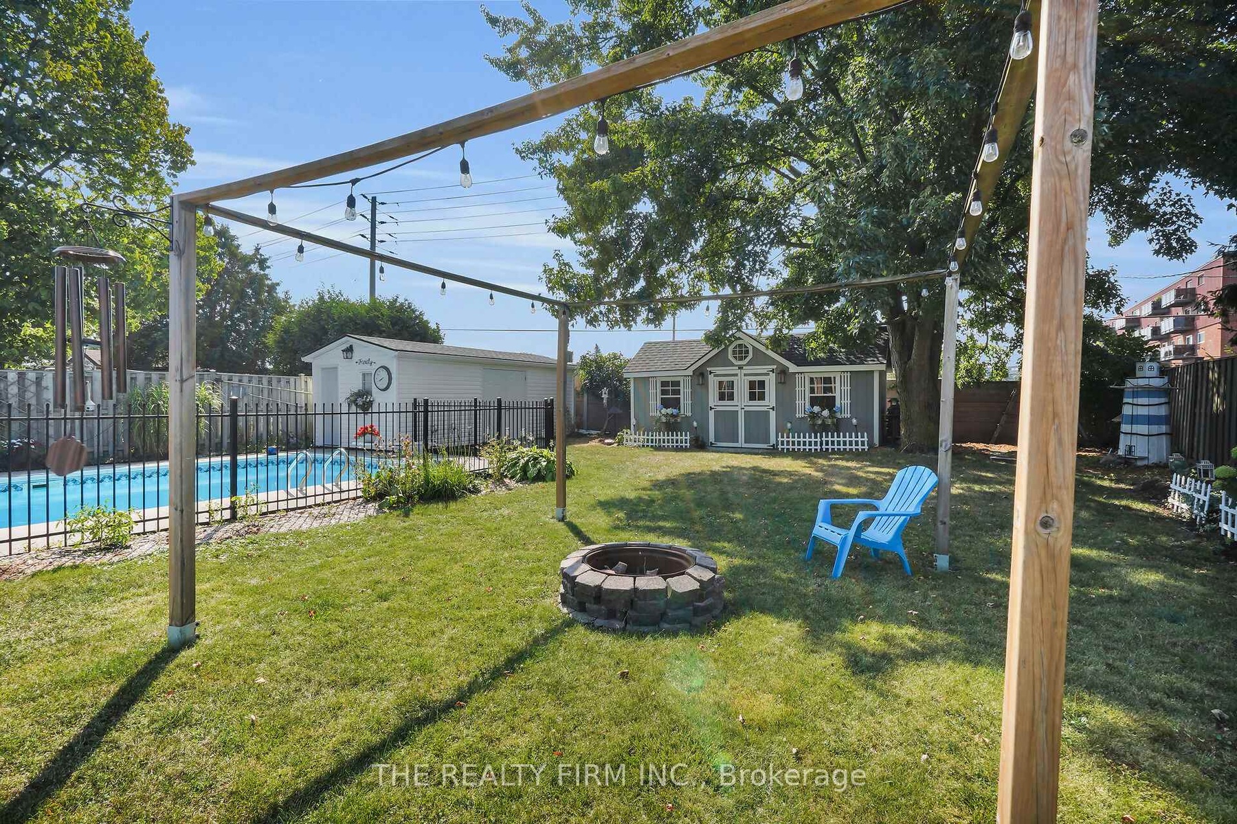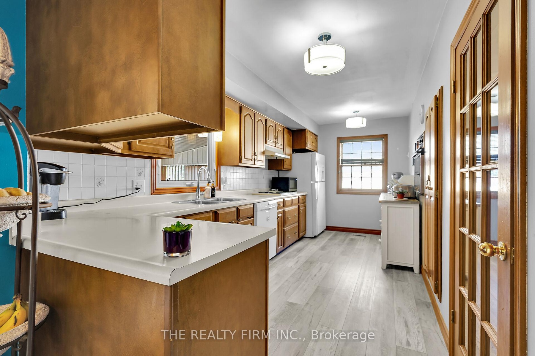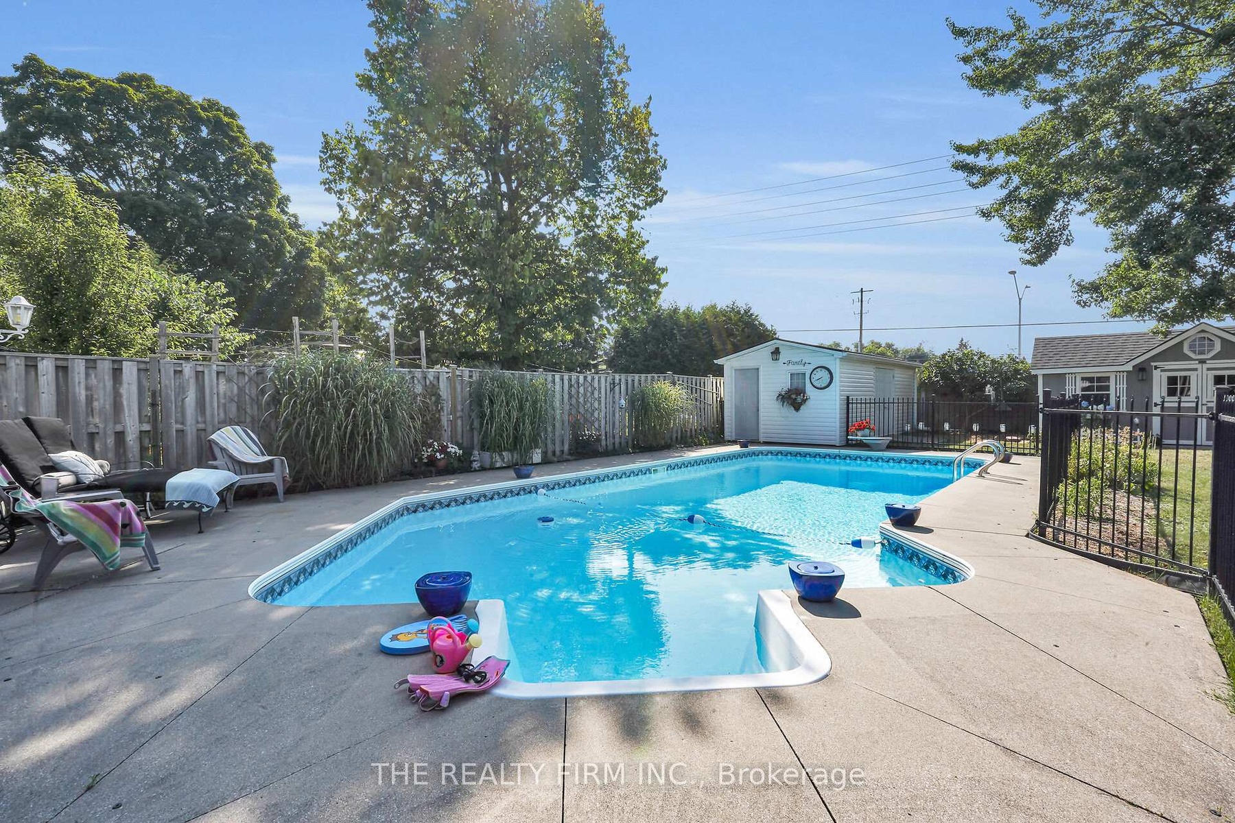 Welcome to this beautifully maintained all-brick one-storey home that blends classic charm with extensive updates for modern living. Situated on a large, private lot with a fenced-in pool, this property is perfect for families or anyone who enjoys both comfort and entertaining. The home offers three bedrooms, two full bathrooms, and a spacious single garage, along with thoughtful upgrades inside and out. Step into the inviting living room, where a wood-burning fireplace creates a cozy focal point, complemented by California shutters and durable water-repellent, non- slip flooring installed in 2013. The bright and expansive galley kitchen features plenty of cabinetry, 2021 dishwasher, and a 2013 patio door with built-in blinds that opens to a 3-season sunroom overlooking the pool. Hardwood floors in the bedrooms add warmth and character, while the fully renovated main-floor bathroom provides a modern touch.The finished lower level includes a large rec room, second full bath, and convenient laundry area with washer and dryer. With carpeting and underlay updated in 2007, this versatile space is ideal for family gatherings, a playroom, or a home office. One of the homes standout features is the impressive three-season sunroom, rebuilt with glass bifold doors in 2022, offering more than 40 feet of space for relaxation and entertaining. Outside, the backyard is a private oasis with a 10-foot deep in-ground bromine pool, featuring a safety cover, heater, liner (2017), pump (2015), and brand-new sand filter (2025). Concrete walkways (2019, 2022), custom railings, and a side security entrance enhance both curb appeal and function. Major mechanicals and updates provide peace of mind, including furnace and humidifier (2020), central air (2022), garage door opener (2021), and 40-year shingles. With neutral décor, a large yard, and proximity to highways, hospitals, and amenities, this home is move-in ready and offers a rare combination of indoor comfort and outdoor enjoyment.