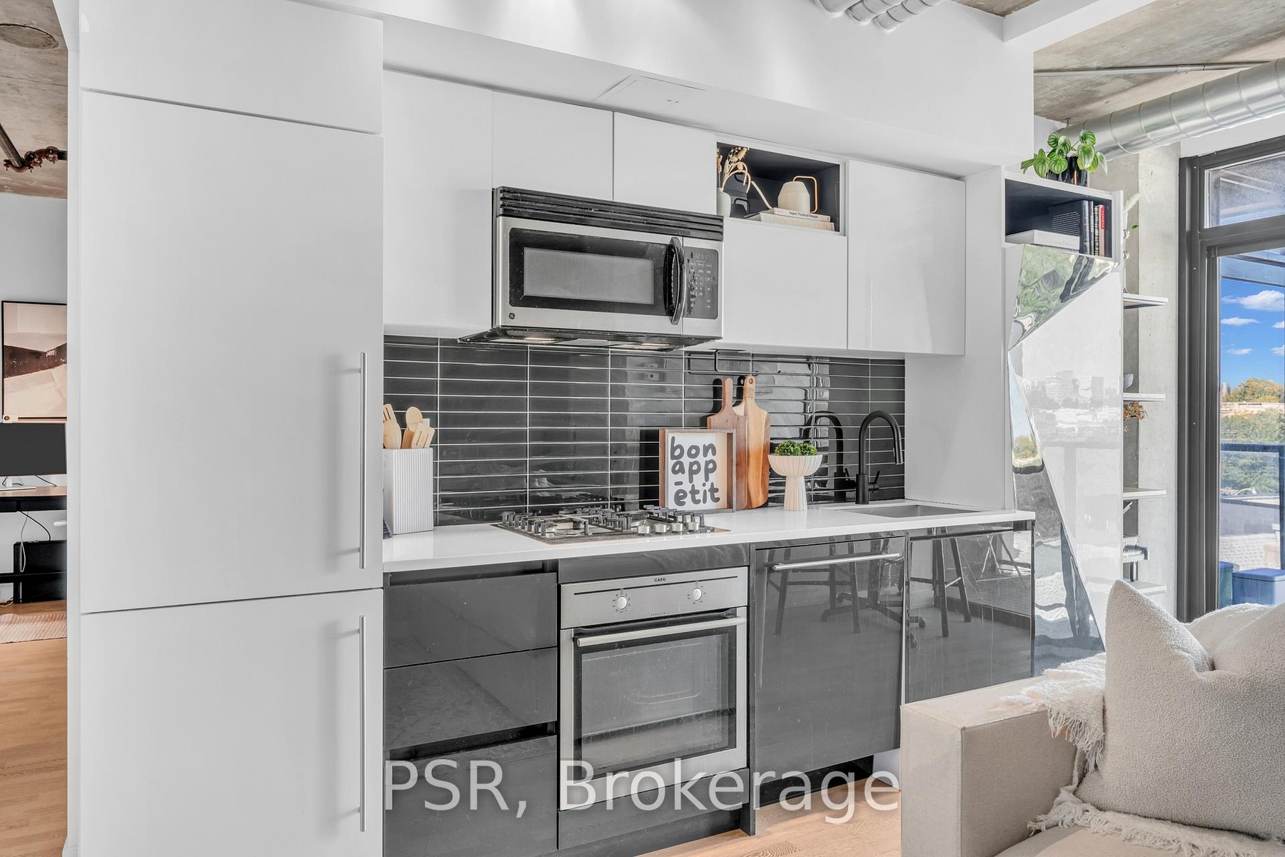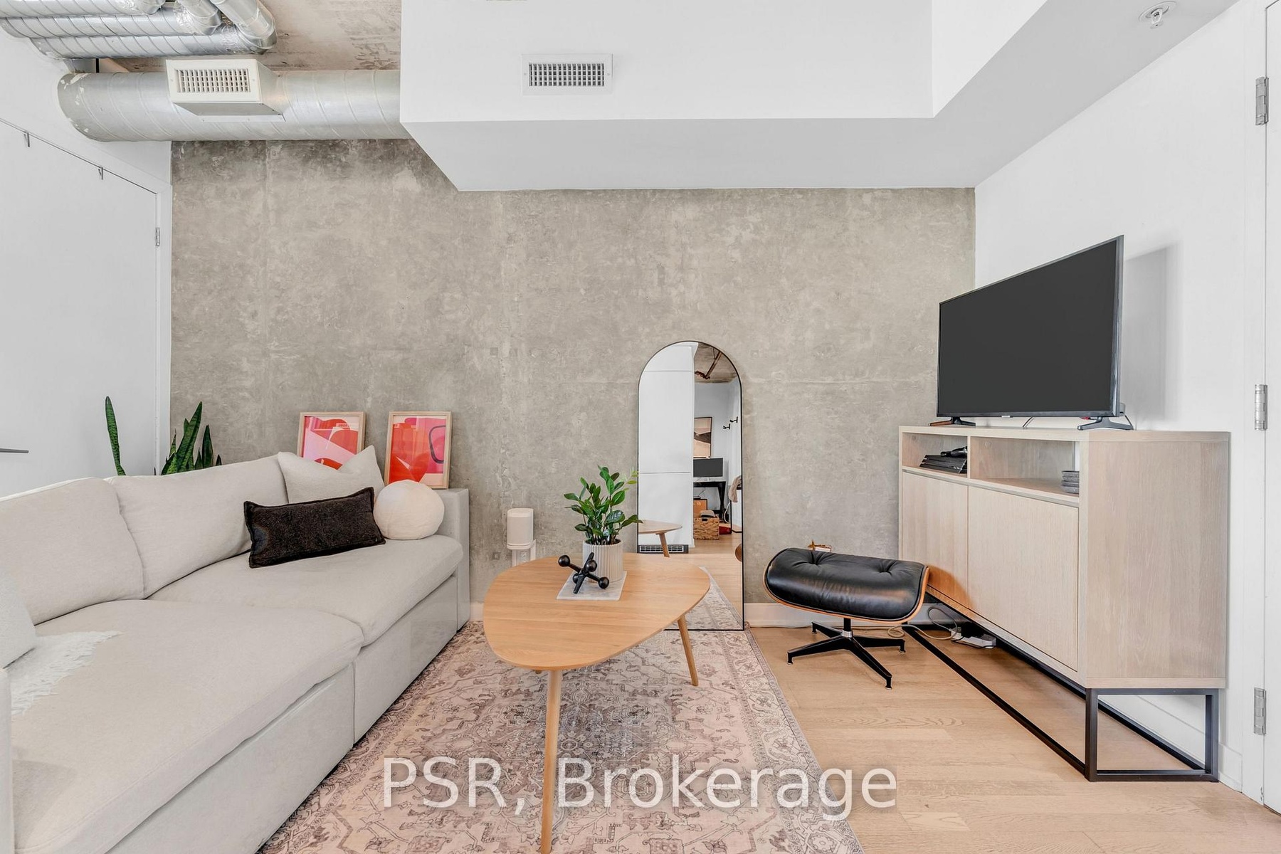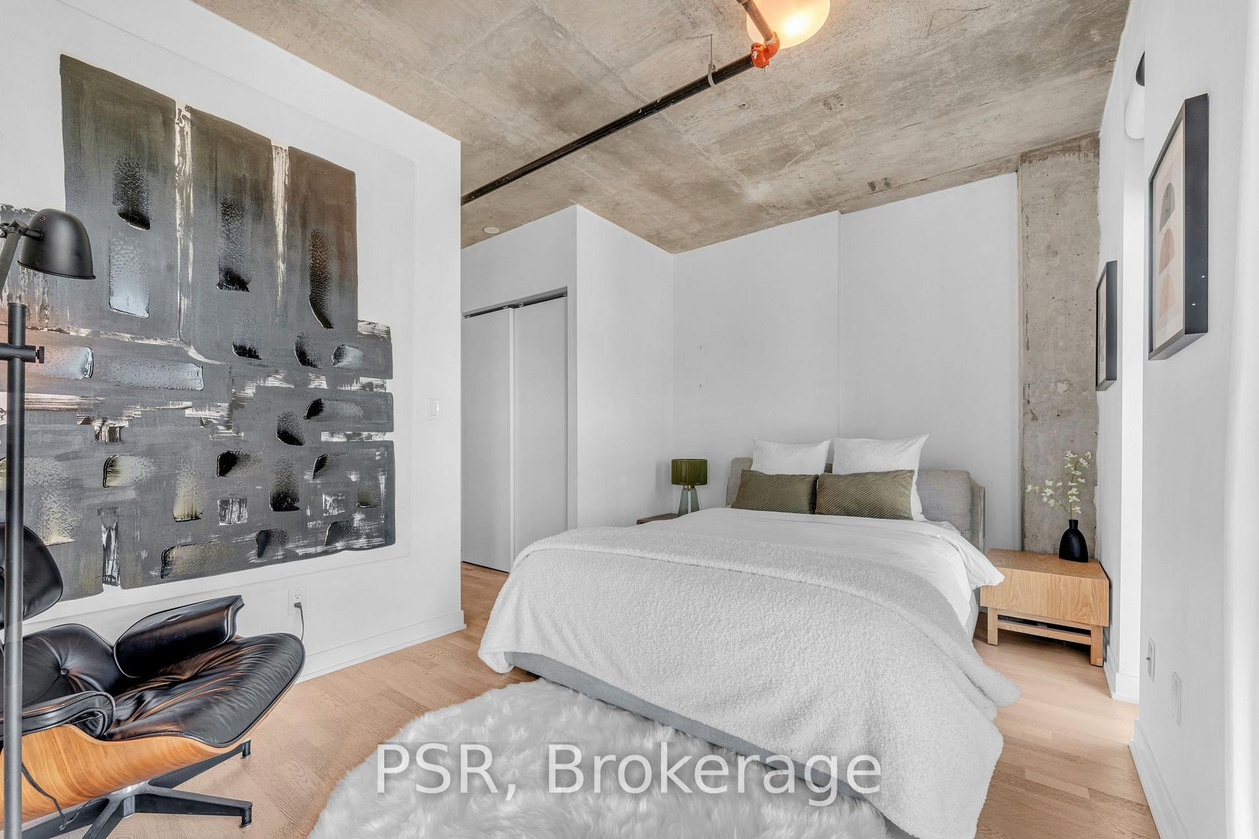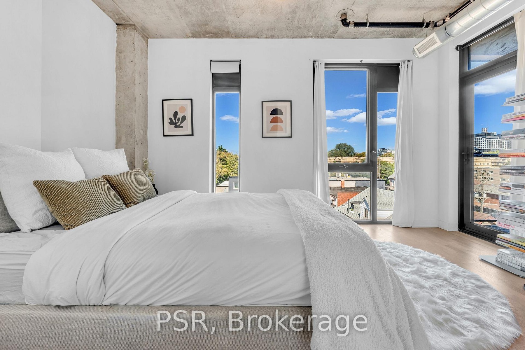 Welcome to 109 Wolseley #502. A rare opportunity to own in one of Toronto's most intimate boutique loft residences only 23 units. Built in 2017, just steps from Trinity Bellwoods and Queen West. This 1-bedroom + true den (yes, it actually fits a guest nook or proper home office!) offers 600 sq. ft. of interior space with soaring 9 ft ceilings, exposed concrete, and a sunlit east-facing city skyline view that will never be obstructed. The large primary bedroom comes with full-height windows and the open living space flows seamlessly onto your private 50 sq. ft. balcony complete with a gas BBQ hook-up for those epic summer nights. This boutique soft loft checks every box: thoughtful layout with a versatile den, gas BBQs permitted on balconies (rare find!), perfectly positioned between Queen West's Buzz and Trinity Bellwoods Greenery.