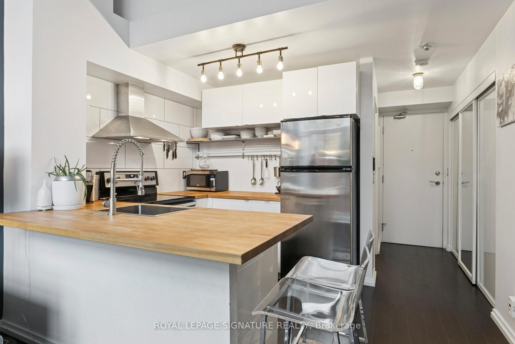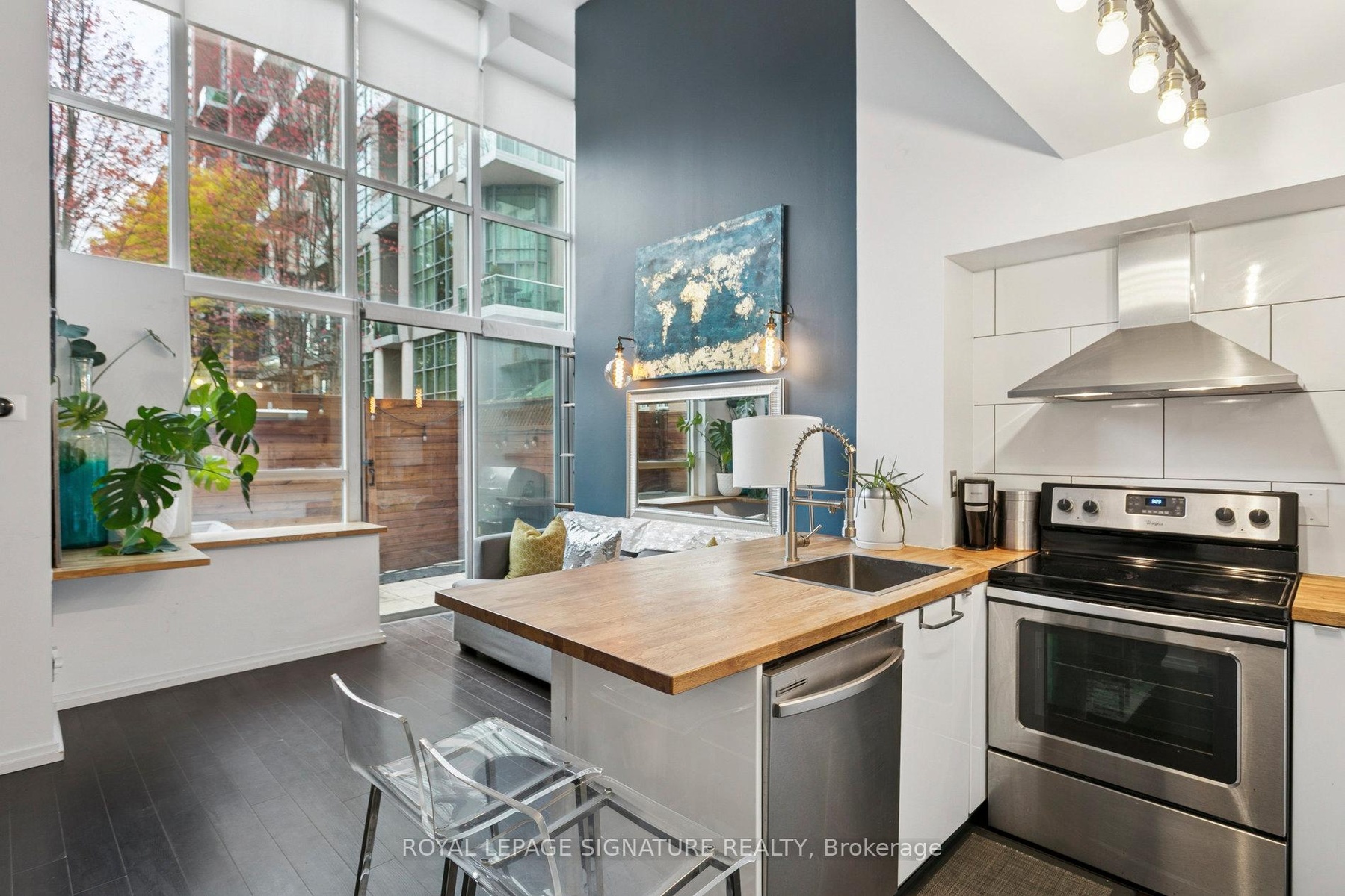 Experience the perfect blend of style and comfort in this stunning main-floor loft, where modern design meets open-concept living. Soaring double-height ceilings and oversized windows flood the space with natural light, creating an airy, contemporary feel from the moment you walk in. The sleek kitchen features solid wood butcher-block countertops - beautiful, durable, and practical. With generous workspace that flows effortlessly into the open-concept living area, you can prep, cook, and entertain all at once - easily and without missing a beat. Step outside to your private back patio - a rare find in condo living. Enjoy morning coffee, unwind in the evening, or fire up the BBQ (permitted on this level) - perfect for summer nights and gatherings with friends. Upstairs, the lofted bedroom offers just the right amount of space for a roomy, comfortable retreat with thoughtful storage. The modern bath and in-suite laundry add everyday convenience, while the unit's fresh, updated finishes make it truly move-in ready. Located in a boutique building close to cafes, parks, transit, and downtown - this is urban living redefined.