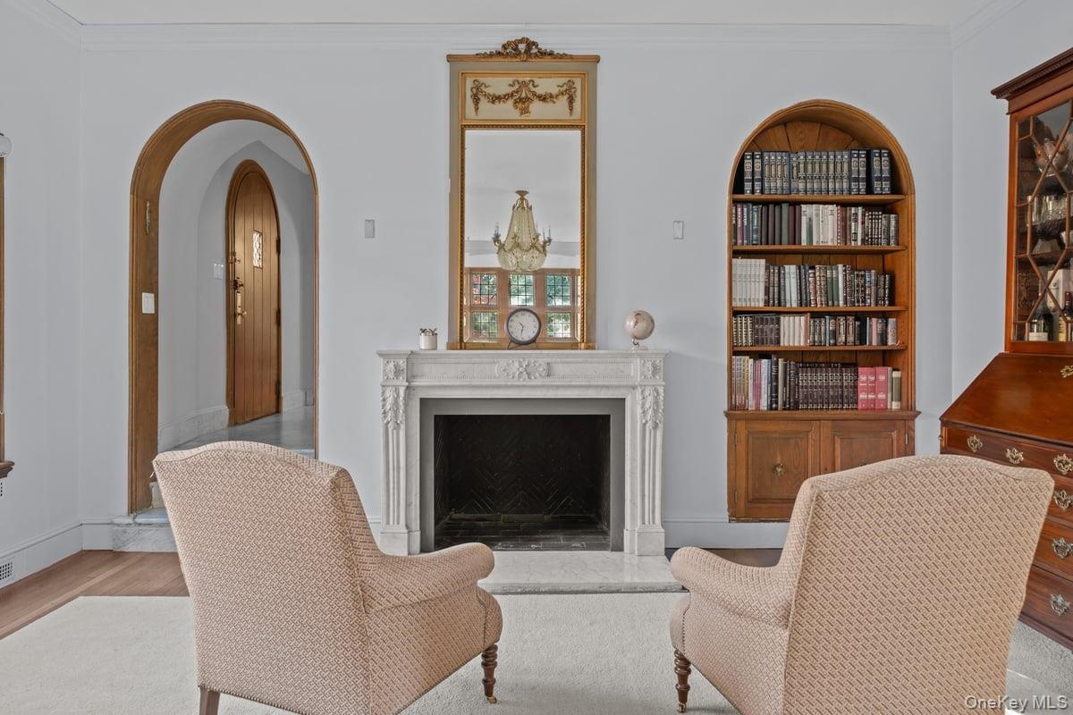 The home features a gracious center hall layout; a spacious living room with a wood-burning fireplace; formal dining room; renovated kitchen; luxuriously renovated bathrooms with floor-to-ceiling marble; and a den with a beamed ceiling. Arched doorways enhance the home’s old-world charm, with a bright and functional home office, in addition to the seven bedrooms, and a walk-in finished basement provide versatility for modern living.