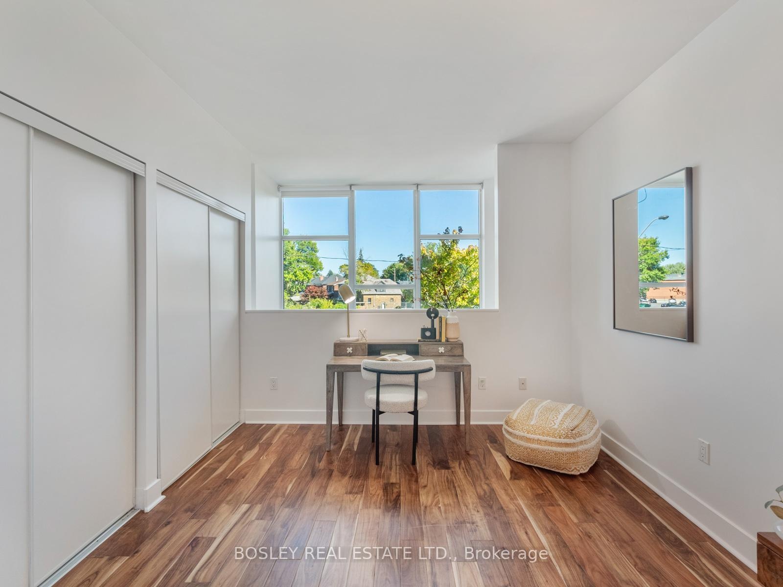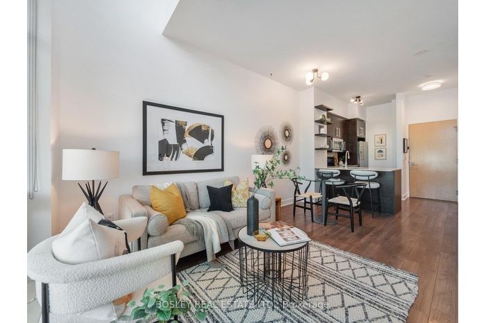 Townhouse-style living meets condo convenience in this spacious 1 bedroom + den, 2 bathroom end unit at 1048 Broadview Ave. With nearly 800 sq ft, soaring 20' ceilings, and dramatic two-storey windows, the space feels bright and airy. The main level offers an open-concept living/dining area, kitchen with breakfast bar, convenient powder room, and rare dual entrances with direct street access or through the building. Upstairs, the bedroom features double closets, a renovated ensuite bath, and an open den perfect for a home office. Freshly painted with plenty of bonus storage throughout, plus parking and locker included. Steps to groceries, TTC, and the many shops and restaurants along The Danforth.