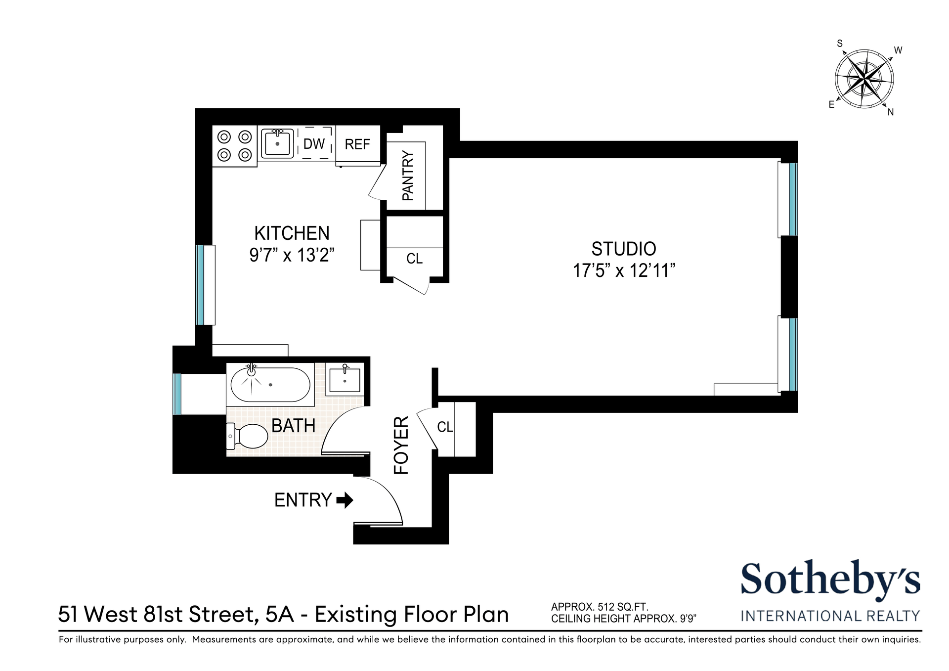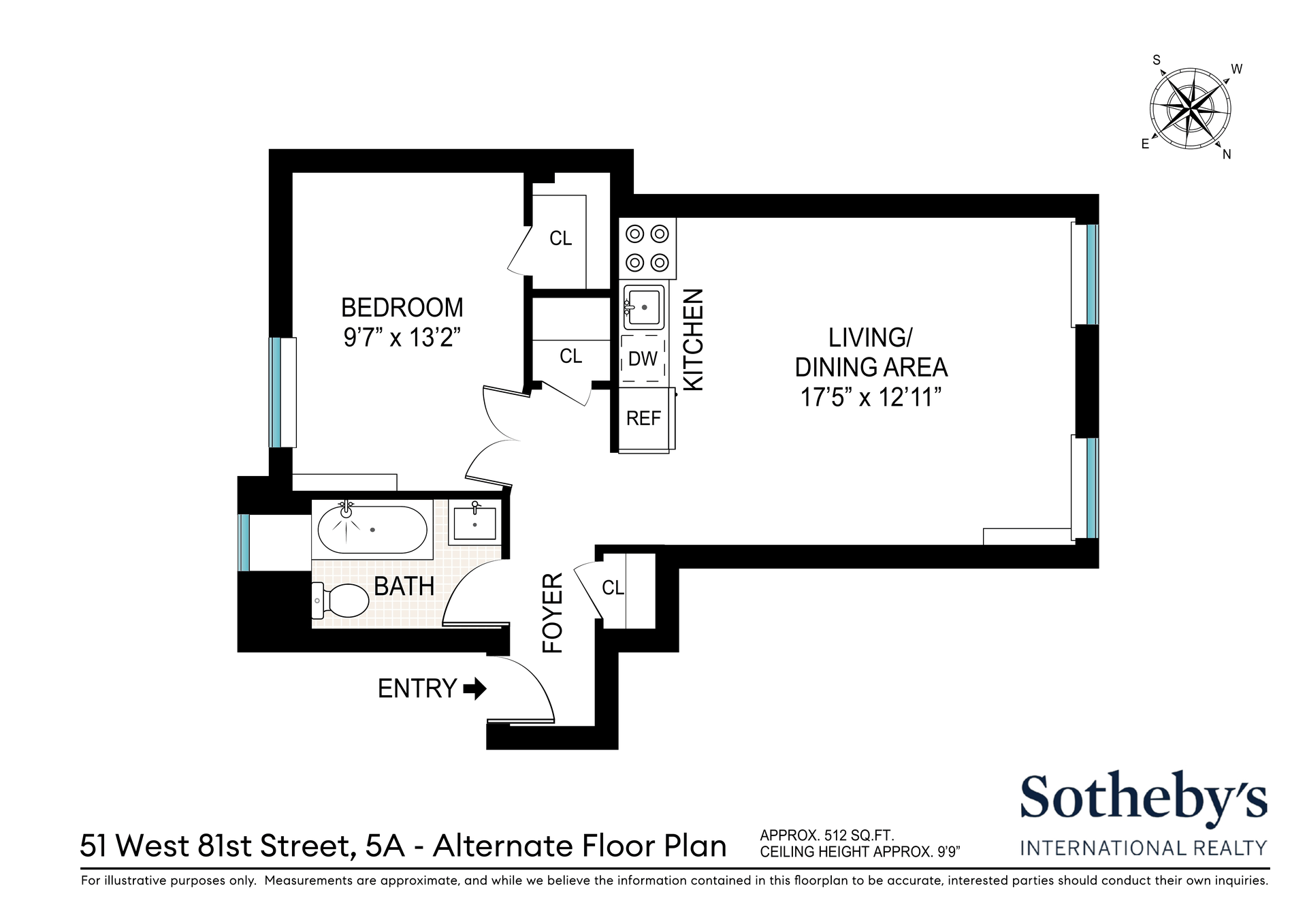Possibly the most gracious, well-located studio on the Upper West Side! Apartment 5A is a flexibly configured studio/one bedroom apartment in The Galaxy with approximately 512 square feet of old-world charm and all the modern conveniences. The Galaxy, an elegant 14-story co-op at 81st Street and Columbus Avenue, overlooks the Hayden Planetarium and the Museum of Natural History with its beautiful grassy park and weekly farmers’ markets. Currently used as an extremely spacious studio with windows facing west onto Columbus Avenue, Apartment 5A would convert very easily to a comfortable one-bedroom apartment (See Alternate Floor Plan).