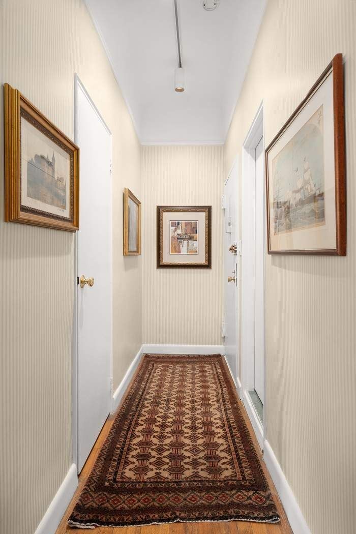 This studio has many features more commonly found in larger apartments: 9 3⁄4’ ceilings; tall windows; a separate windowed kitchen large enough to comfortably accommodate a proper dining table and chairs; and a gracious entry hallway leading from the front door to the living space with a spacious hall closet and a large windowed bath on either side of the hallway. The living space benefits from hardwood floors and an easy-to-operate and very comfortable Murphy bed which would transfer with the apartment.