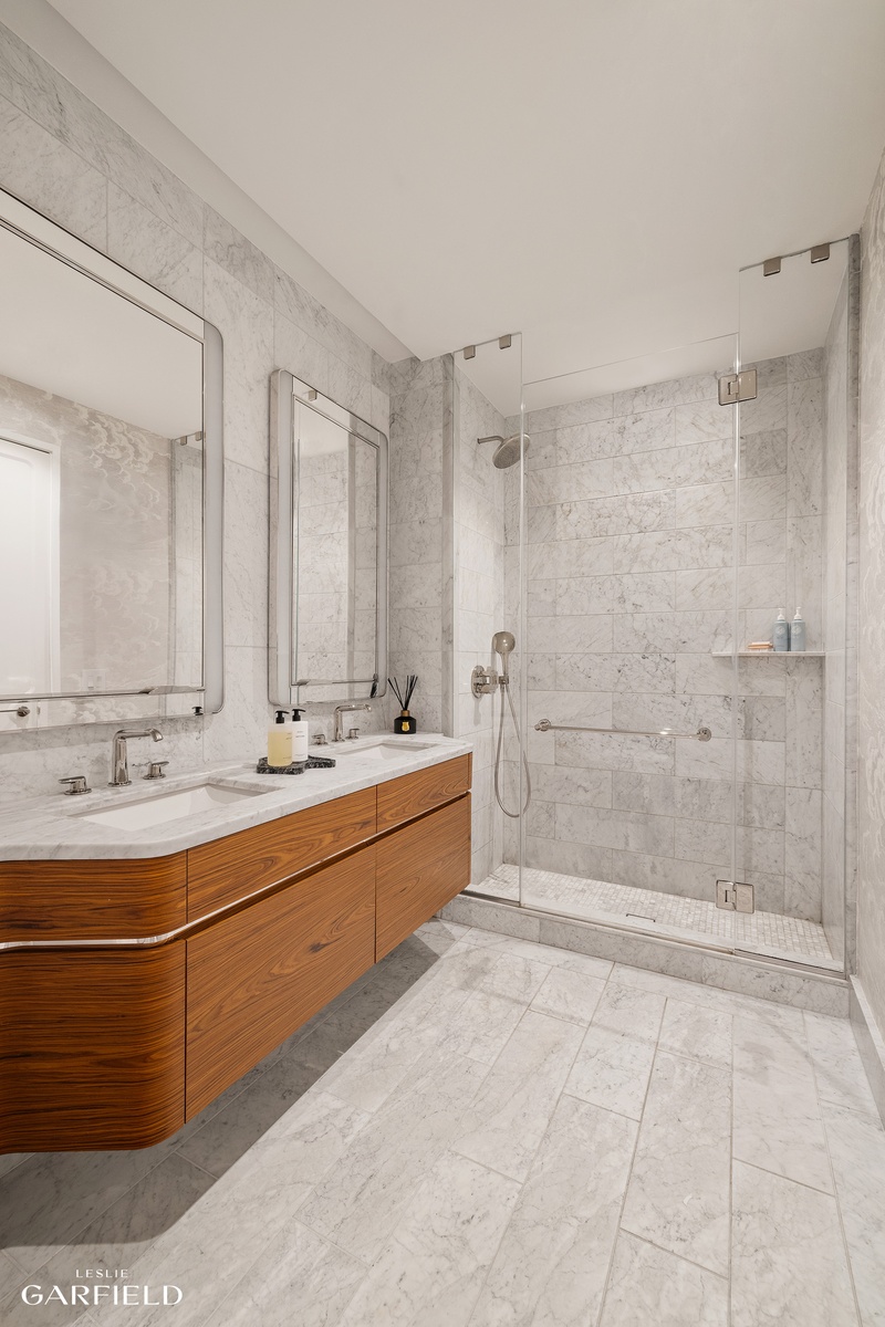 The custom Molteni&C kitchen features integrated Miele appliances, walnut cabinetry with fluted mirror casework, and honed Carrara marble countertops, backsplash, and island. The serene primary suite includes lime?-washed wall?s, custom light fixtures, and a spa-like marble bathroom with an engineered-rosewood vanity and polished nickel fixtures. The second bedroom is perfectly suited for guests, children, ?or a home office?.
