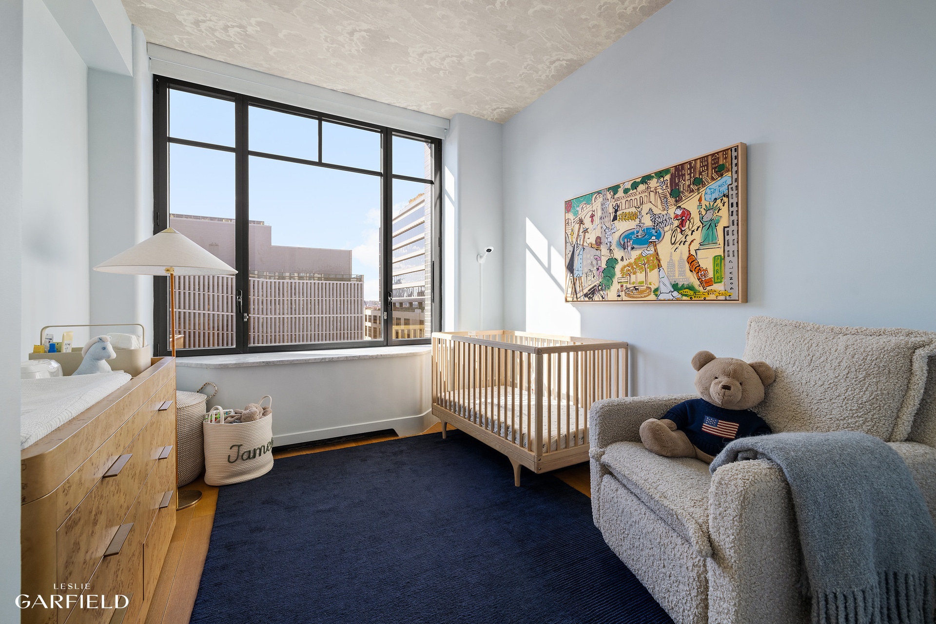 Residents enjoy 24-hour white-glove service, a live-in superintendent, fitness and yoga studios, a children’s playroom, bike storage, a sky lounge, and an expansive rooftop terrace with sweeping views of the Hudson River and Manhattan skyline.