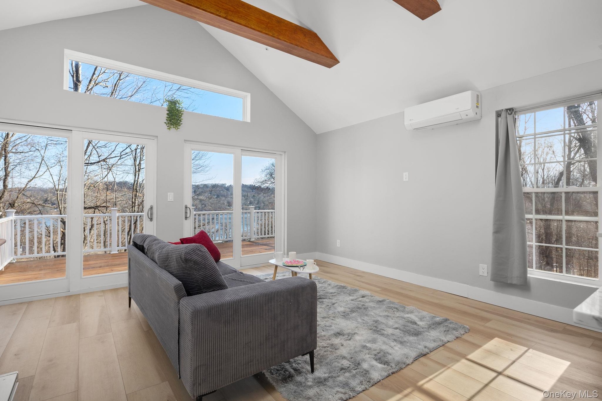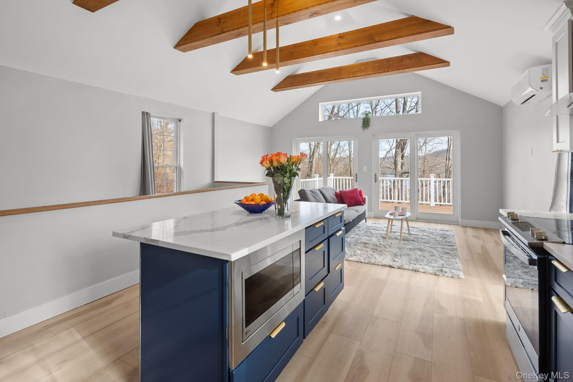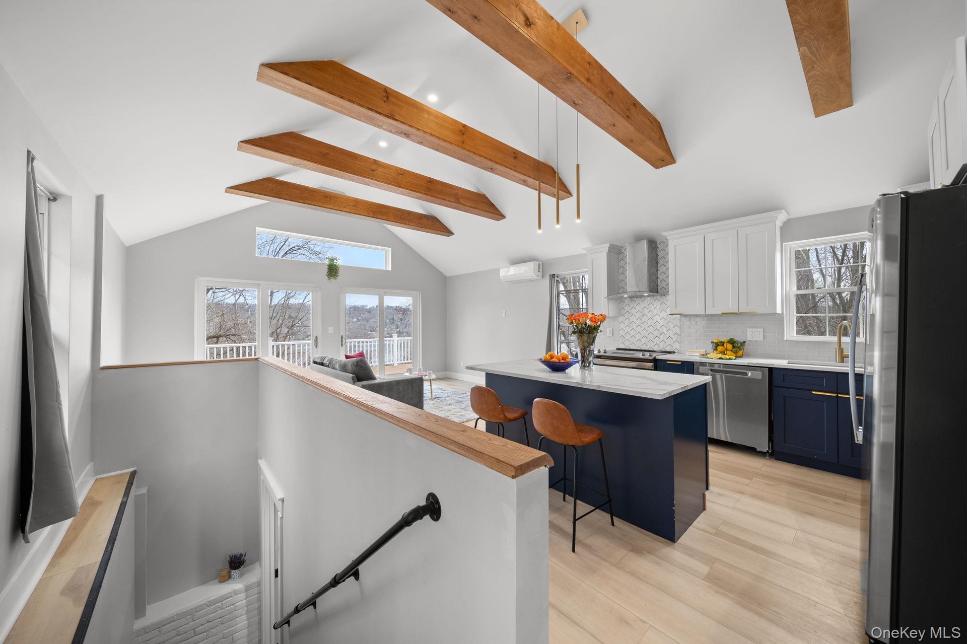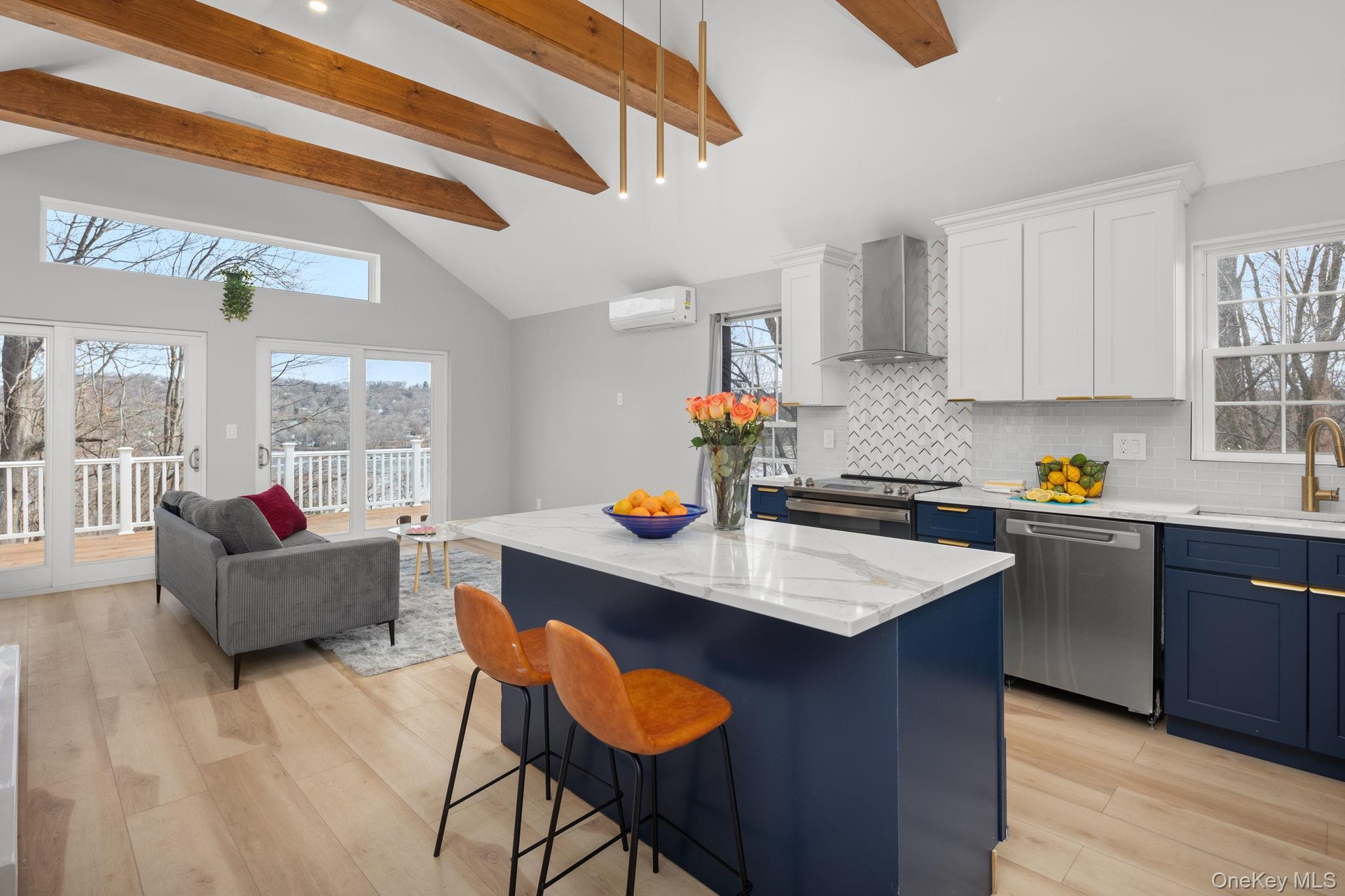 Step inside the inviting open floor plan featuring high beamed ceilings, new flooring, and large glass sliders framing serene lake views. The renovated kitchen shines with stainless steel appliances, crisp white and blue cabinetry, subway tile backsplash, and a center island—perfect for cooking and entertaining.